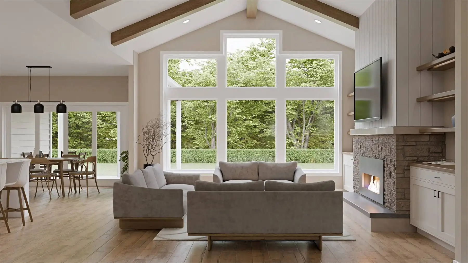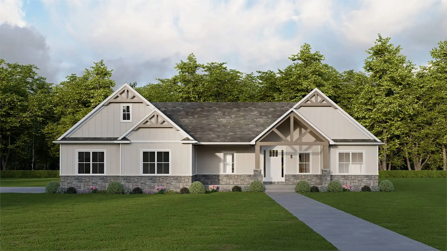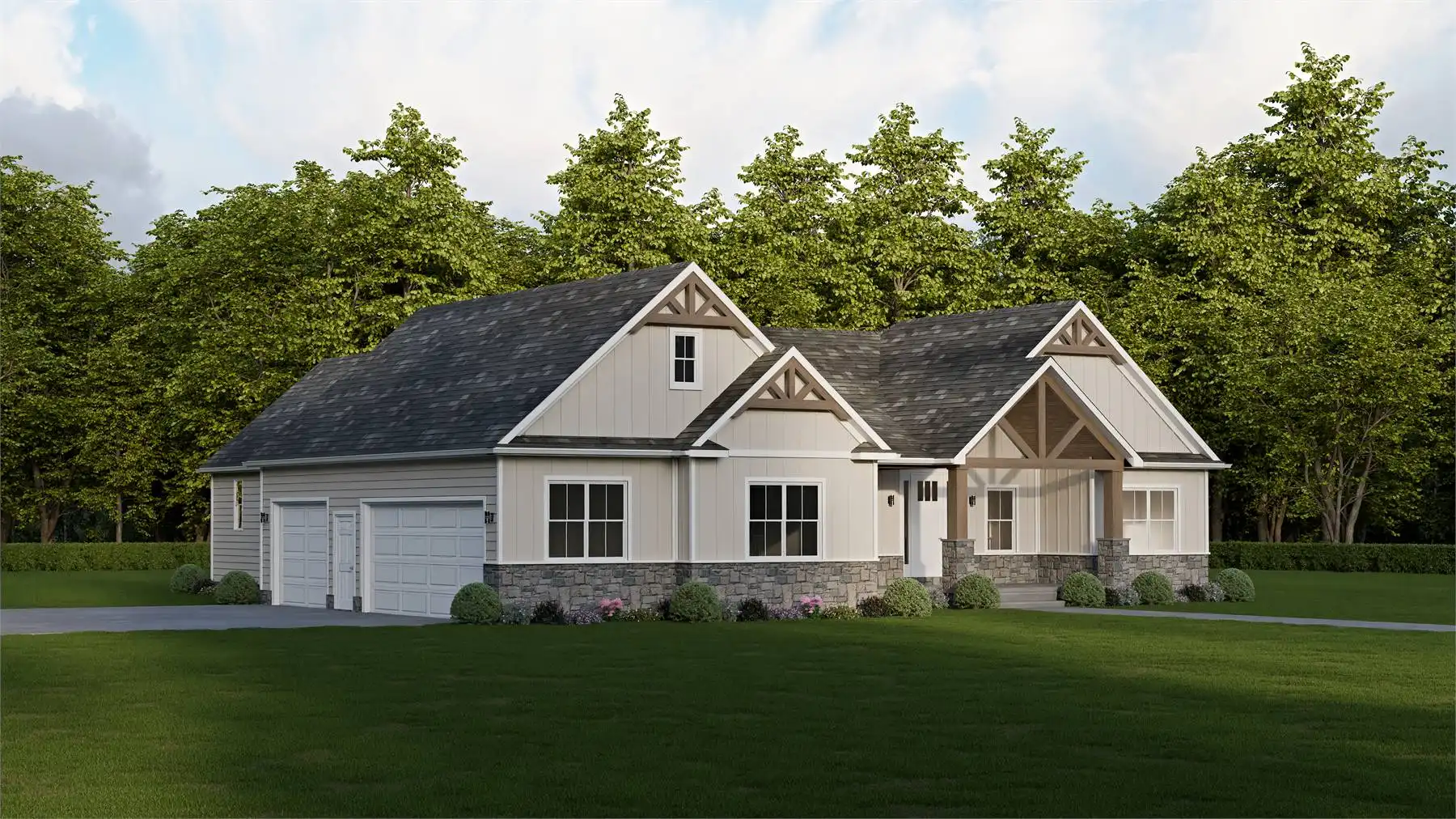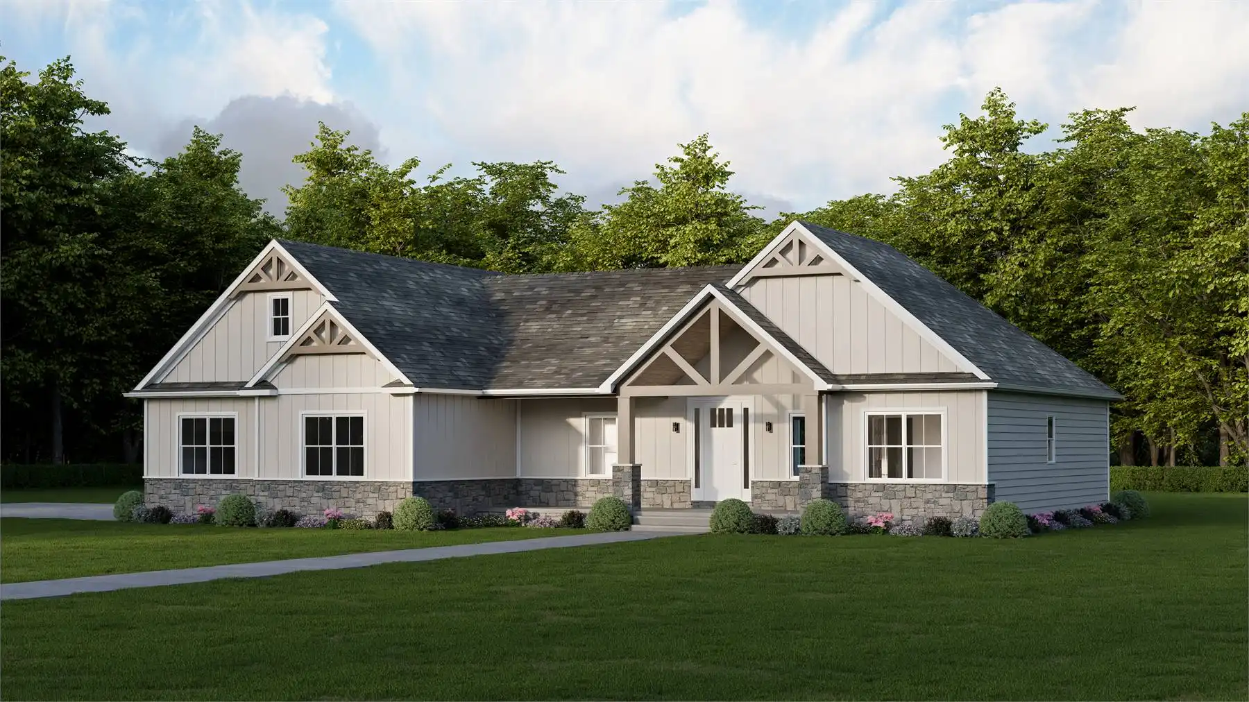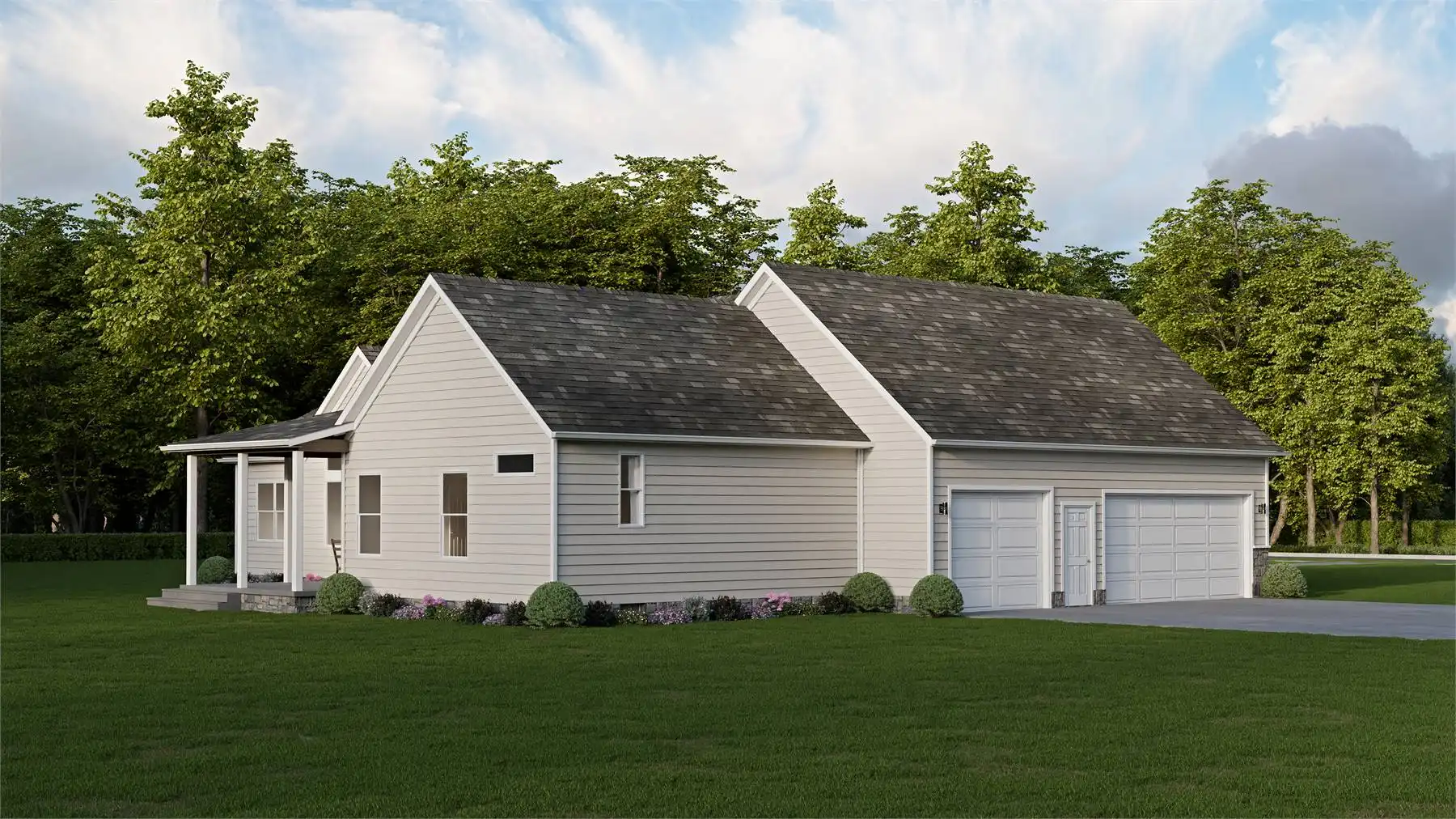 House Plan 10271 is a charming one-story farmhouse with a split-bedroom design for privacy and comfort. The open floor plan features a vaulted great room and kitchen with a large island for seating. The primary suite includes a private ensuite, while two additional bedrooms offer space for family or guests. A spacious laundry room and mudroom add convenience. Outdoor living shines with a wraparound front porch and a large covered rear porch. A two-car garage with a side entry completes this inviting home.