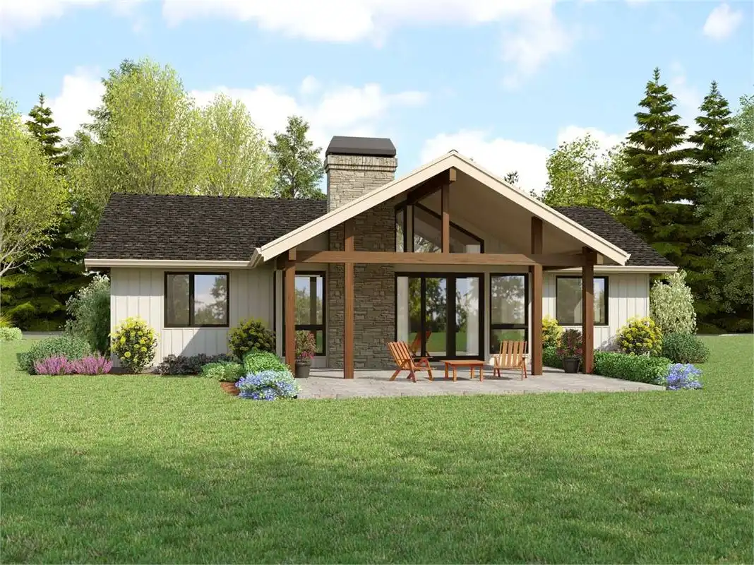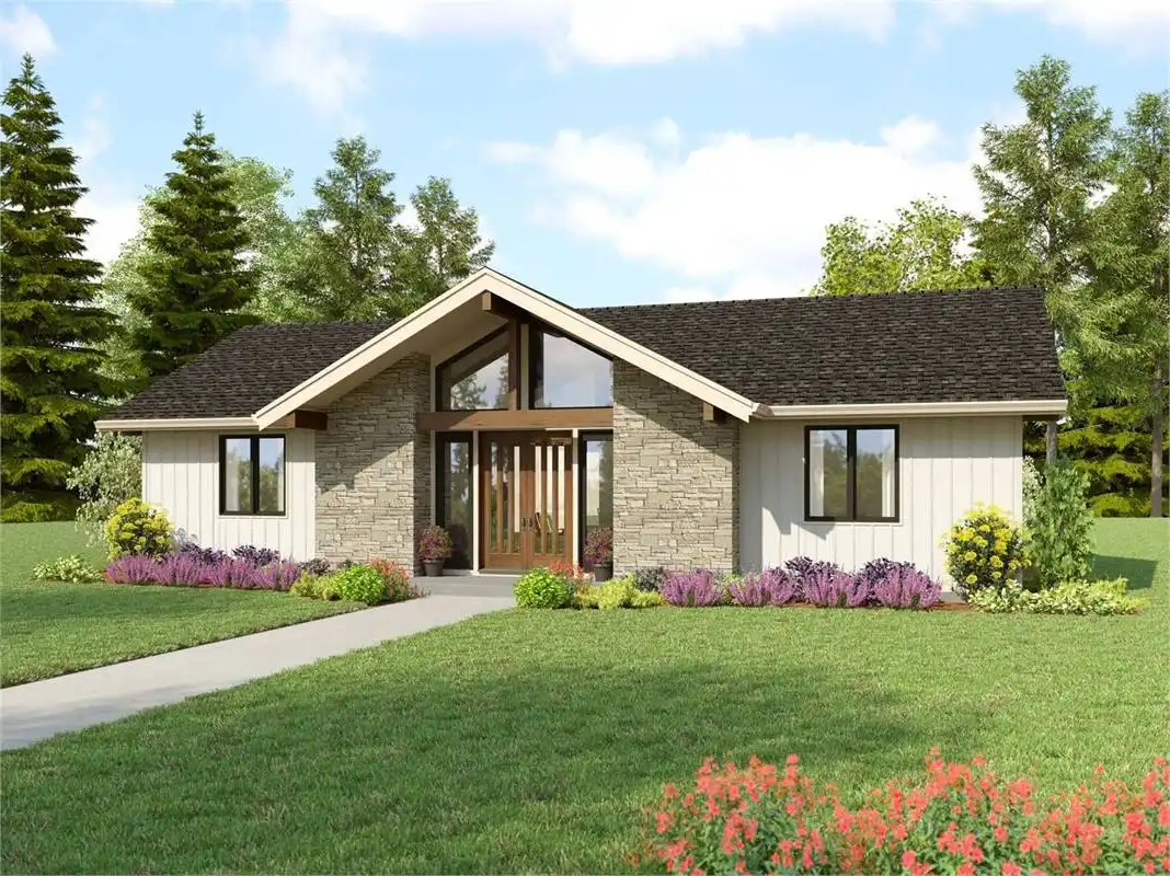 House Plan 10275 is an amazing mid-century modern ranch with 1,664 square feet, three bedrooms, and two bathrooms wrapped up in classic style. The layout places the primary suite and secondary bedrooms at opposite ends of the gallery hallway in front while a vaulted ceiling spans the foyer, open-concept great room, and outdoor living up the center of the floor plan. Talk about drama!