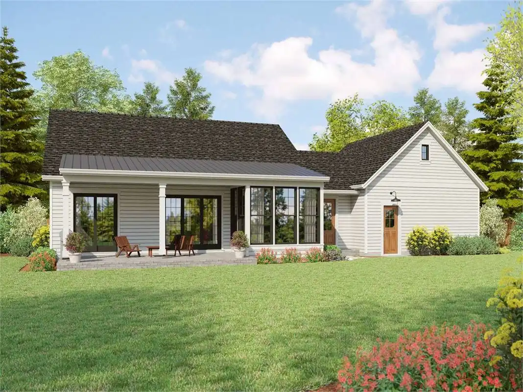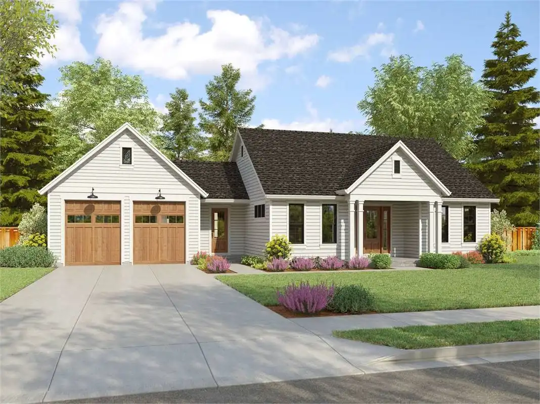 House Plan 10279 is an adorable farmhouse with 1,619 square feet, three bedrooms, and two bathrooms on one level. It also has a garage placed off to the side that connects to the interior through the laundry/mudroom. You'll find the bedrooms and bathrooms spread across a hallway that crosses the foyer while the great room sits at the back, complete with a fireplace, and island kitchen, and the sunny dining nook. Make sure to appreciate all the windows around the whole house!