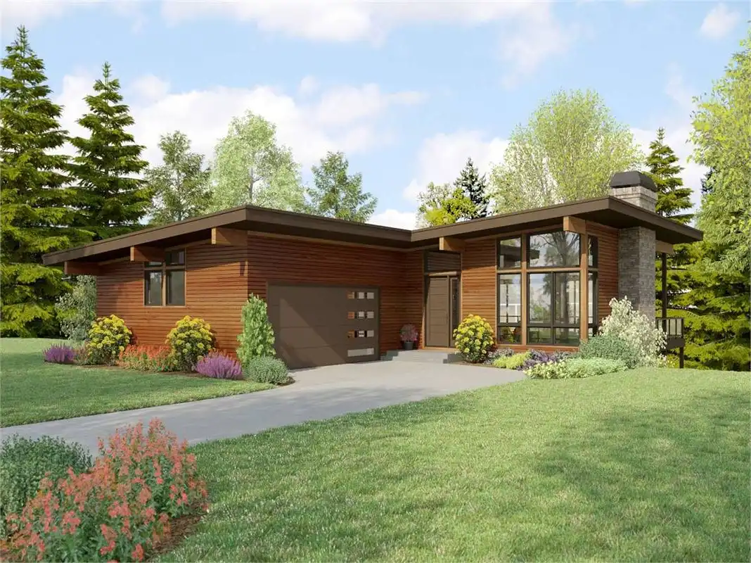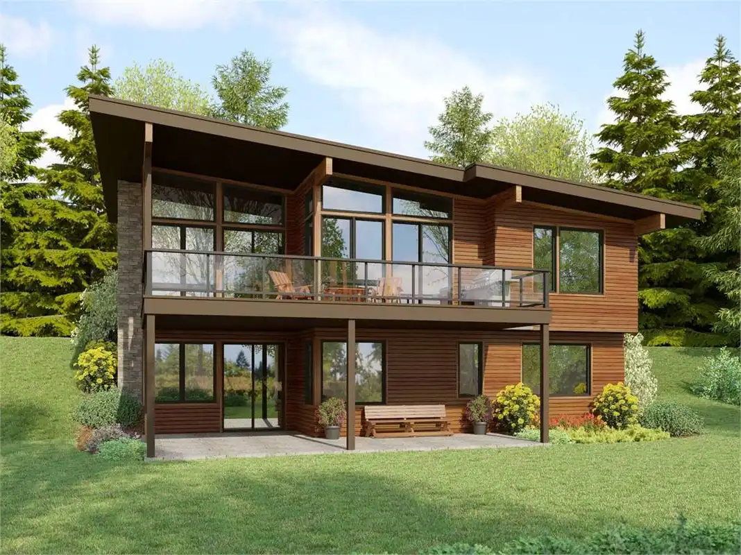 If you've got a sloped lot and modern tastes, give House Plan 10281 a try! This stunning home offers 2,558 square feet, four bedrooms, and three bathrooms in a relatively compact width thanks to its courtyard garage. Step inside and the entire main level sits beneath vaulted ceilings. The open-concept great room has floor-to-ceiling windows, and you'll find two bedrooms--a primary suite and another bedroom beside a hall bath--placed down a hallway for privacy. The other two bedrooms share a hall bath in the basement, where they're placed off of the game room. Again, there's plenty of glass on this level--this home was made for a view lot!