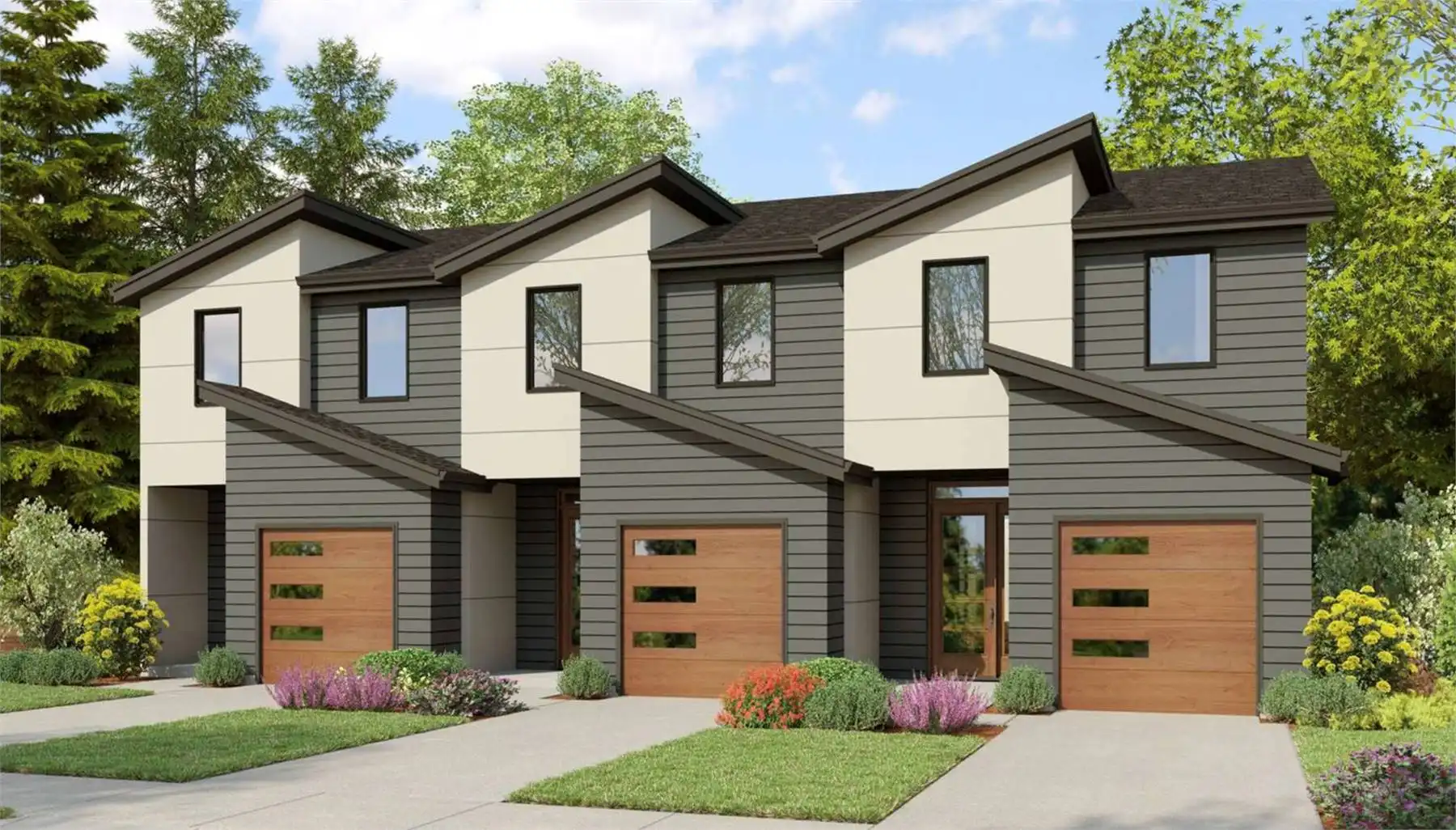 With three units lined up neatly with bold contemporary rooflines above, House Plan 10283 is the perfect multi-family home that balances affordability and curb appeal! Each unit boasts 1,349 square feet with three bedrooms, two-and-a-half bathrooms, and a one-car garage. The main level places the foyer with a powder room beside the garage while the open-concept kitchen, dining, and living areas are in back. All the bedrooms are placed upstairs, with a private primary suite in back and two secondary bedrooms that share the hall bath in front.