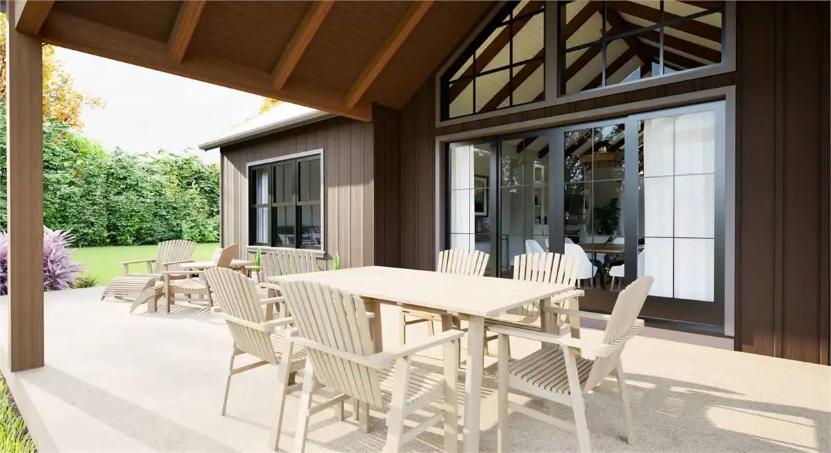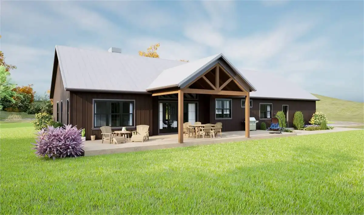 Check out House Plan 10285 if you need a modestly sized barndominium ranch! This lovely design offers 2,310 square feet with three bedrooms and two-and-a-half baths. The layout places the common areas in the middle, with a cathedral ceiling spanning the front porch, living area, dining area, and back porch while the U-shaped island kitchen overlooks from the side. The luxe five-piece primary suite is privately located on one end of the house while the other two bedrooms, a hall bath, and the powder room are across the floor plan. You'll find the laundry/mudroom and access to the three-car garage on this side, too.