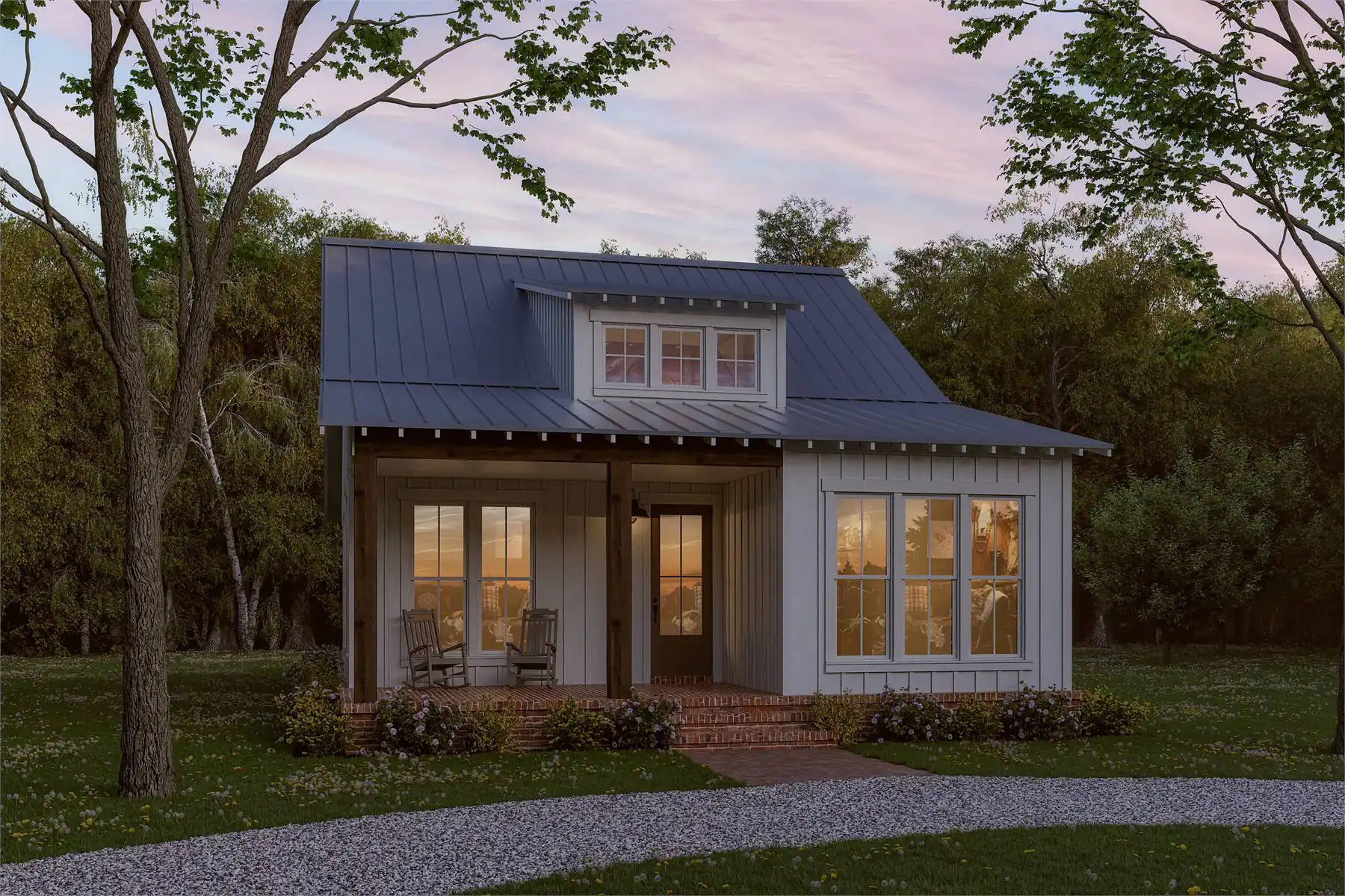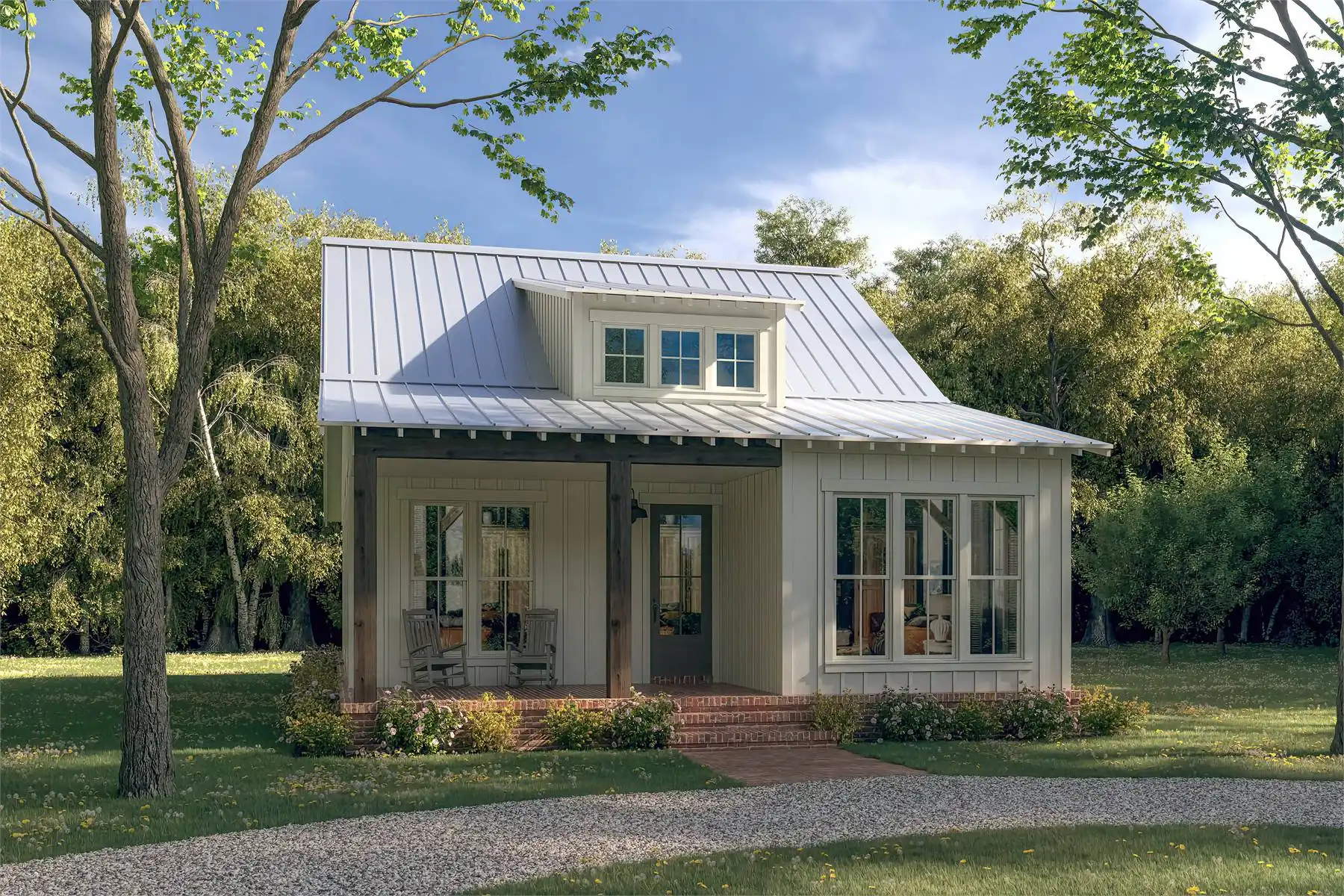 House Plan 10288 is a cute cottage with 1,299 square feet, three bedrooms, and two bathrooms on one story. The layout places the open living areas on one side, with an island kitchen in back and a vaulted ceiling over the living and dining areas in front. The bedrooms are on the other side of the house, split into front and back hallways. The primary suite with a three-piece bath is in the front hallway while the secondary bedrooms are in the back hallway along with a three-piece hall bath to share. The laundry room is accessible from both hallways. Porches in front and back complete this little home to perfection!