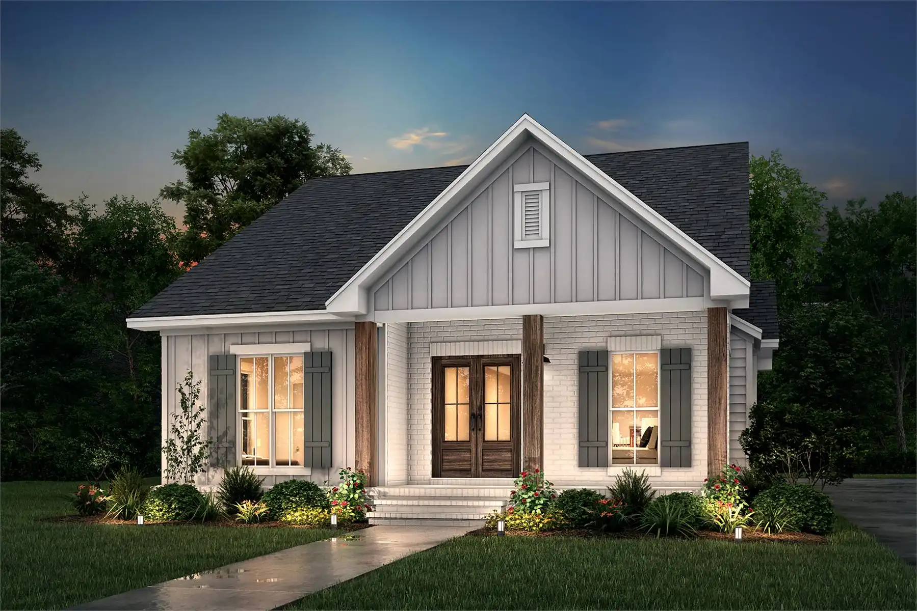House Plan 10294 is a 1,450-square-foot cottage designed for comfort and charm. This 3-bedroom, 2-bath home features an inviting open floor plan, where the great room, dining area, and kitchen come together in a seamless flow—perfect for everyday living and entertaining. A 10-foot tray ceiling and a cozy fireplace add warmth and character to the great room. The kitchen’s large island offers extra seating and prep space, while oversized windows fill the space with natural light. The primary suite is a private retreat, complete with a spa-like bath, dual vanities, and a generous walk-in closet. Two additional bedrooms provide space for family or guests. With charming front and rear porches, this home is designed for relaxed indoor-outdoor living.