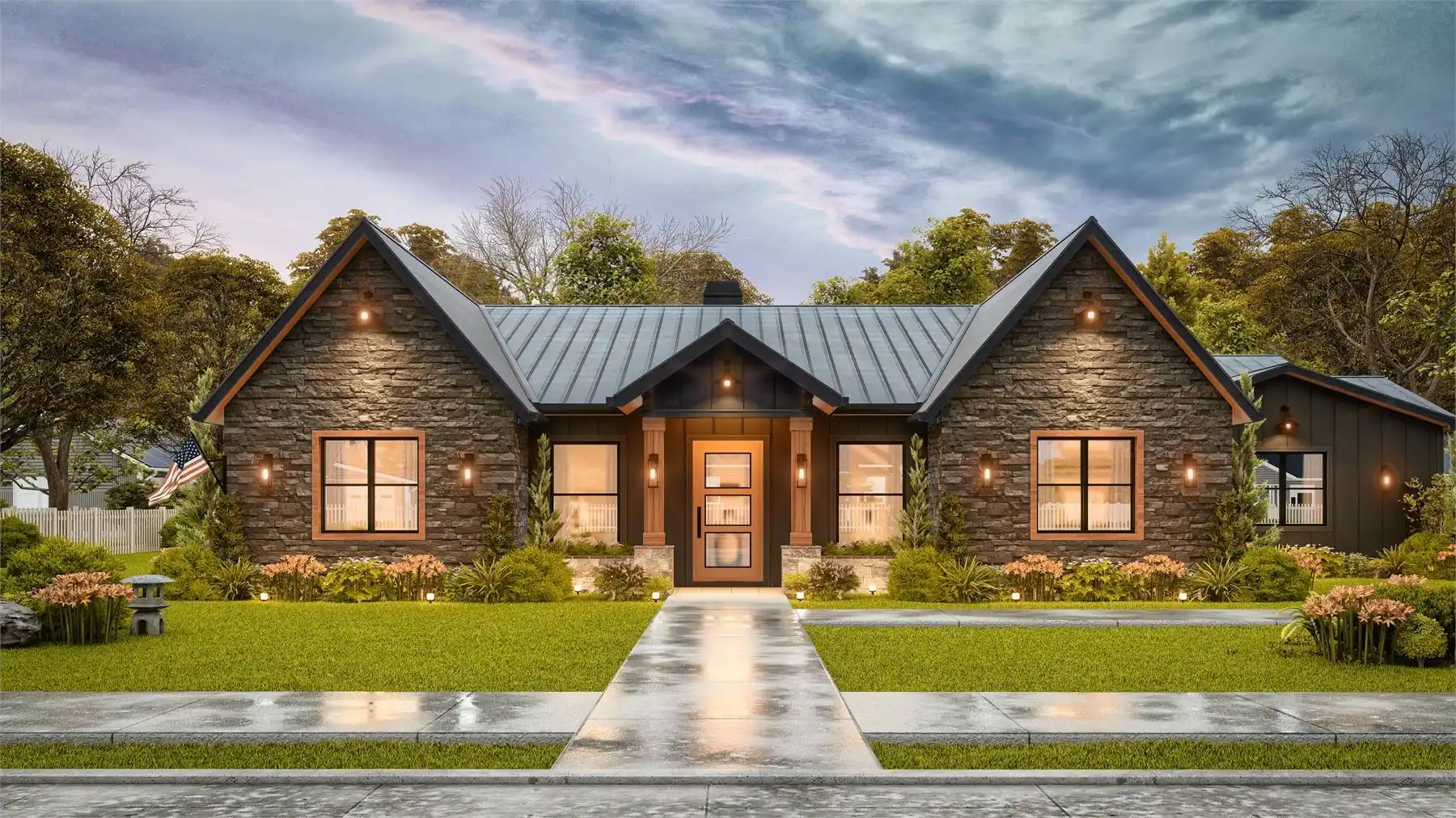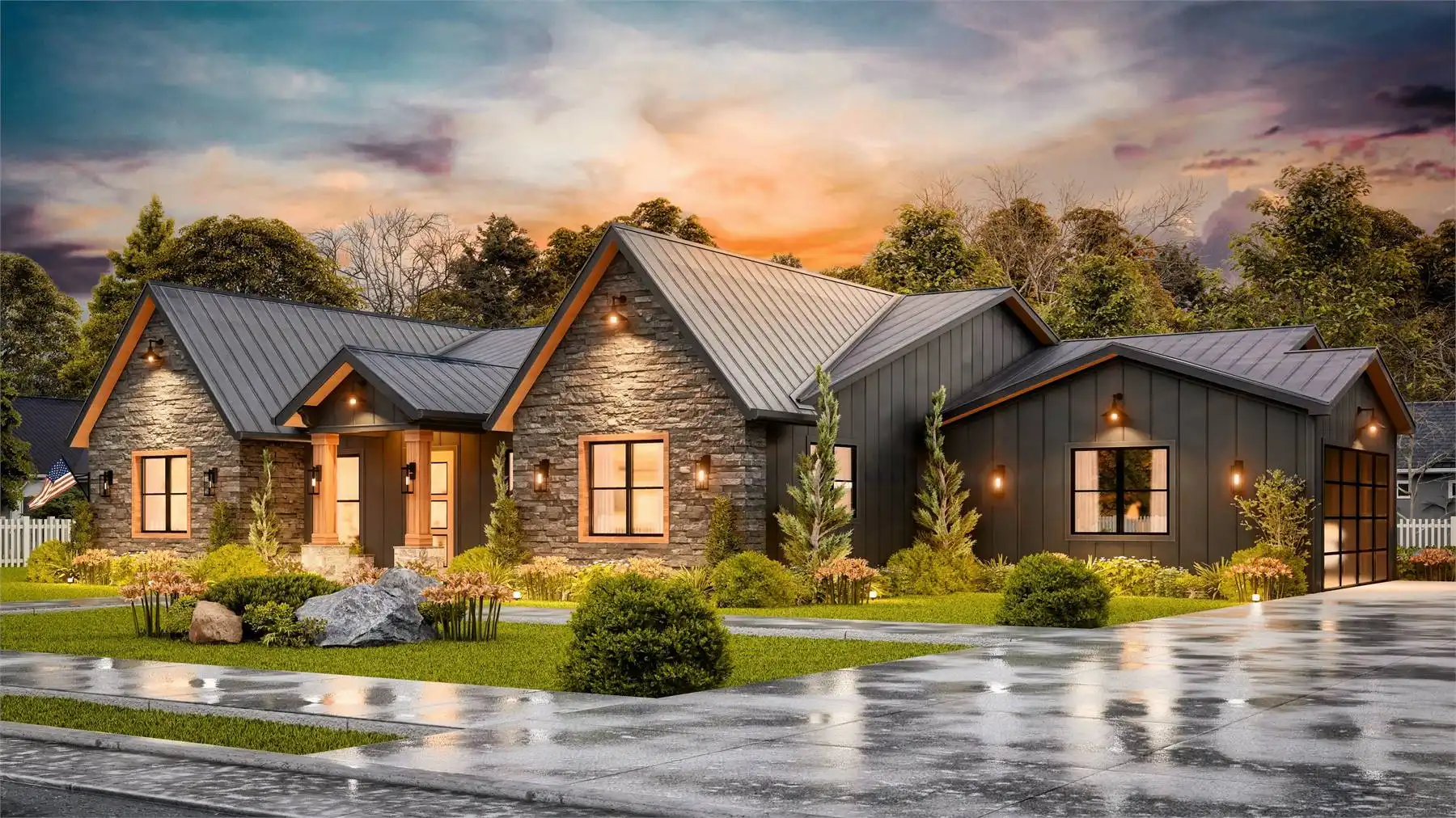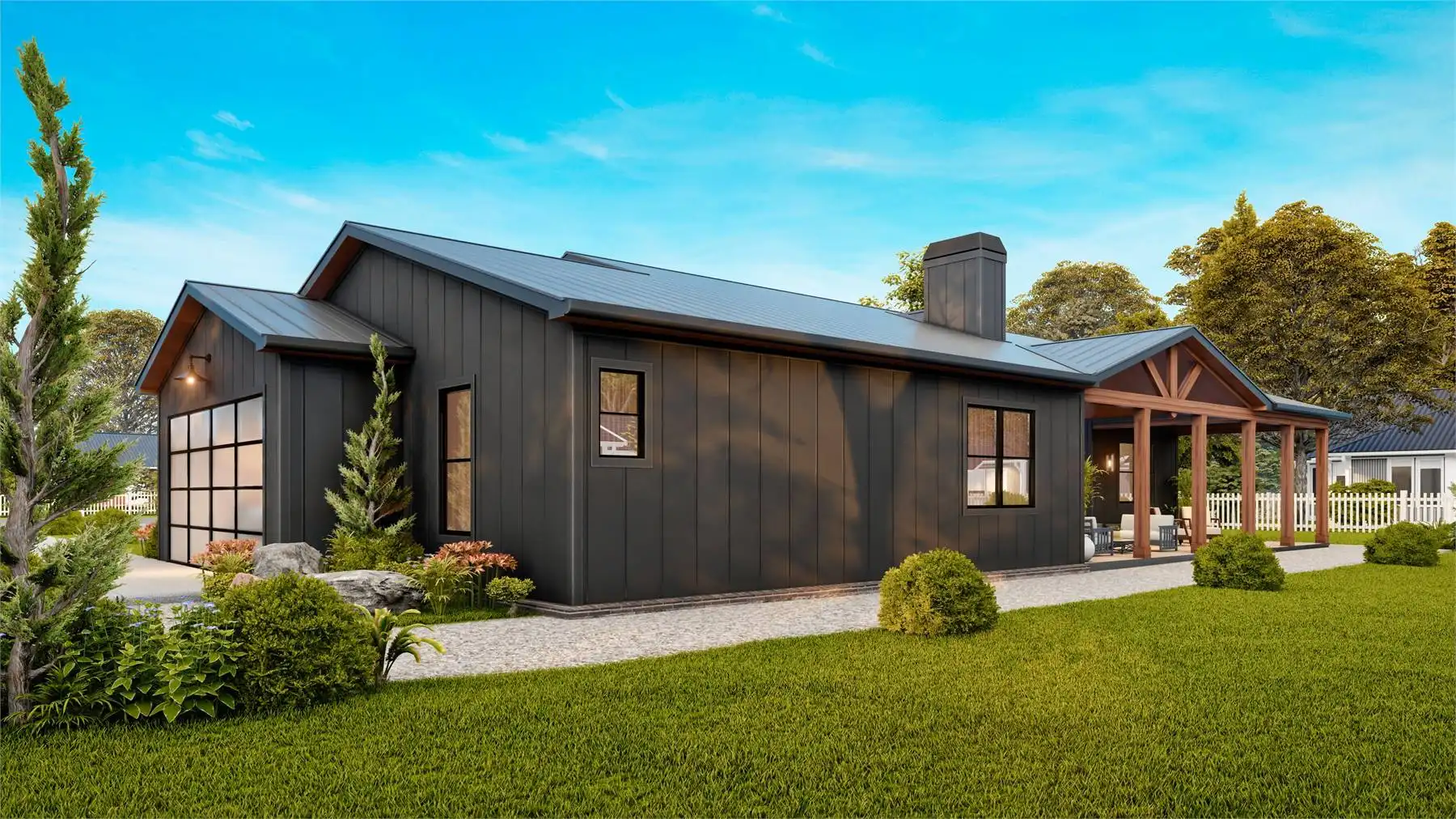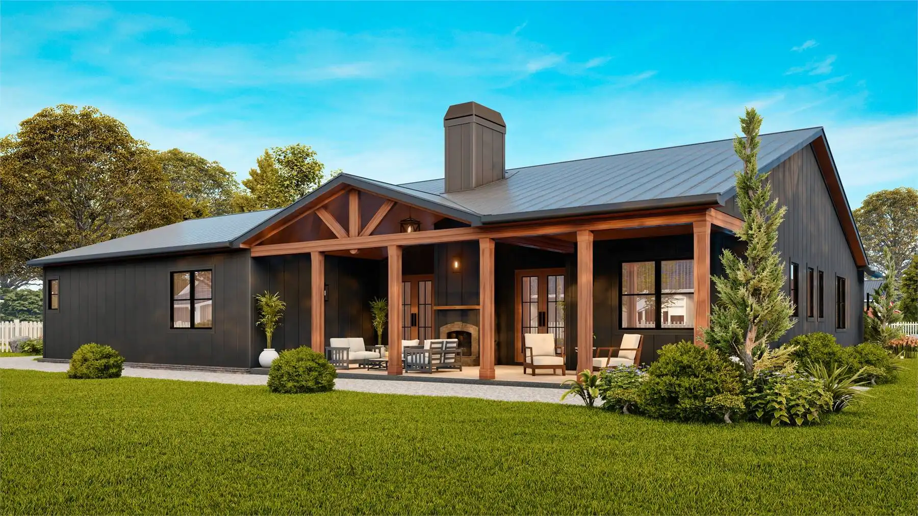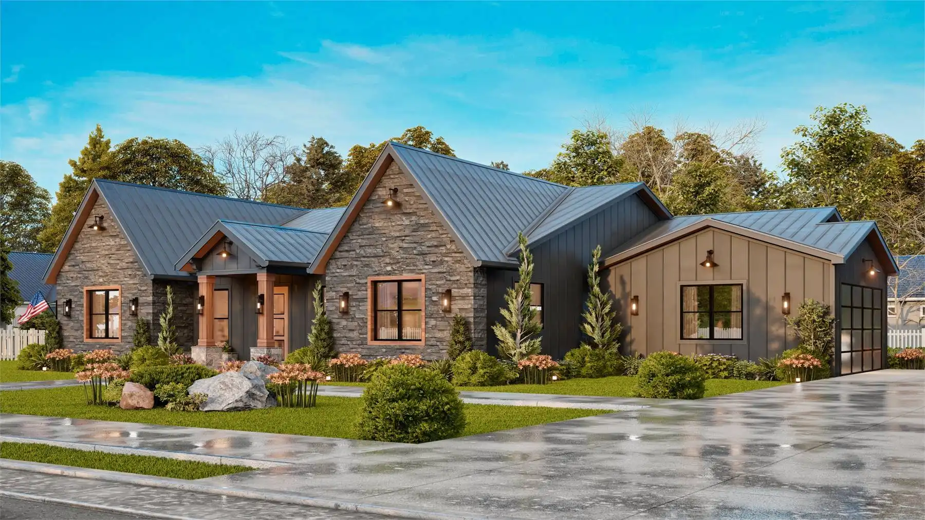 House Plan 10313 is a modern farmhouse that blends rustic charm with contemporary style. Its exterior features striking black brick, dark board-and-batten siding, and a sleek metal gable roof. Large black-framed windows invite natural light inside, while the wood-paneled entry with a glass-paneled door and industrial-style sconces offers a warm welcome. Stone accents and well-manicured landscaping enhance its curb appeal, making House Plan 10313 an inviting choice for families or those seeking a stylish retreat.