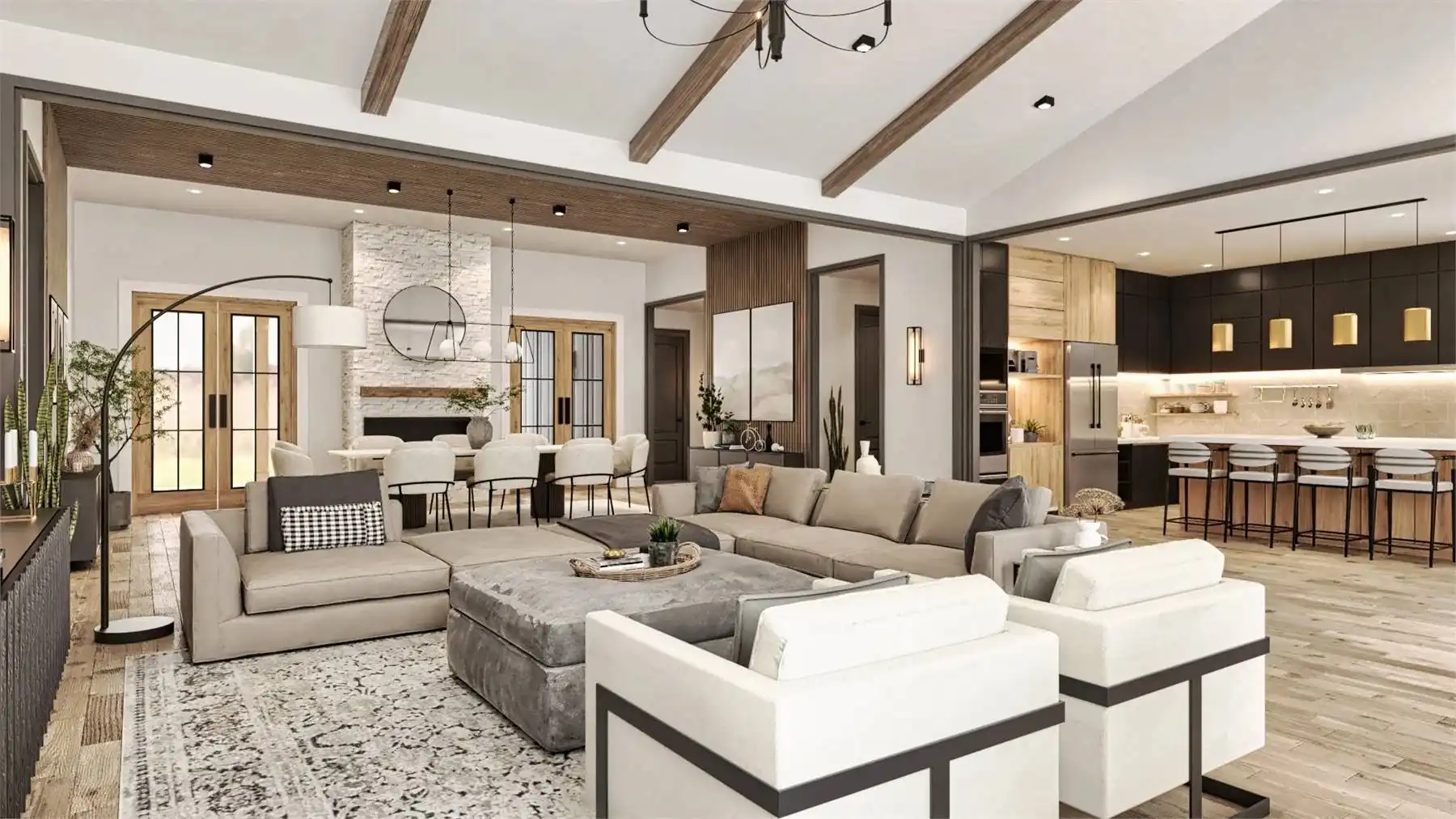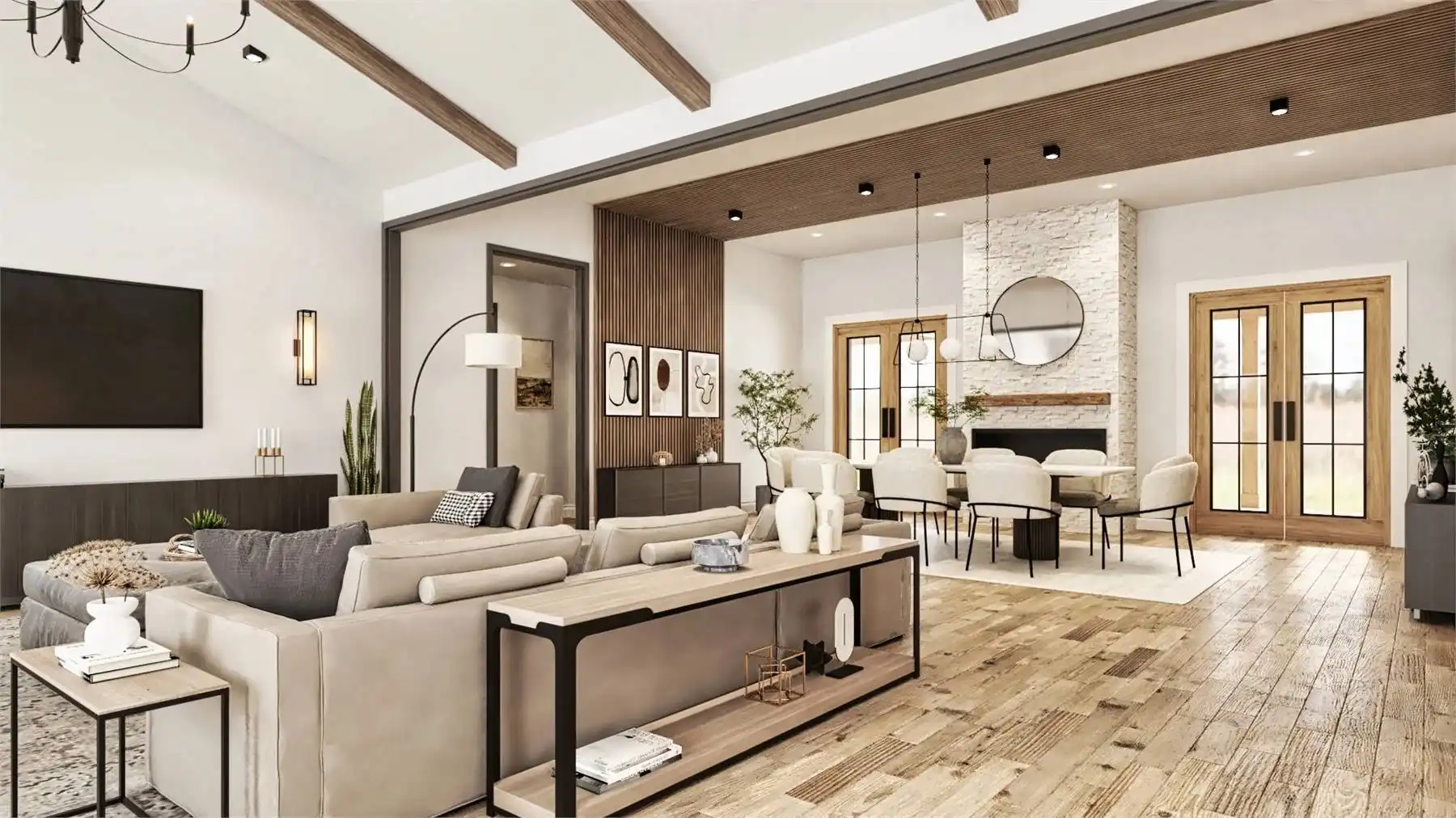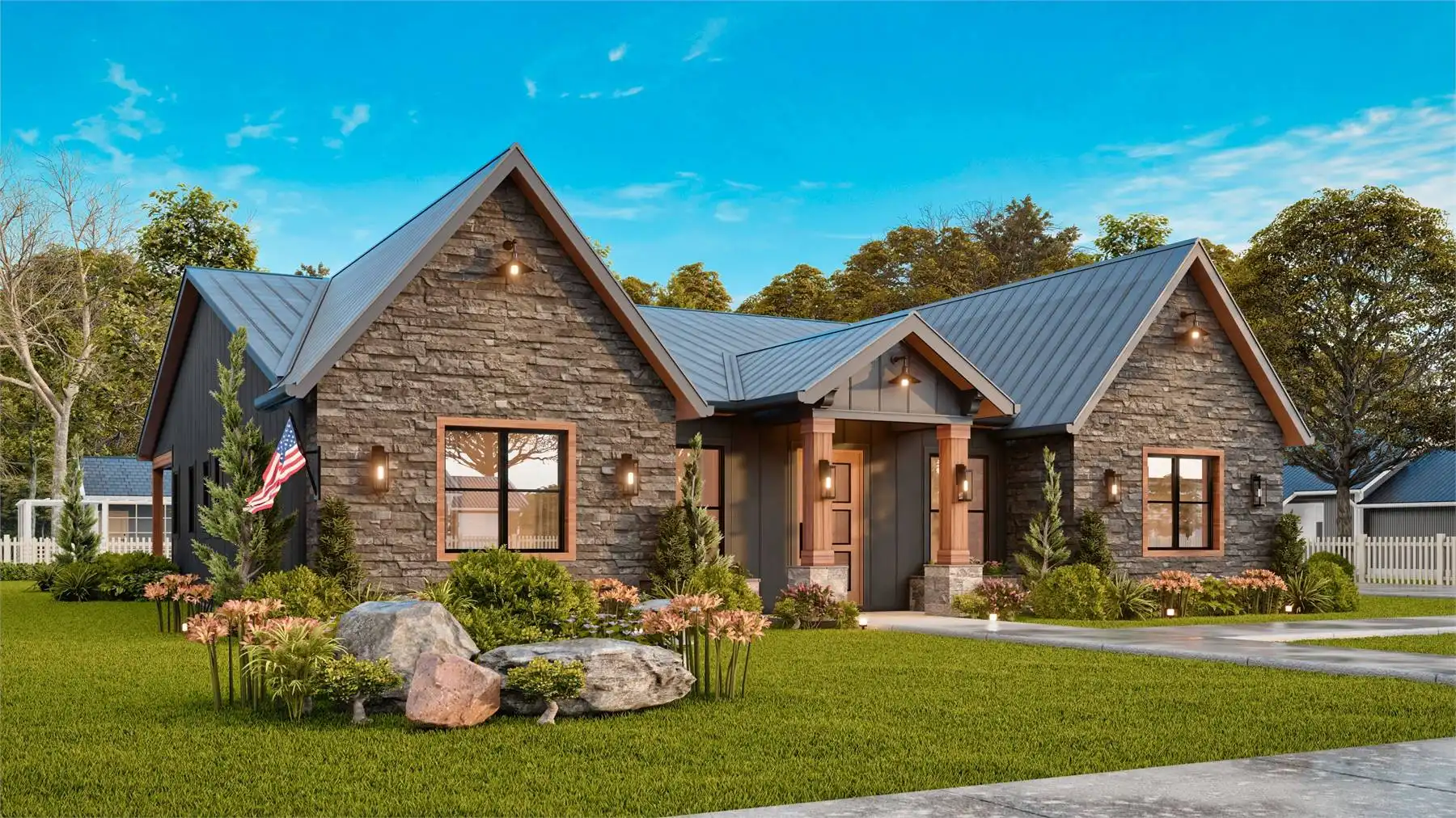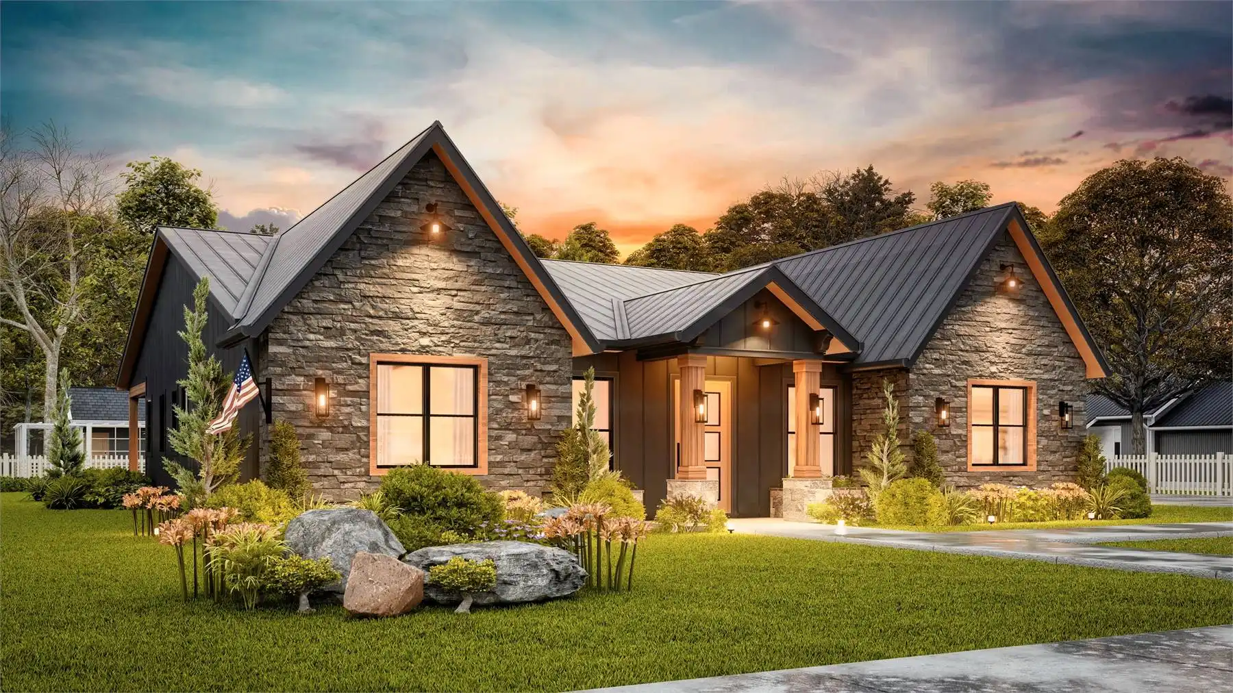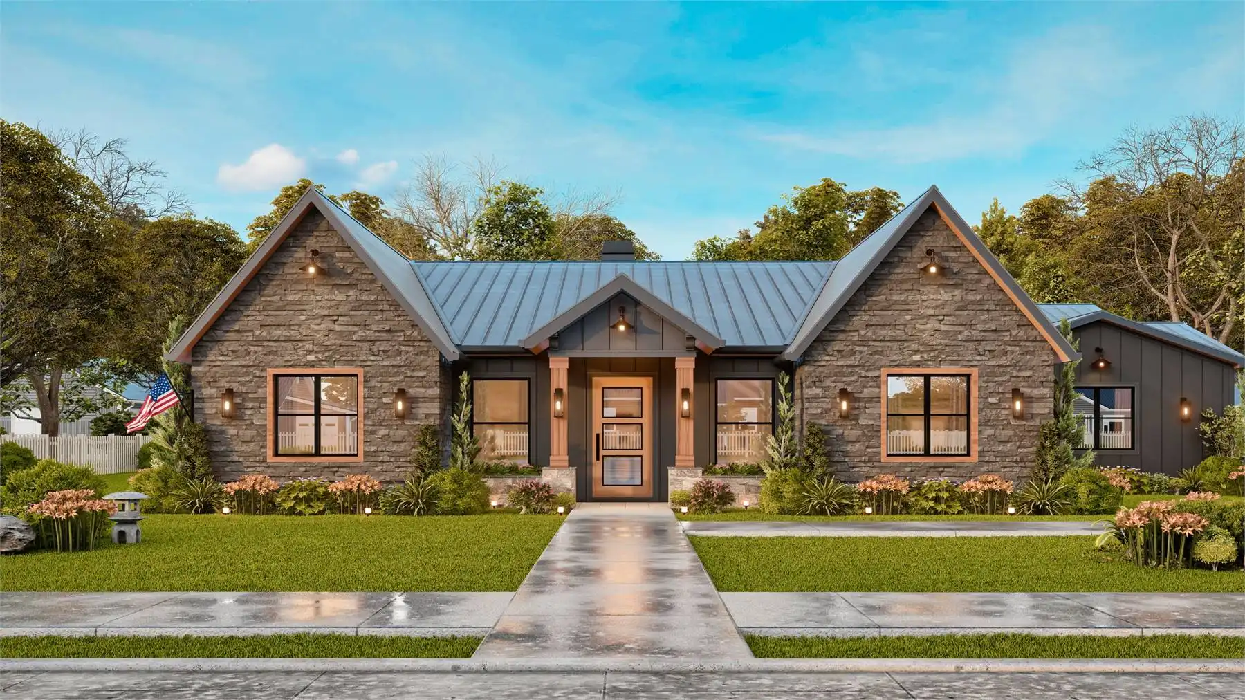 House Plan 10313 is a modern farmhouse that blends rustic charm with contemporary style. Its exterior features striking black brick, dark board-and-batten siding, and a sleek metal gable roof. Large black-framed windows invite natural light inside, while the wood-paneled entry with a glass-paneled door and industrial-style sconces offers a warm welcome. Stone accents and well-manicured landscaping enhance its curb appeal, making House Plan 10313 an inviting choice for families or those seeking a stylish retreat.