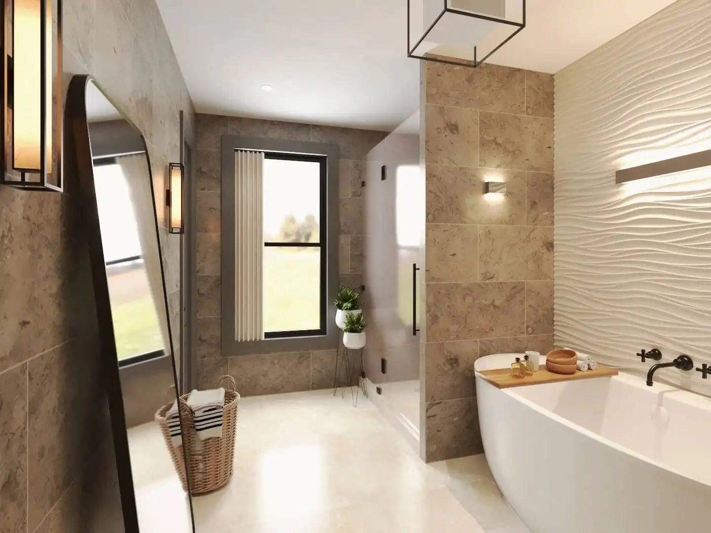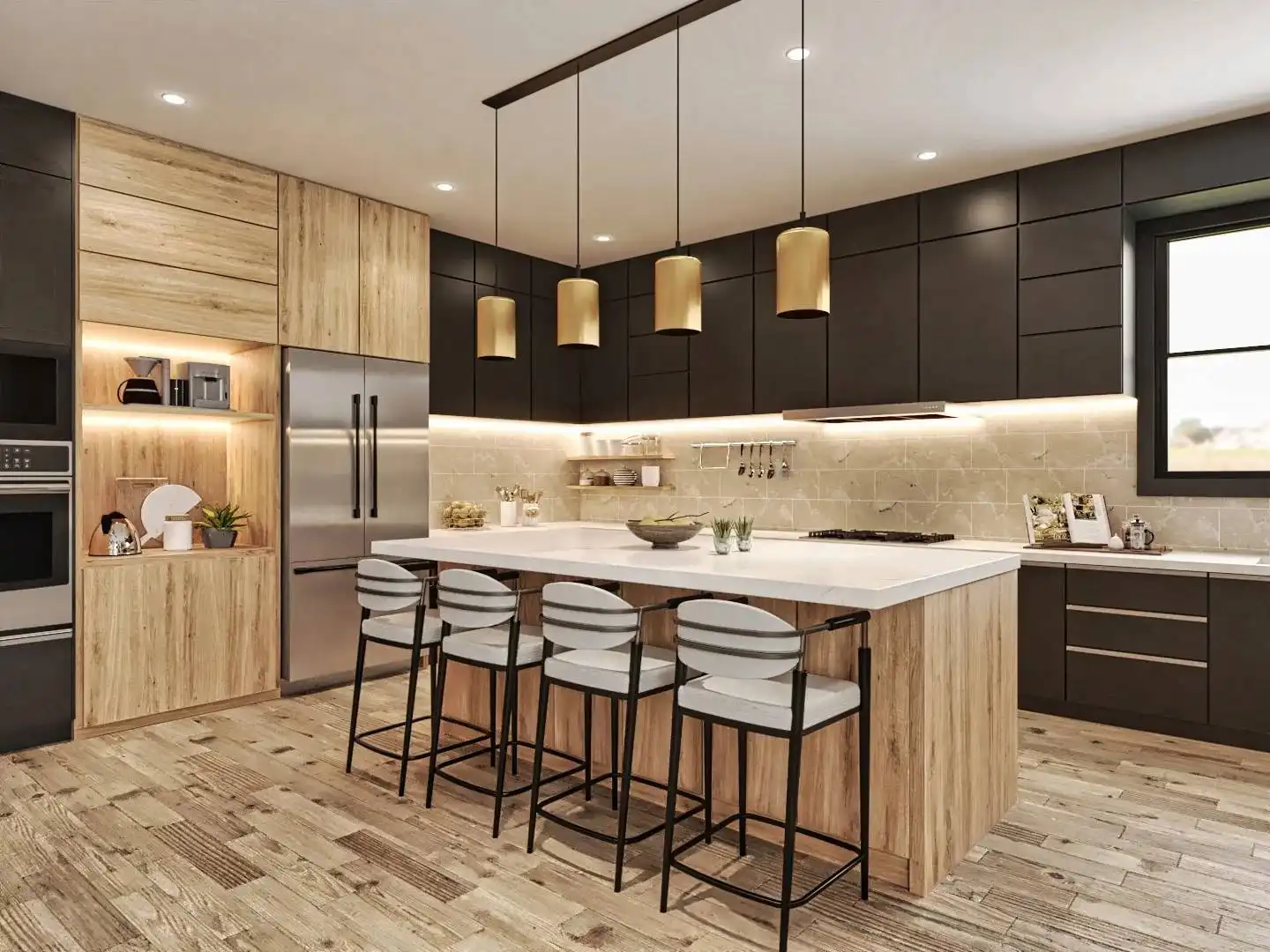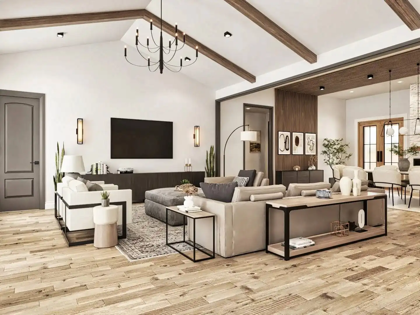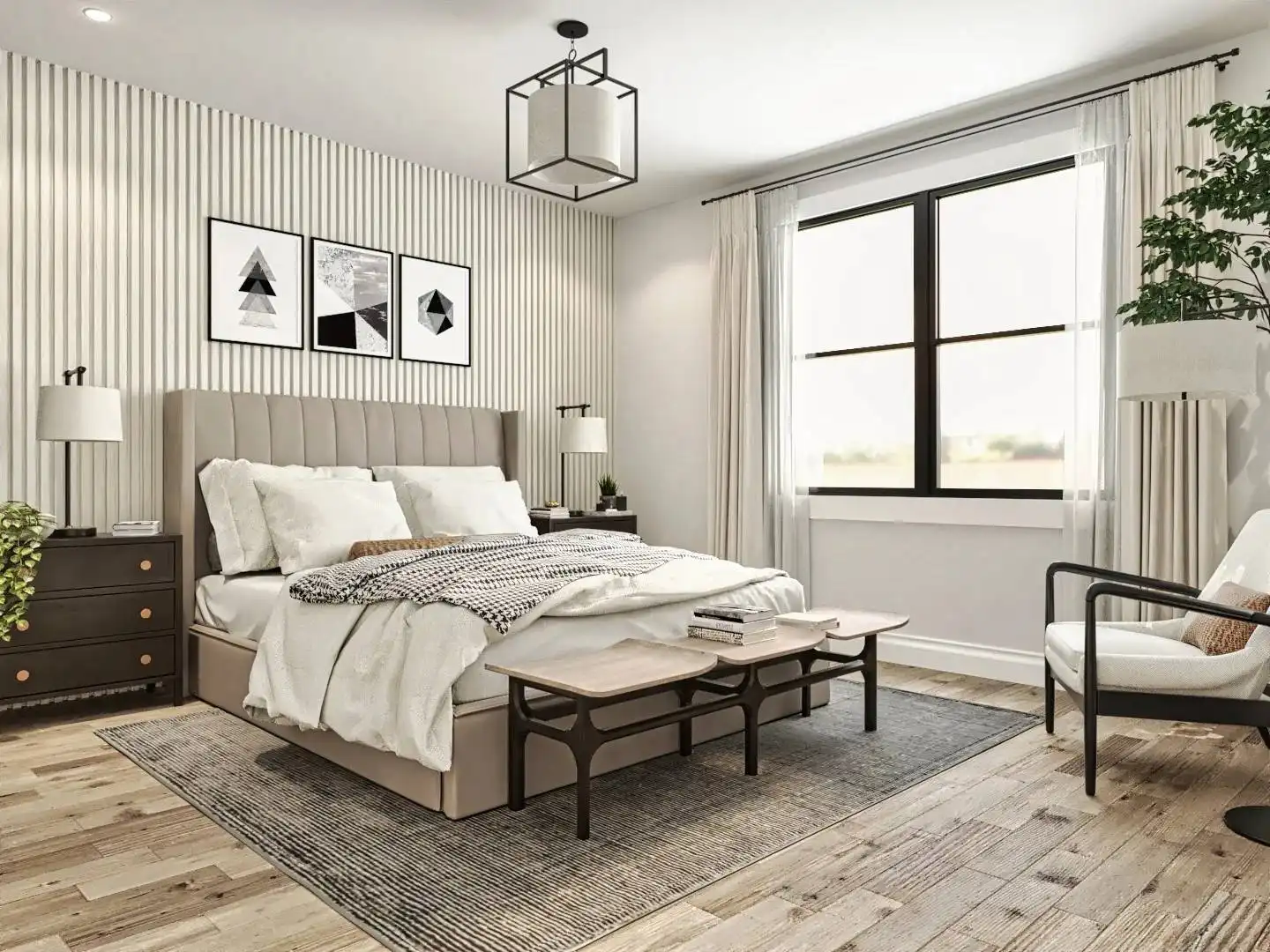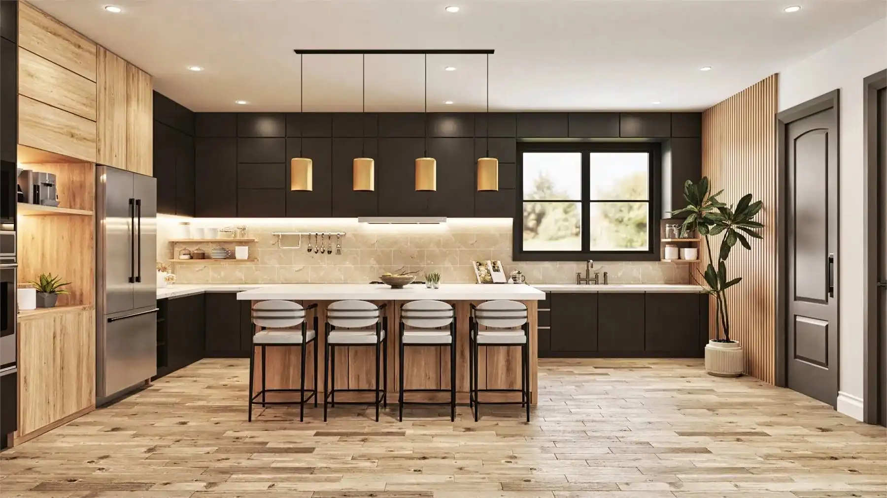 House Plan 10313 is a modern farmhouse that blends rustic charm with contemporary style. Its exterior features striking black brick, dark board-and-batten siding, and a sleek metal gable roof. Large black-framed windows invite natural light inside, while the wood-paneled entry with a glass-paneled door and industrial-style sconces offers a warm welcome. Stone accents and well-manicured landscaping enhance its curb appeal, making House Plan 10313 an inviting choice for families or those seeking a stylish retreat.