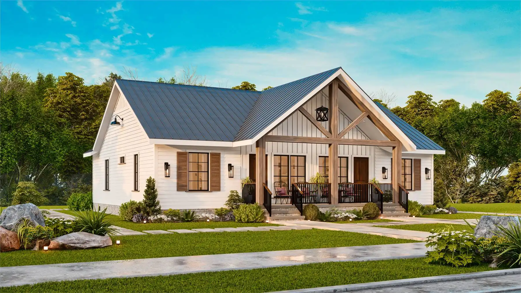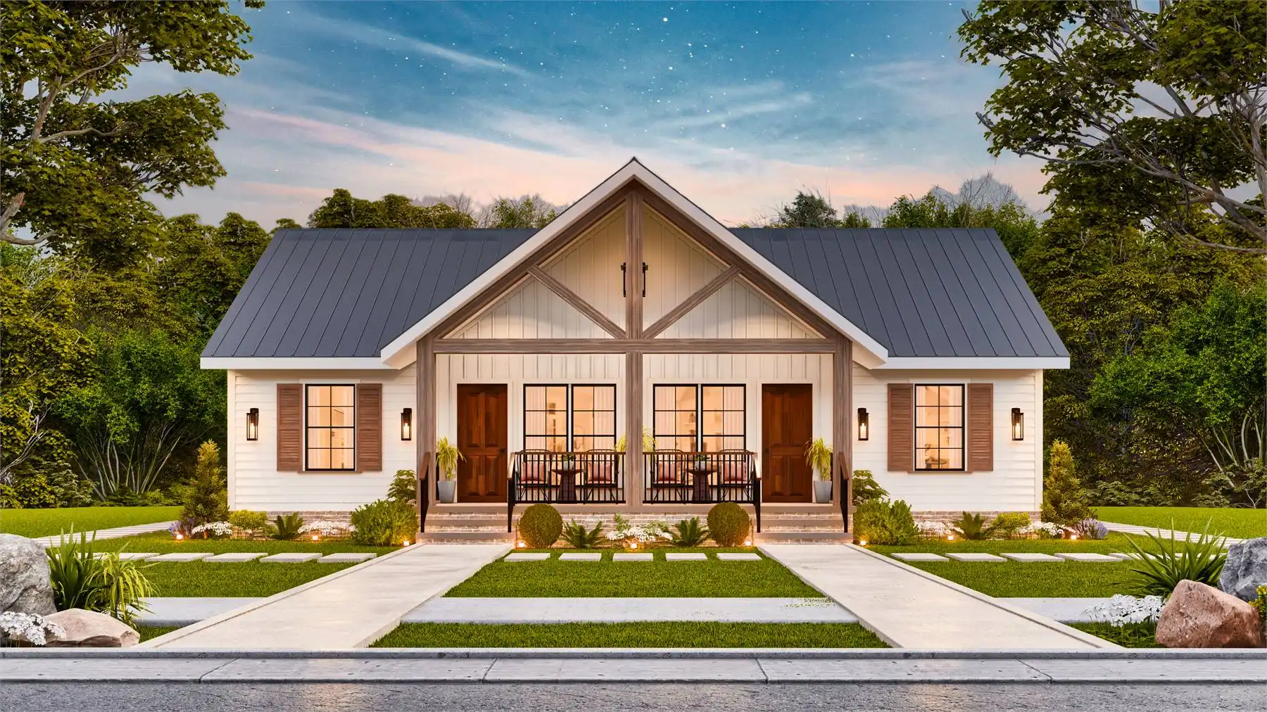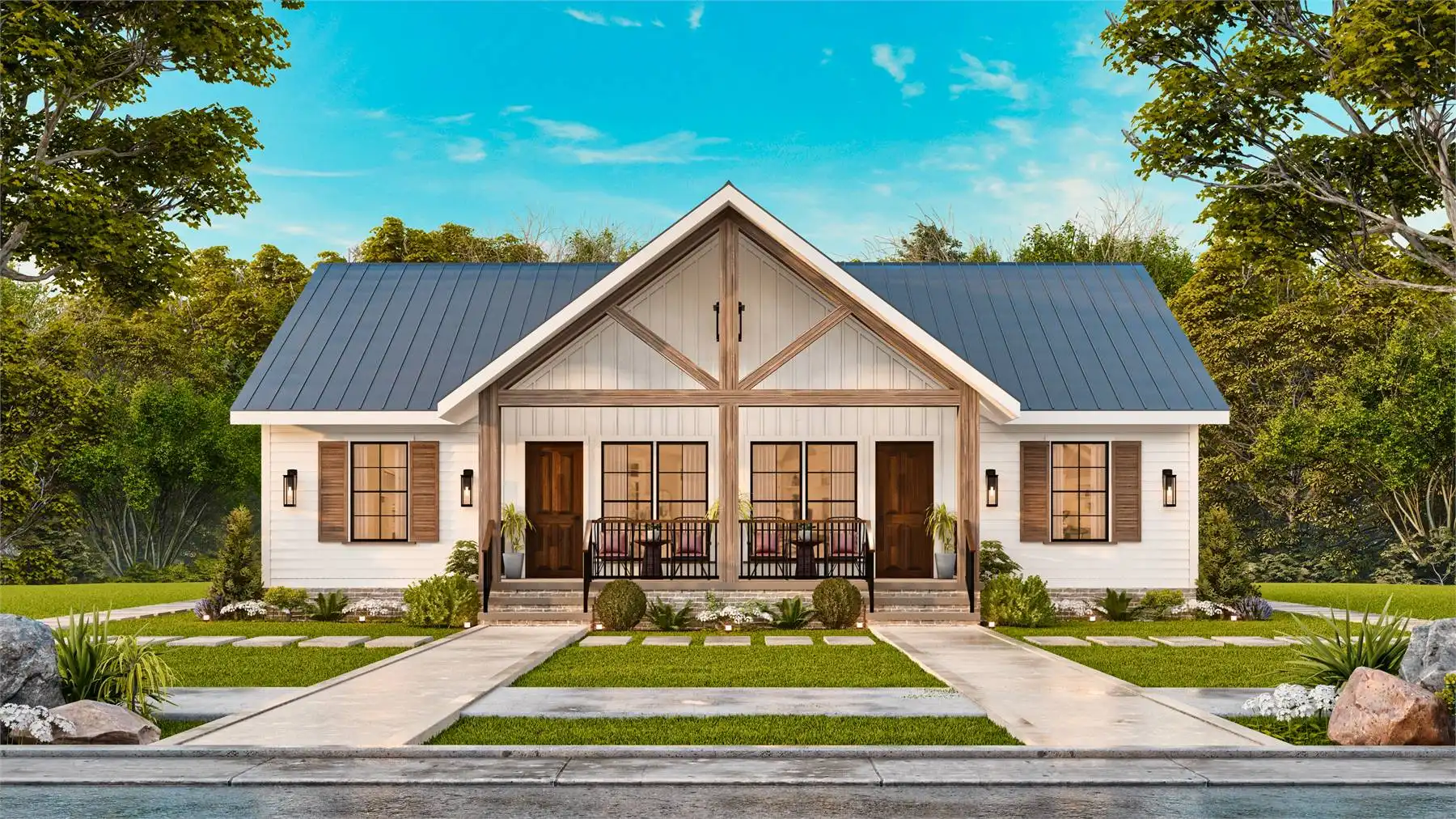 House Plan 10319 is a single-story, 2-unit duplex designed with simplicity and comfort in mind. Each unit offers 2 bedrooms, 2 full bathrooms, an L-shaped kitchen with an island, a dining area, and a separate living room. Covered front and back porches provide inviting outdoor spaces. With a blend of country, farmhouse, and craftsman styles, this plan is both modern and rustic—ideal for investors, first-time homeowners, or empty nesters seeking additional income.