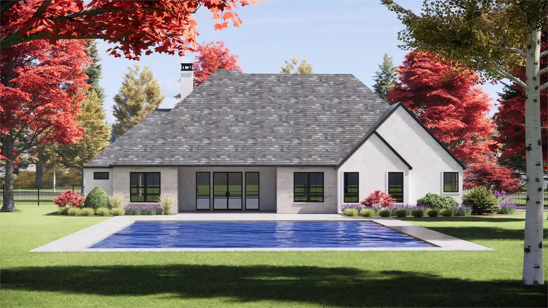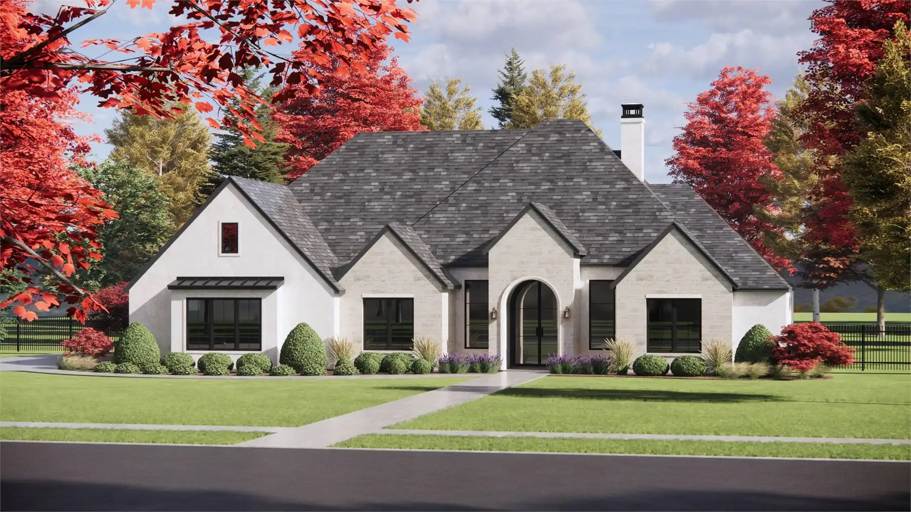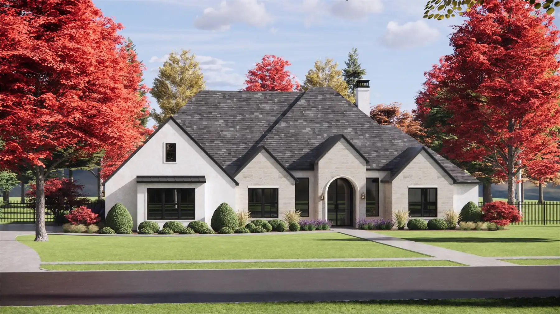House Plan 10329 is a 2,382 sq. ft. Southern-style home with classic stone accents, an arched entry, and a charming gabled roofline. Inside, a vaulted great room flows into the chef’s kitchen, featuring a large island and an expansive walk-in pantry for ample storage and prep space. The split-bedroom layout ensures privacy, with the primary suite offering a dual vanity sink, separate tub and shower, and a spacious walk-in closet. Three additional bedrooms, including a secondary suite with a private bath, provide comfort for family and guests. Well-organized utility spaces, a vaulted rear covered porch, and a two-car garage complete this elegant and functional design.