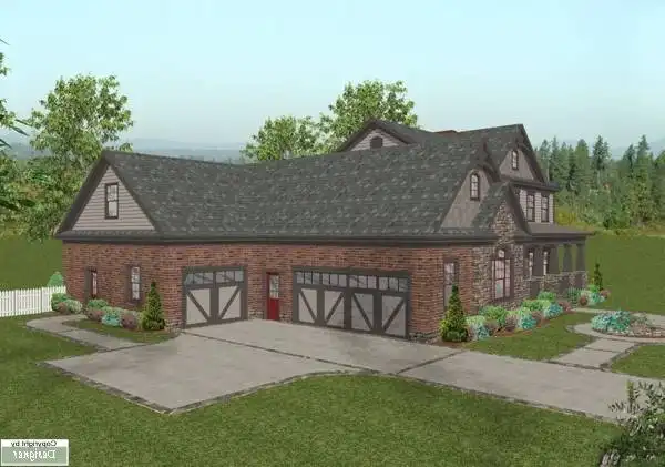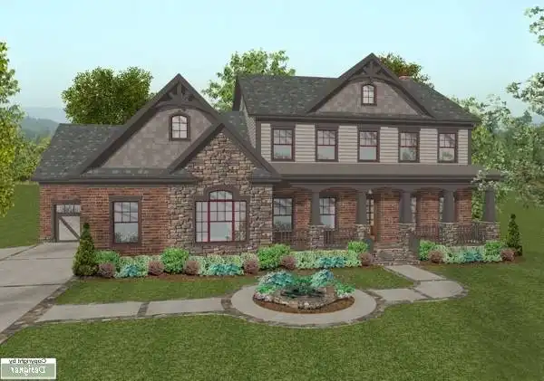 This charming 2,697 sq. ft. Old World home features a split 3-car garage, a spacious front porch and a brick, stone and siding exterior with shake accents. The entry unfolds to a columned dining room and a home office. The large gourmet kitchen has an angled breakfast nook and a snack bar to provide additional seating and food prep space. Cabinets and shelves in the breakfast area offer pantry storage space. The center island holds a cook-top. A welcoming fireplace warms the cozy two-story family room.