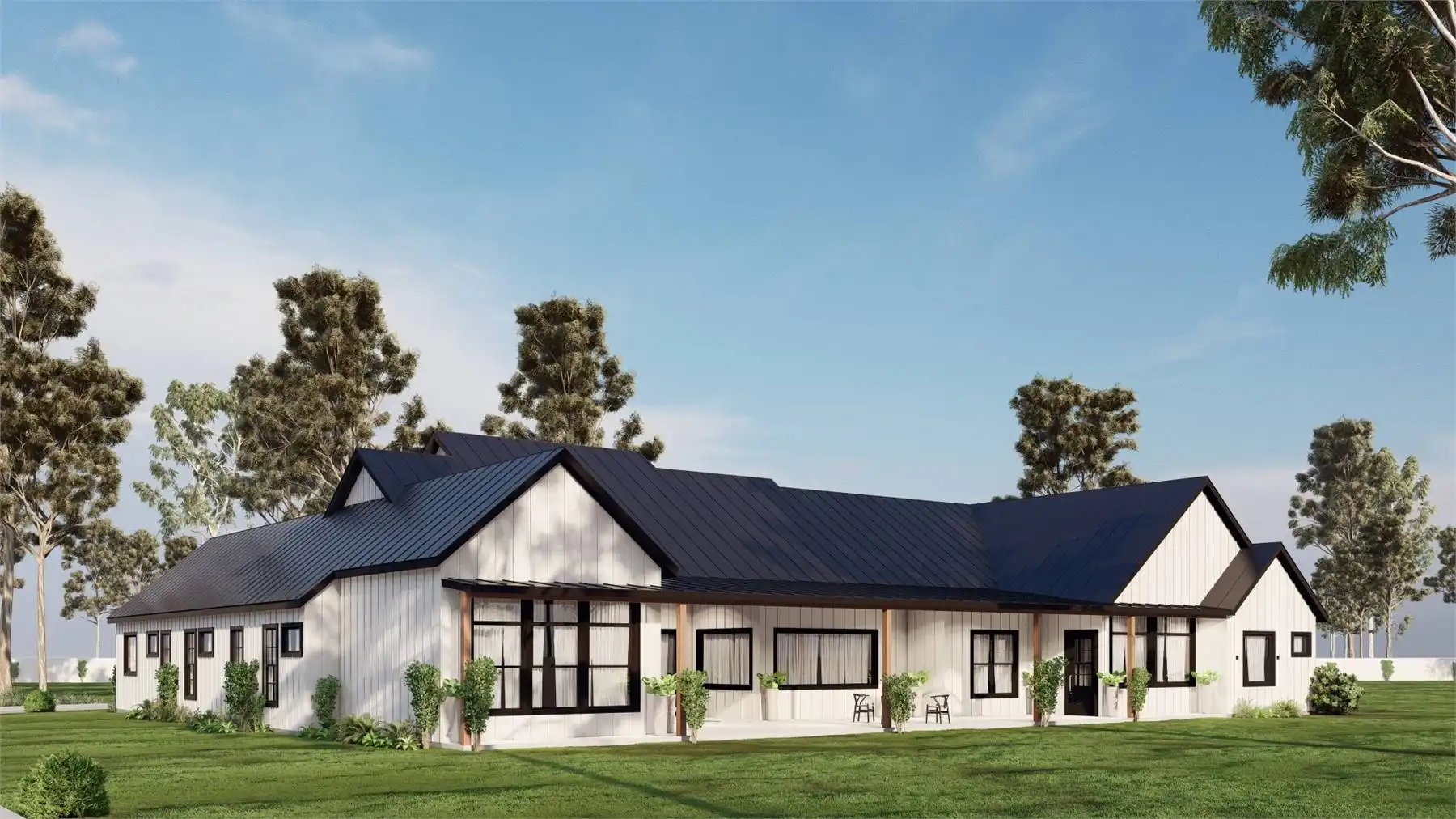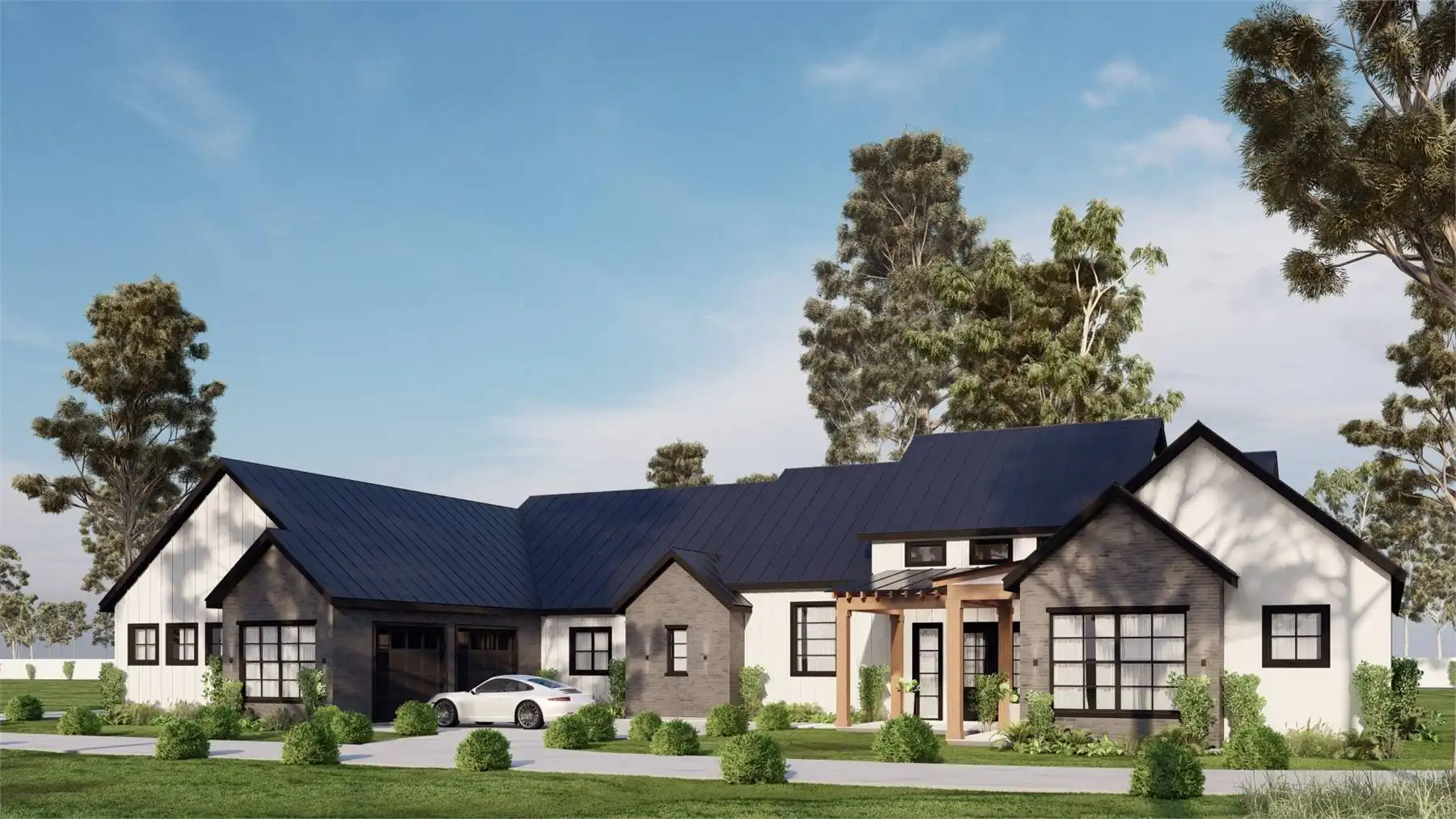 House Plan 10397 is a 4,251 square foot Ranch with a striking mixed-material exterior, multiple gables, and a welcoming covered entry. The open-concept living area features a sloped-ceiling great room , a spacious kitchen with a central island, and a dining area under 12' ceilings. A private study overlooks the rear porch, while the primary suite offers a luxurious retreat in the back-right corner. Three additional bedrooms line the left side, and a separate guest suite with private porch access provides a perfect space for extended stays. A generous 1,465 sq. ft. 4-car garage connects through a large utility room, combining style and functionality for modern living.