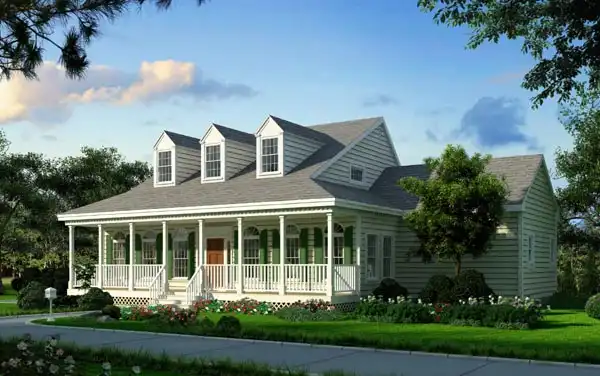 This beautiful traditional style plan. This home is a great option for a new or growing family, thanks in part to its’ 2,639 square feet, 3 bedrooms and 2.5 bathrooms. A touch of symmetrical Cape Cod adds an additional level of appeal to this homes, while the magnificent front porch entices you. The front door gives way to a 2-story foyer as well as a formal living room to your left and a formal dining room to the right. The semi-open layout then flows in to this home’s masterpiece, a 2-story great room with 18’ ceilings and dual French doors flanking the fireplace, creating a beautiful aesthetic and providing exterior access. To the right of the great room is a kitchen that would make even the most seasoned chef jealous. A gourmet layout that is designed for maximum functionality and refined beauty, this kitchen comes complete with a dining nook for more informal family meals. The other wing of the first level houses the master suite, a true work of art in its own right. A spacious bedroom is made to feel larger thanks to its tray ceilings and large windows. A walk-in closet and spa style bathroom complete the suite and provide ample areas of relaxation. The second floor is simple yet functional as it offers 2 additional bedrooms as well as a shared full bathroom. A balcony looks below on to the great room, tying the space and the home together.