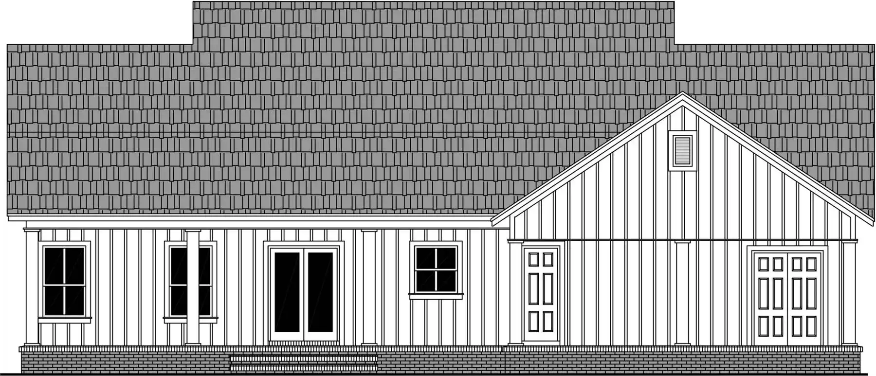 House Plan 10420 is a 1,800 square foot ranch-style home with timeless charm and modern convenience. This one-story design features three bedrooms, two bathrooms, and a two-car garage, plus a rear two-car carport for extra parking. A classic board and batten exterior and a large covered front porch create a warm welcome. Inside, the vaulted great room flows into the L-shaped kitchen, complete with a central island and dining area with access to the rear covered porch. The split-bedroom layout ensures privacy, with the primary suite offering a spacious ensuite with dual vanities, a walk-in shower, and a large walk-in closet. Designed for both comfort and functionality, House Plan 10420 is a perfect blend of classic ranch style and modern living.