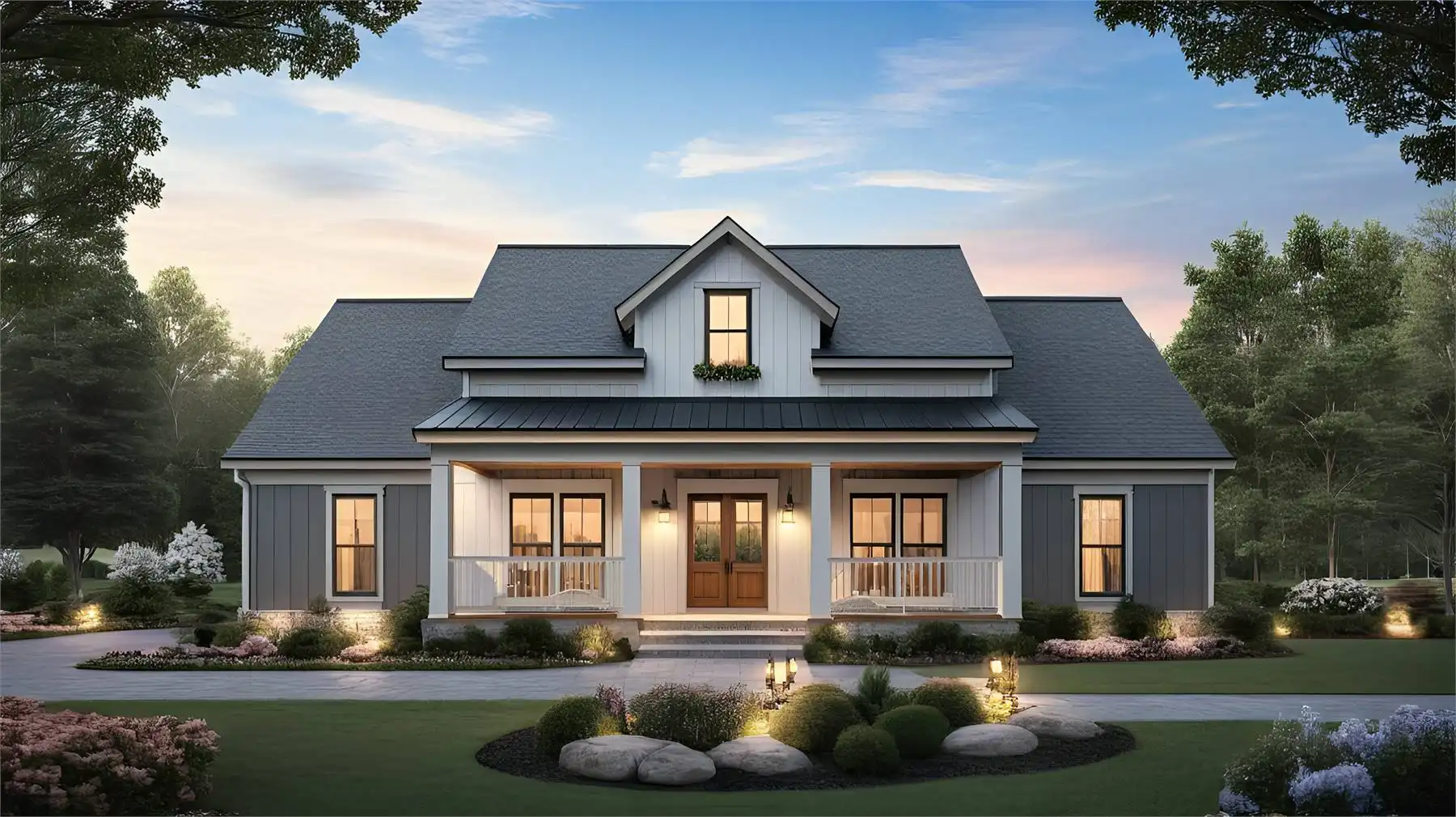 House Plan 10421 is a spacious 1,817-square-foot country home with classic charm and modern convenience. A wide covered front porch sets the tone for this 1.5-story design, featuring an open floor plan with a vaulted great room, L-shaped kitchen with island, and dining area, all leading to a large covered rear porch for easy indoor-outdoor living. The private owner’s suite includes tray ceilings, a luxurious ensuite with dual vanities, and a large walk-in closet. A split-bedroom layout ensures privacy, with two additional bedrooms sharing a full bath. The rear-entry two-car garage offers extra storage, while a bonus room with a full bath above is perfect for guests or a home office. House Plan 10421 combines country style and modern functionality, making it an inviting and practical home.