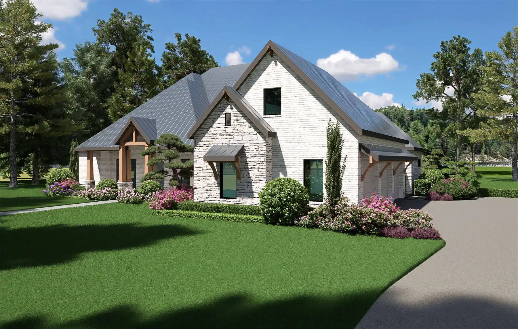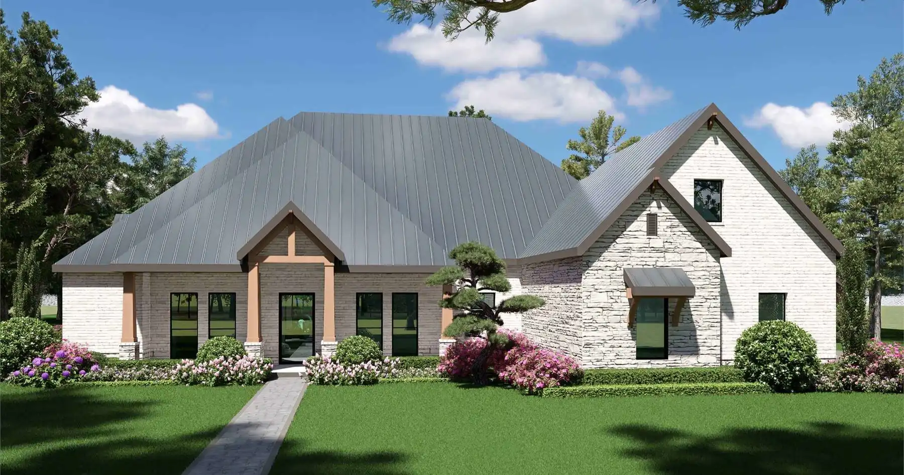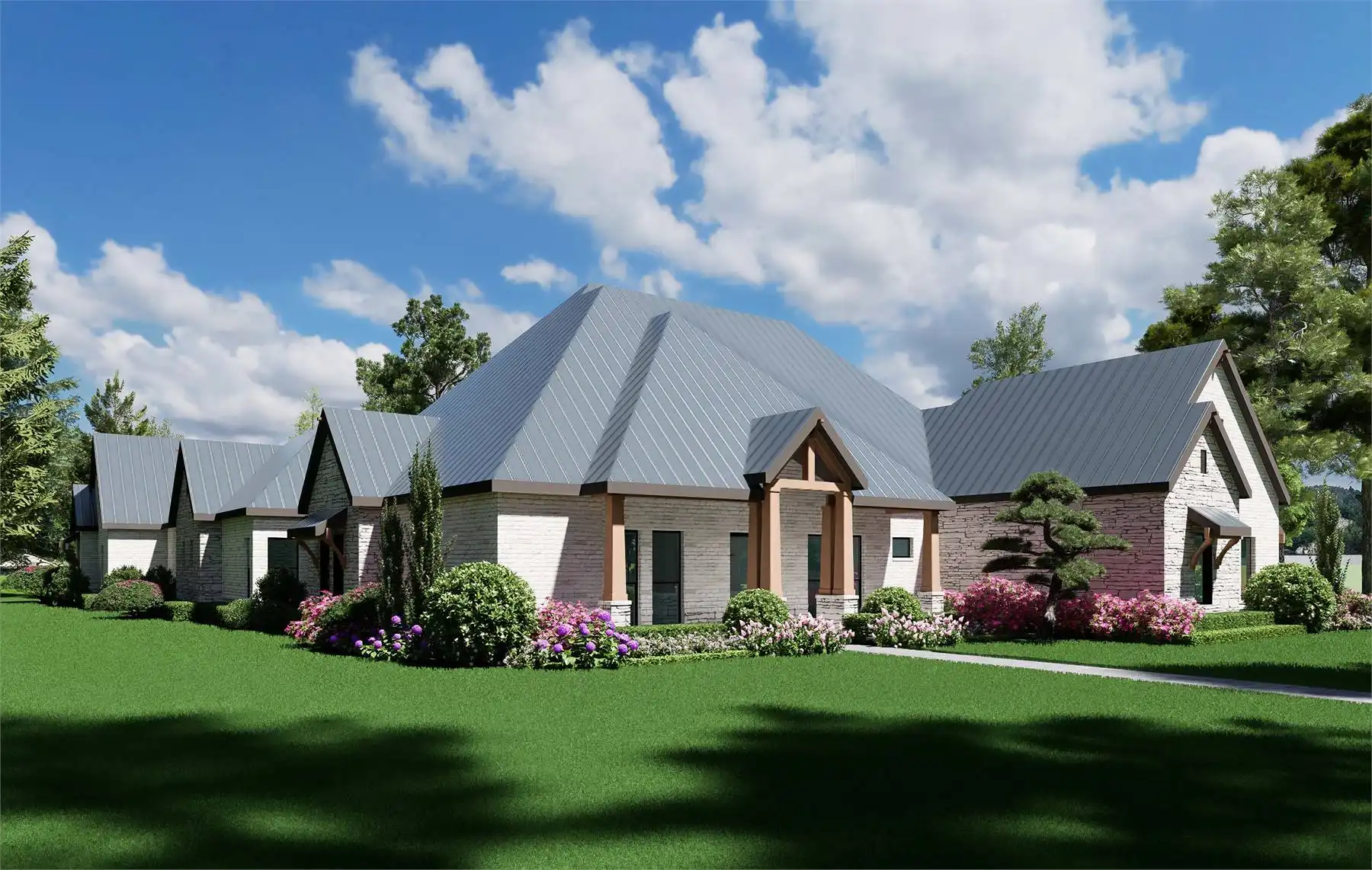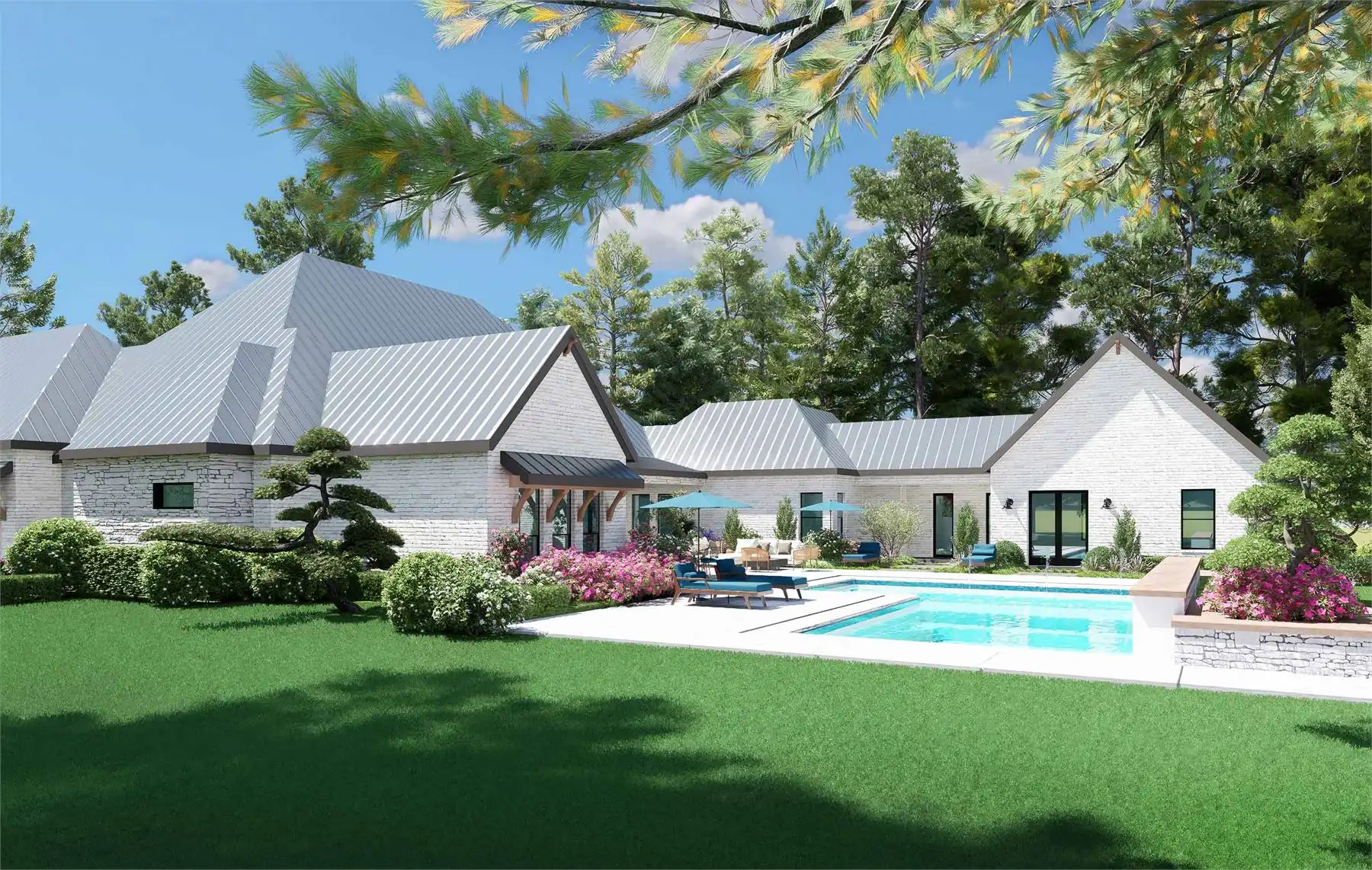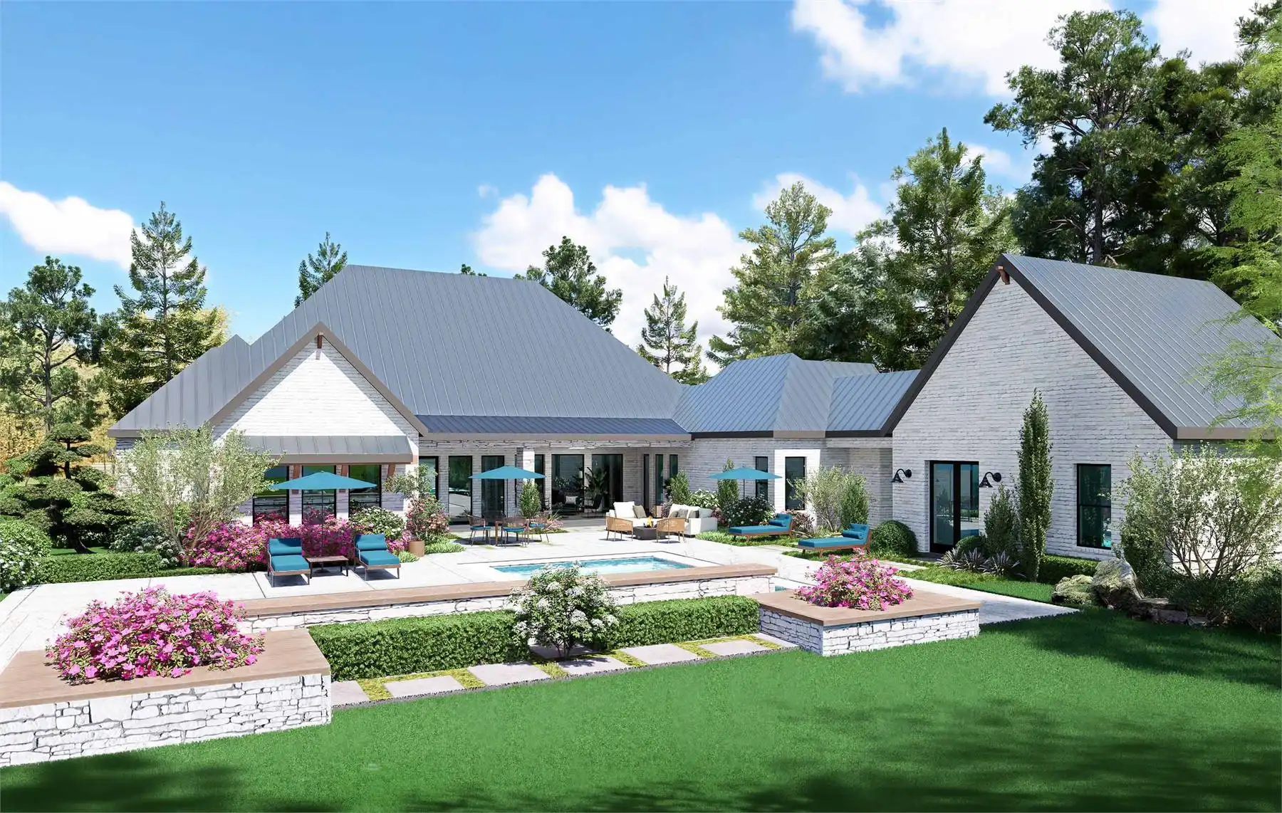 House Plan 10441 is a beautifully designed 4,166 square foot transitional-style home that blends classic charm with modern convenience. This two-story home features five bedrooms, 3.5 bathrooms, and a three-car garage, offering a spacious and functional layout. A vaulted front porch leads into a welcoming dining room and guest suite at the front. The right wing includes three additional bedrooms and two full bathrooms, while a powder room, pool storage, and a flexible workshop/studio space provide added versatility. On the left side, the three-car garage connects to the utility room for easy everyday use. The owner’s suite, tucked at the back, offers a private retreat with a spa-like bathroom and walk-in closet. At the heart of the home, the open-concept family room and kitchen feature a large central island and seamless flow to the spacious outdoor living lounge. Upstairs, a vaulted loft, office, and extra storage space add to the home’s flexibility. With a thoughtful layout and timeless transitional style, House Plan 10441 is designed for both comfort and sophistication.