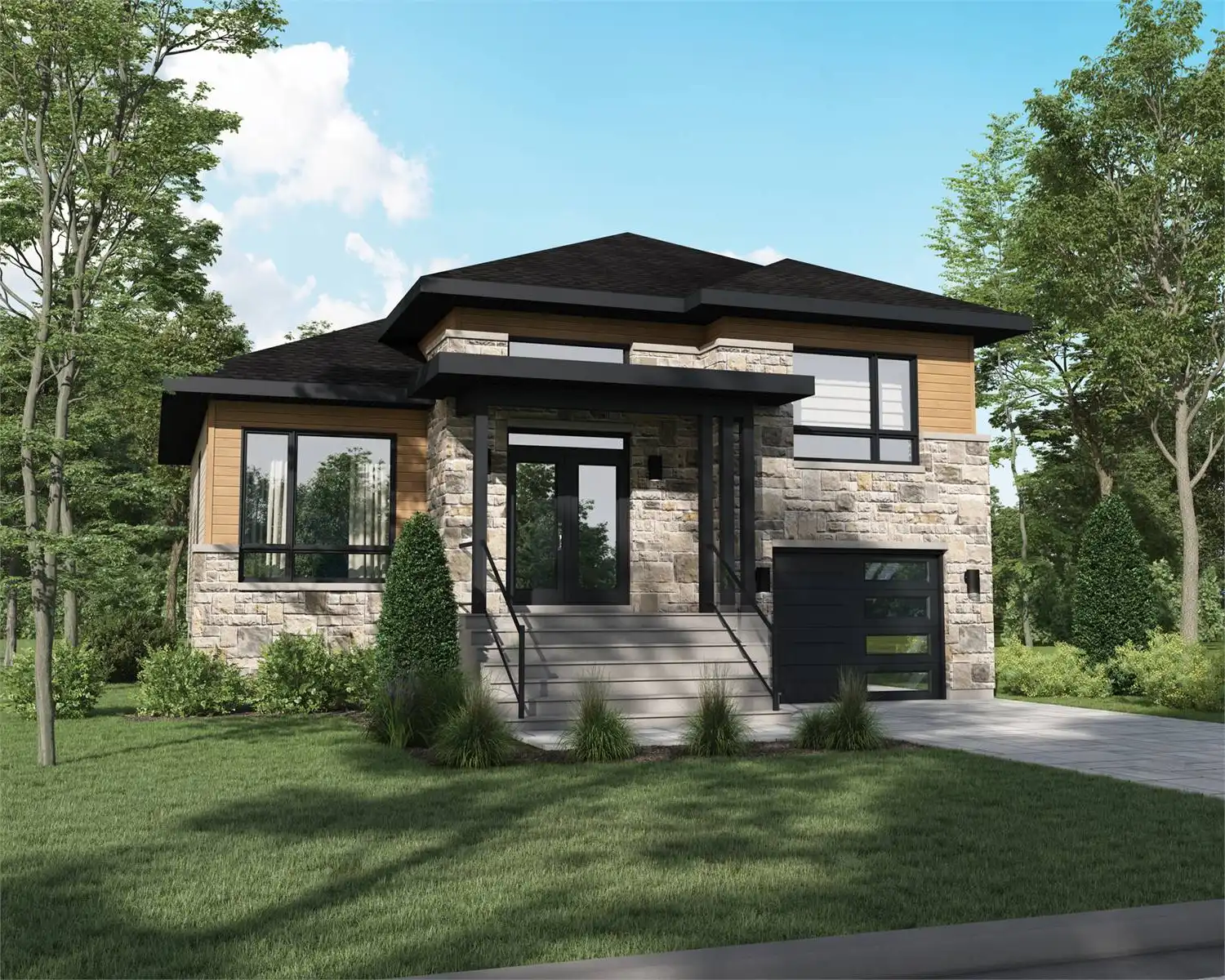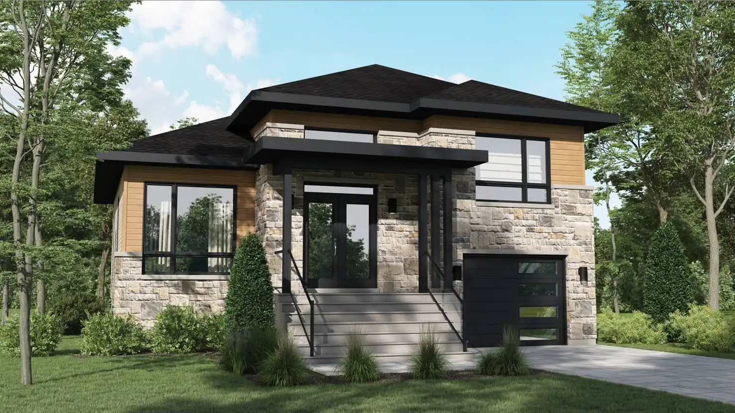 House Plan 10447 is a cute contemporary home with 1,287 square feet, two bedrooms, and one-and-a-half bathrooms. It also has a drive-under tandem garage that parks two! The main level is where you'll find the common areas including the island kitchen, volume living space, and dining room. There's a powder room by the foyer, too. The bedrooms, a large hall bath, and the laundry are located just up a short staircase, over the garage!