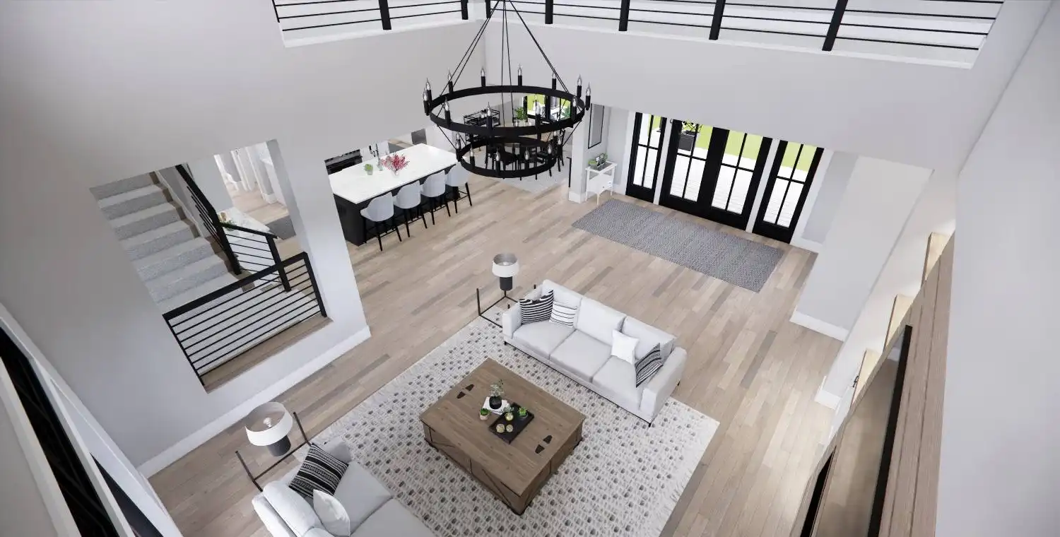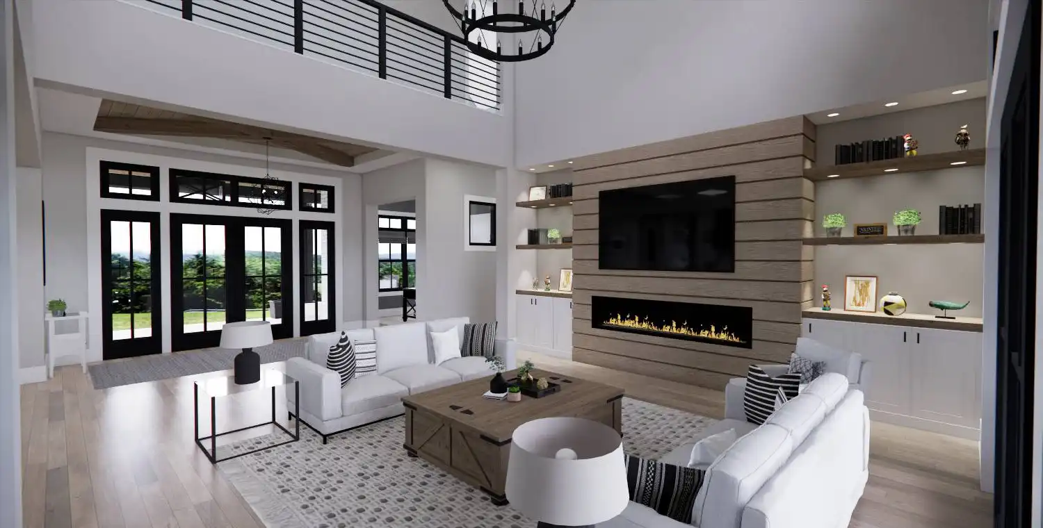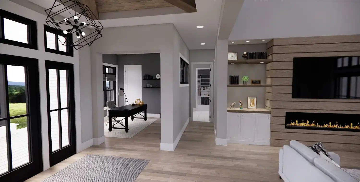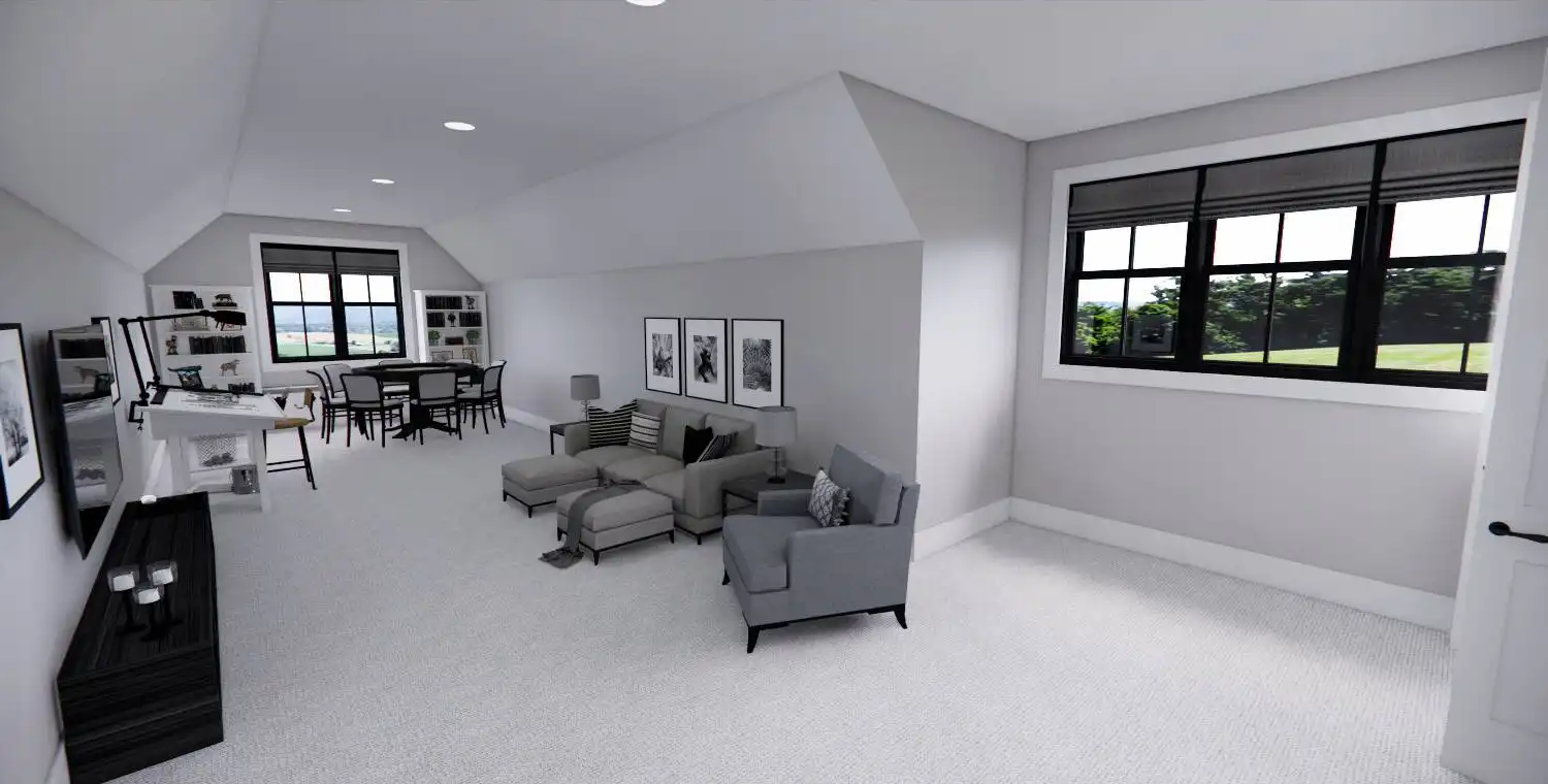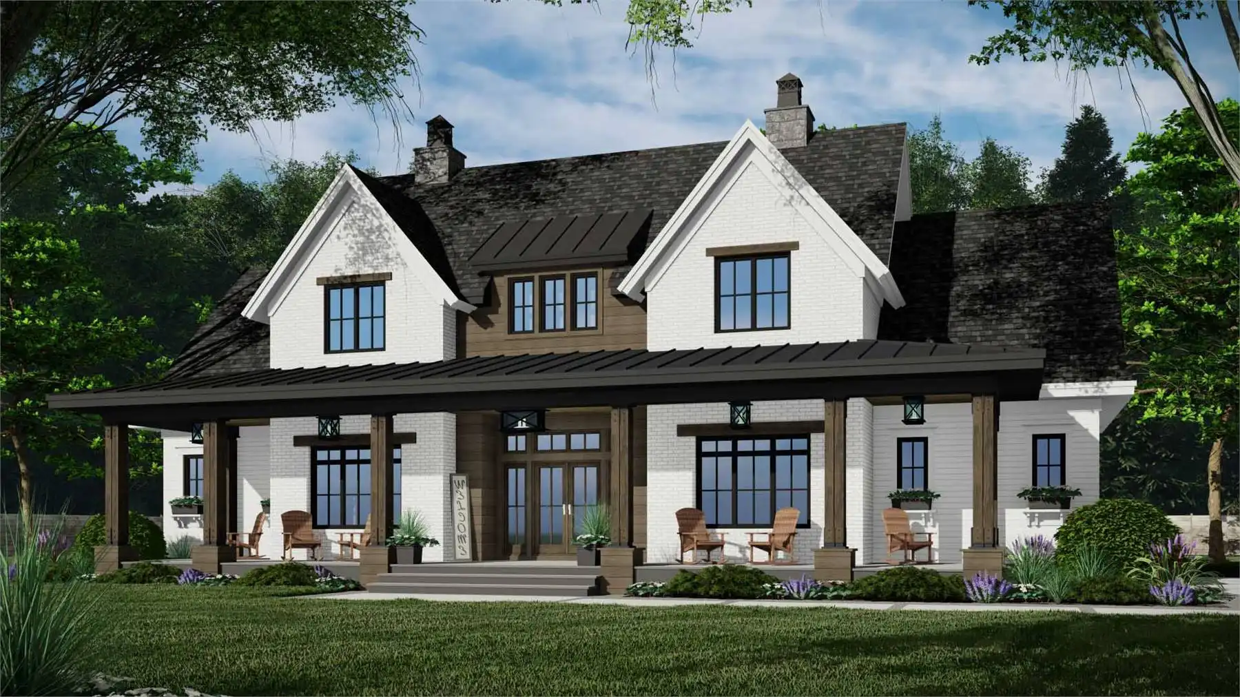House Plan 10455 showcases a 3,482 sq. ft. contemporary farmhouse designed for both style and efficiency. This two-story home includes 4 bedrooms and 3.5 bathrooms, with a main-level master suite offering a luxurious bath and walk-in closet. The central living area features a two-story great room with a fireplace that seamlessly connects to the kitchen and dining space, fostering an open and welcoming environment. The kitchen is equipped with an island with seating for four, a walk-in pantry, and a prep kitchen, adding to its functionality. An expansive loft overlooks the great room below, providing additional living space. Expansive front and rear covered porches extend the living space outdoors, offering perfect spots for relaxation and gatherings. With its contemporary farmhouse aesthetics and thoughtful design, House Plan 10455 is ideal for those seeking a harmonious blend of comfort and functionality.