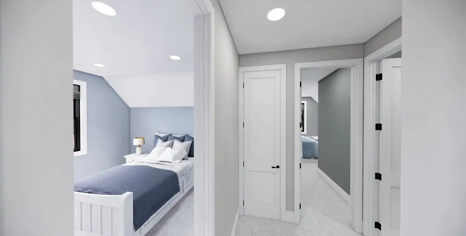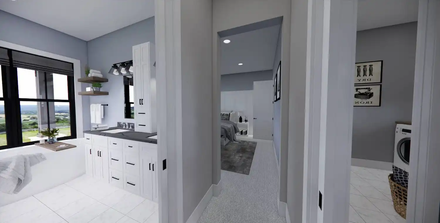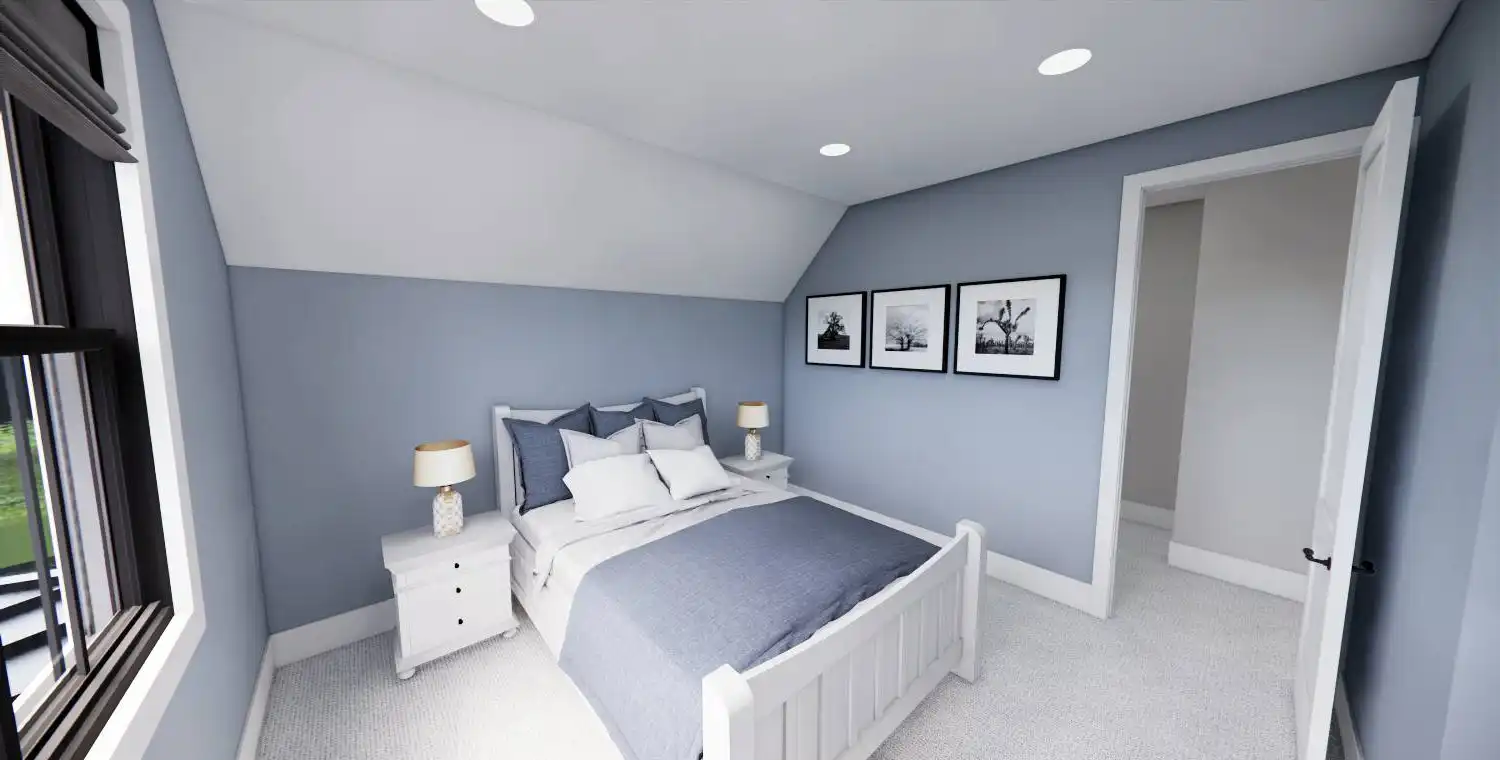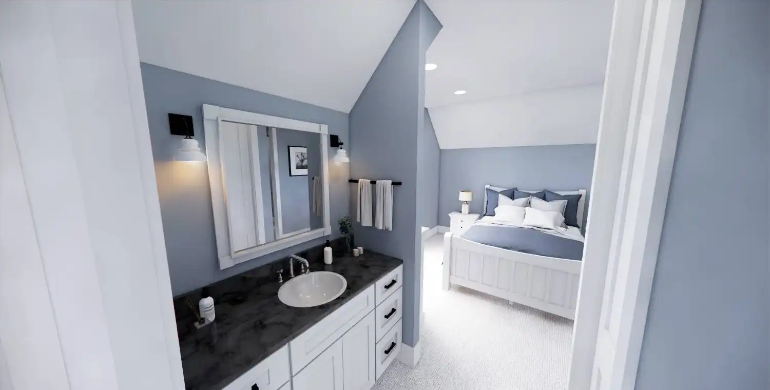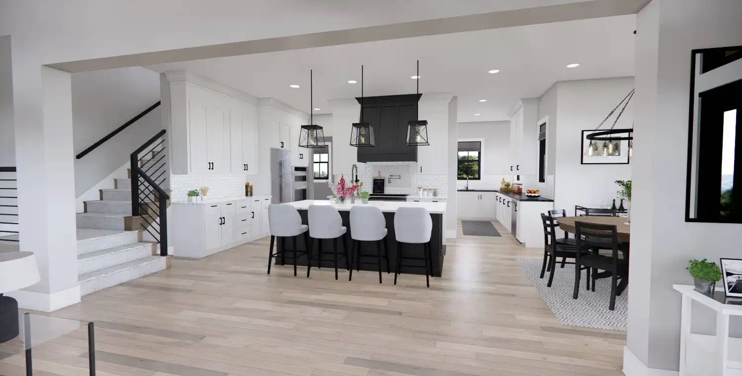 House Plan 10455 showcases a 3,482 sq. ft. contemporary farmhouse designed for both style and efficiency. This two-story home includes 4 bedrooms and 3.5 bathrooms, with a main-level master suite offering a luxurious bath and walk-in closet. The central living area features a two-story great room with a fireplace that seamlessly connects to the kitchen and dining space, fostering an open and welcoming environment. The kitchen is equipped with an island with seating for four, a walk-in pantry, and a prep kitchen, adding to its functionality. An expansive loft overlooks the great room below, providing additional living space. Expansive front and rear covered porches extend the living space outdoors, offering perfect spots for relaxation and gatherings. With its contemporary farmhouse aesthetics and thoughtful design, House Plan 10455 is ideal for those seeking a harmonious blend of comfort and functionality.