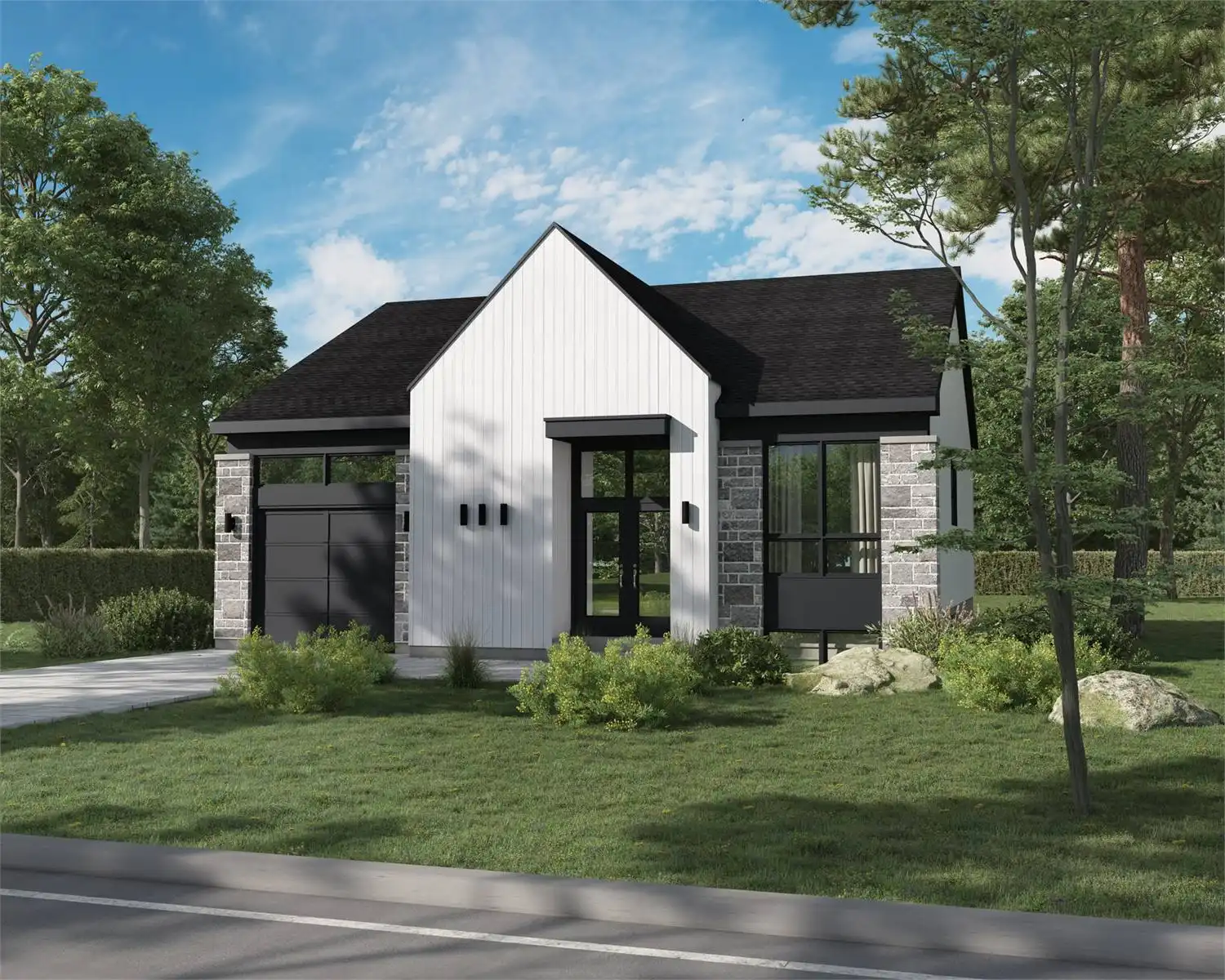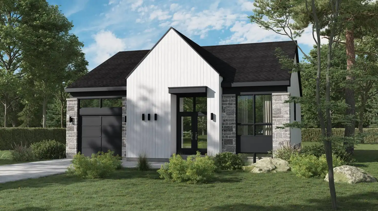 Check out House Plan 10456 if you want a cute little Scandinavian home to make your own! This design offers 1,405 square feet with two bedrooms and one bathroom. The bedrooms line up one side of the house, with one in front, followed by the bathroom, and the larger bedroom in back. Notice how the larger bedroom has direct access to the bathroom through the closet! On the other side of the house, there's a mudroom that connects the garage to the foyer, the laundry room, and open living with an island kitchen.