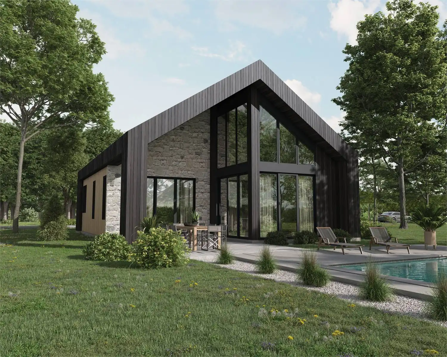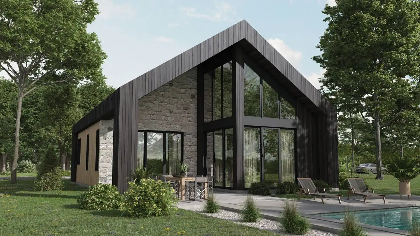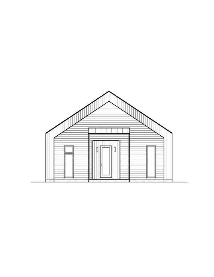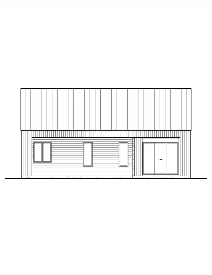 House Plan 10490 is a Scandinavian cottage with 960 square feet with one bedroom and one bathroom. Chic contemporary style all around and large windows make this a great home for a view lot! The interior has a totally open-concept layout that arranges the island kitchen, dining area, and living area up in a straight line. The bedroom has direct access to the four-piece bath, which also has a door to the hall for guests!