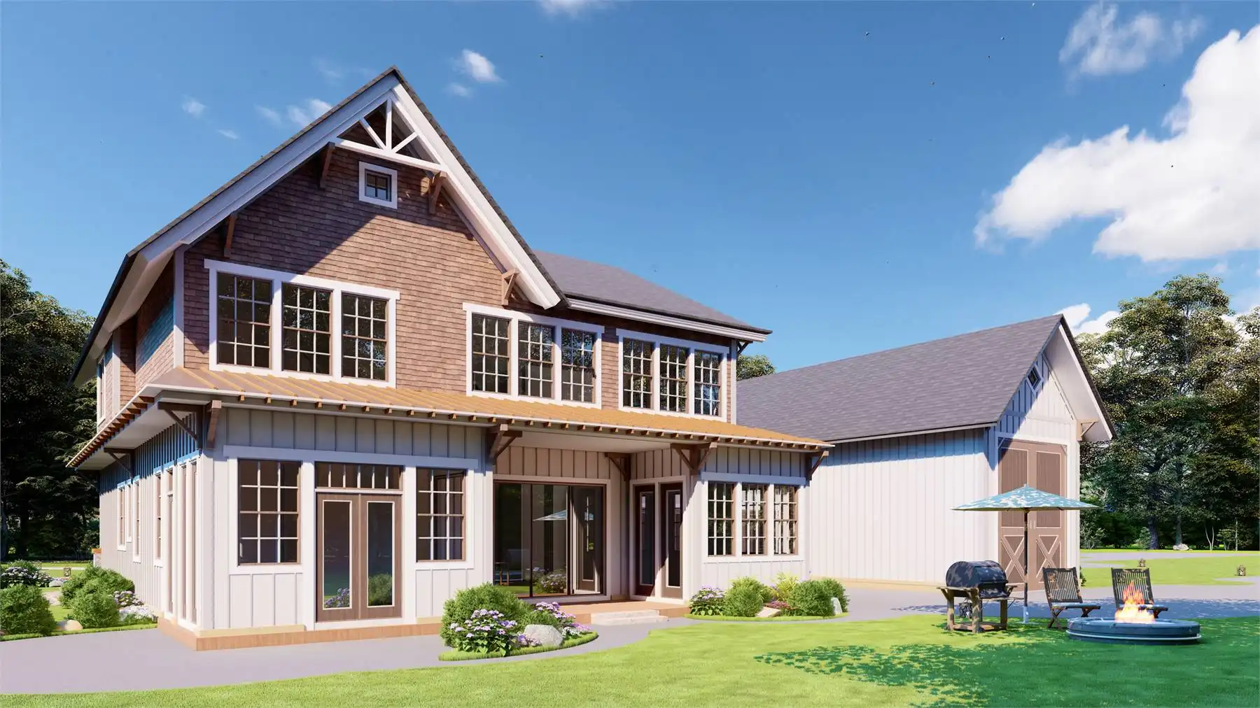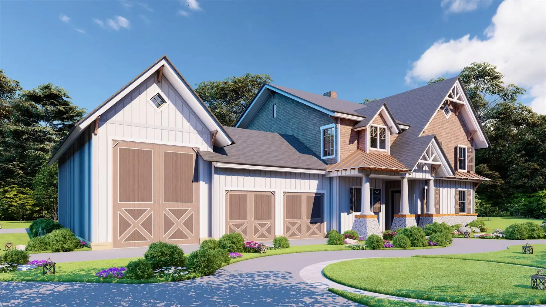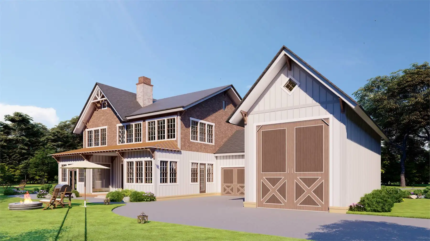 House Plan 10494 is a versatile two-story farmhouse that combines rustic charm with modern convenience. It features a two-car garage with front and rear drive-through access, perfect for moving farm equipment, plus a 16-foot ceiling RV garage for extra storage. The first floor offers a beautiful two-story lodge room that flows into an open-concept layout with an L-shaped kitchen, island, and family dining area. The primary bedroom on the main floor has direct access to a sunroom porch, creating a peaceful indoor-outdoor retreat. Upstairs, you’ll find two additional bedrooms and a flexible space that can be used as a fourth bedroom or extra living area, making House Plan 10494 practical and welcoming.