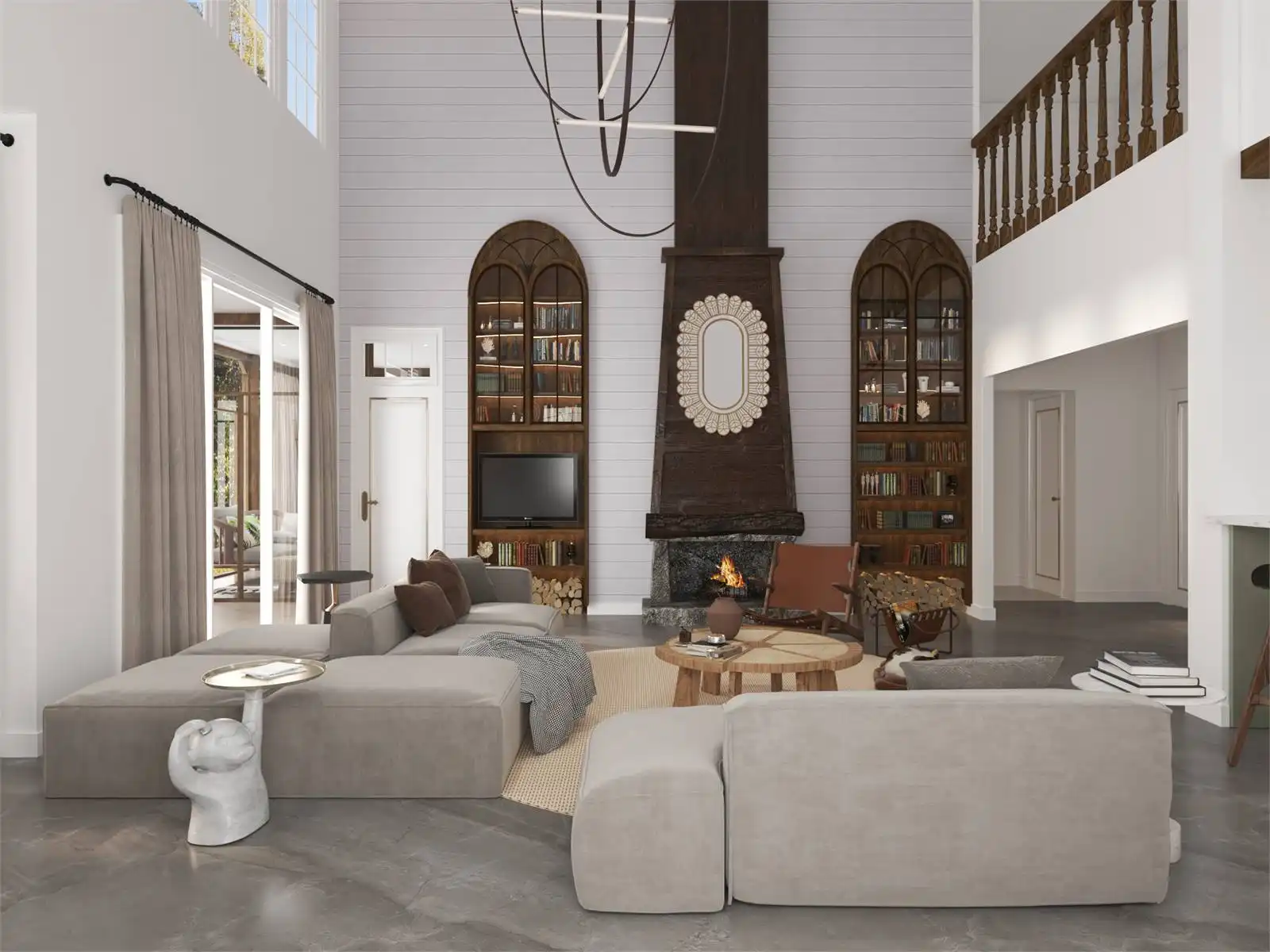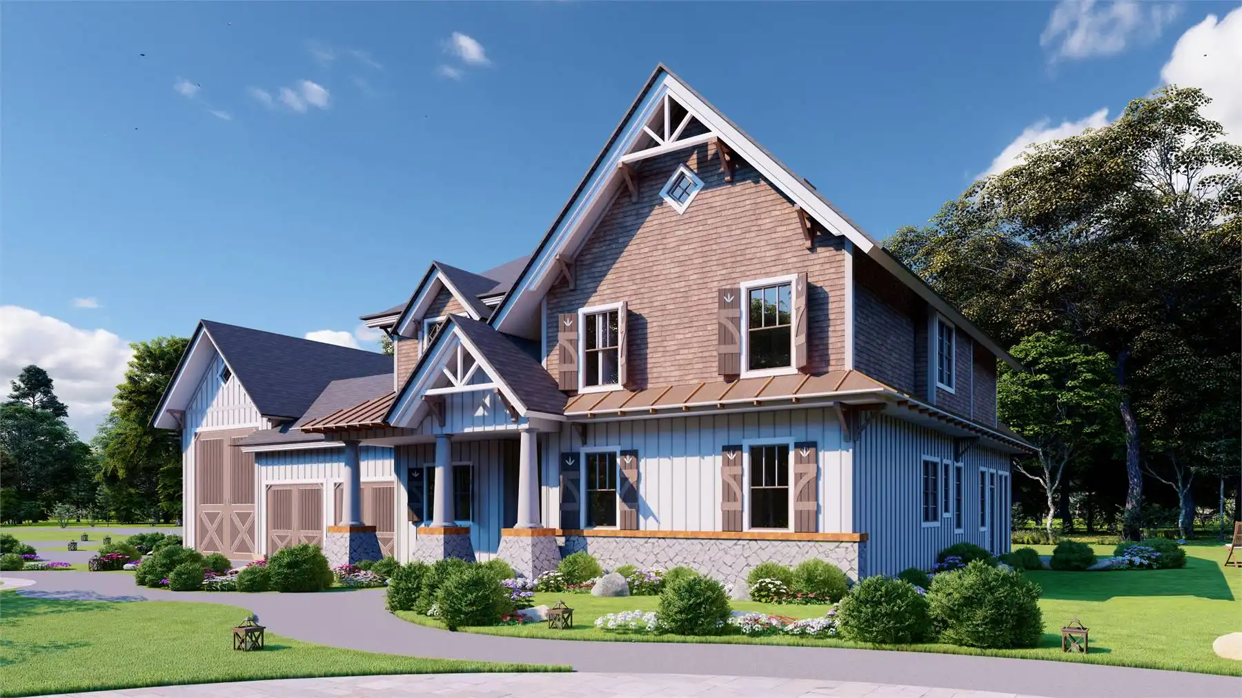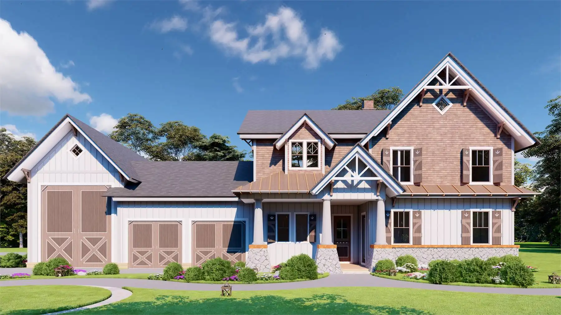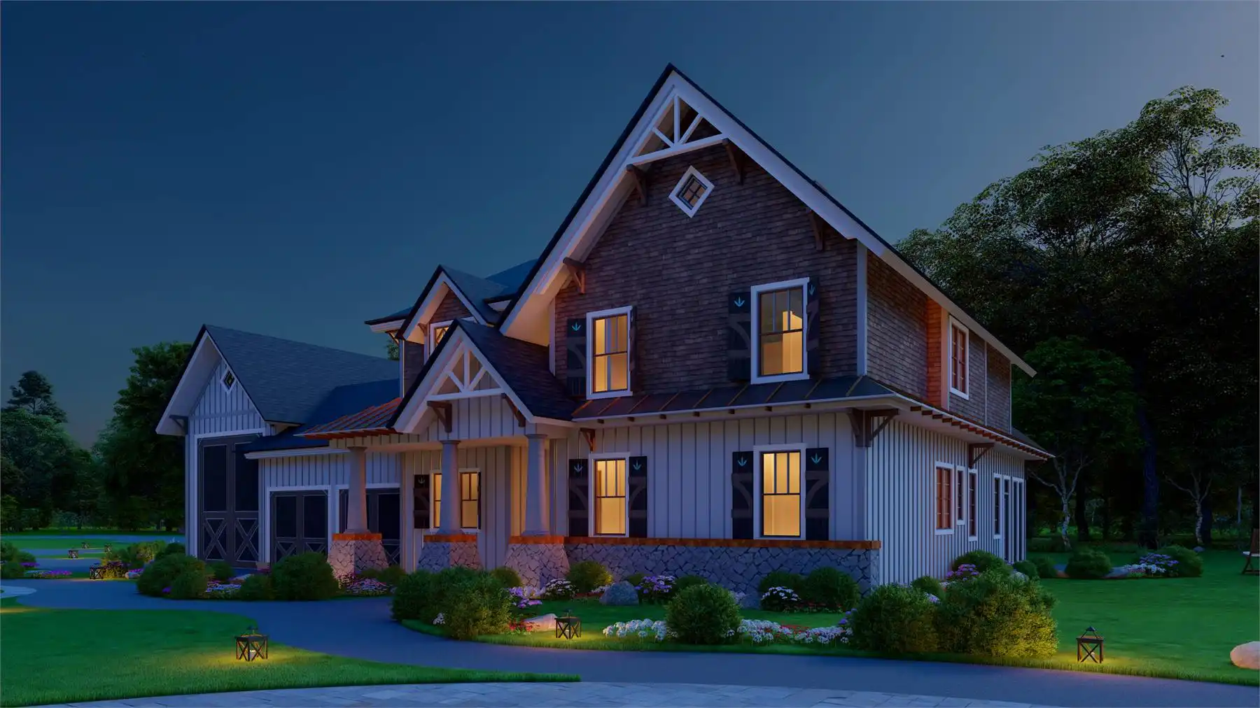 House Plan 10494 is a versatile two-story farmhouse that combines rustic charm with modern convenience. It features a two-car garage with front and rear drive-through access, perfect for moving farm equipment, plus a 16-foot ceiling RV garage for extra storage. The first floor offers a beautiful two-story lodge room that flows into an open-concept layout with an L-shaped kitchen, island, and family dining area. The primary bedroom on the main floor has direct access to a sunroom porch, creating a peaceful indoor-outdoor retreat. Upstairs, you’ll find two additional bedrooms and a flexible space that can be used as a fourth bedroom or extra living area, making House Plan 10494 practical and welcoming.