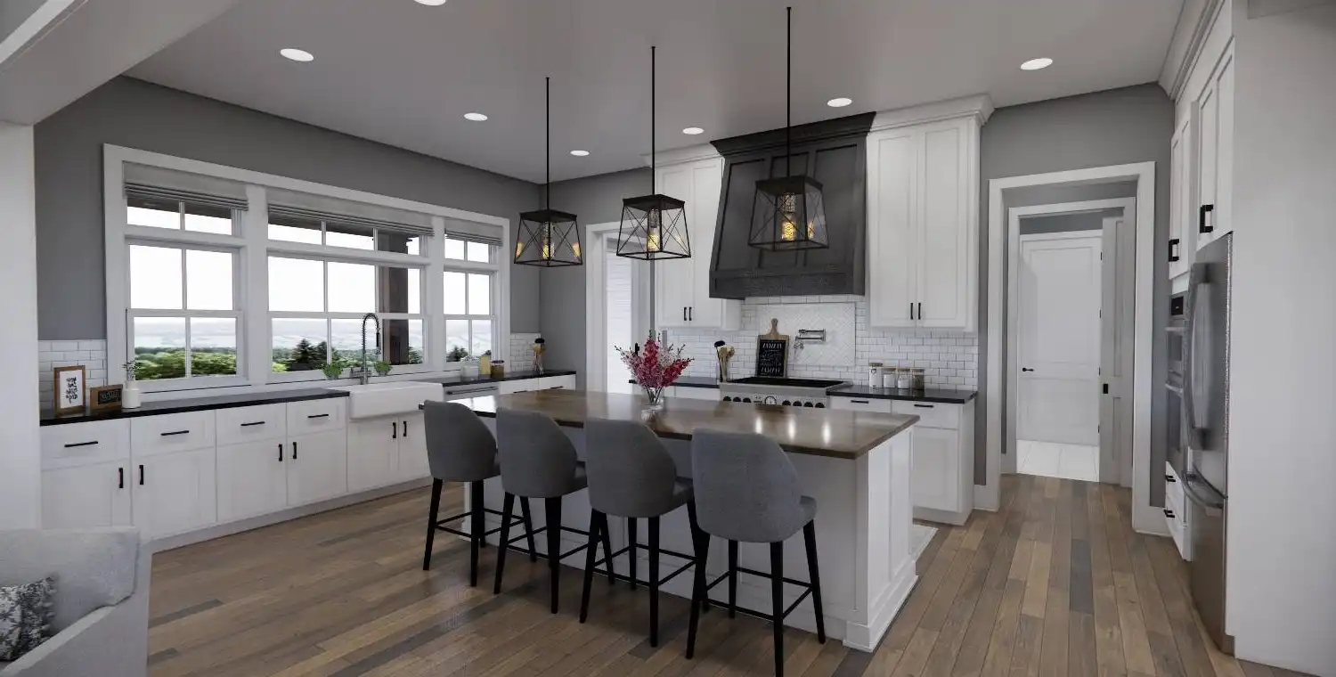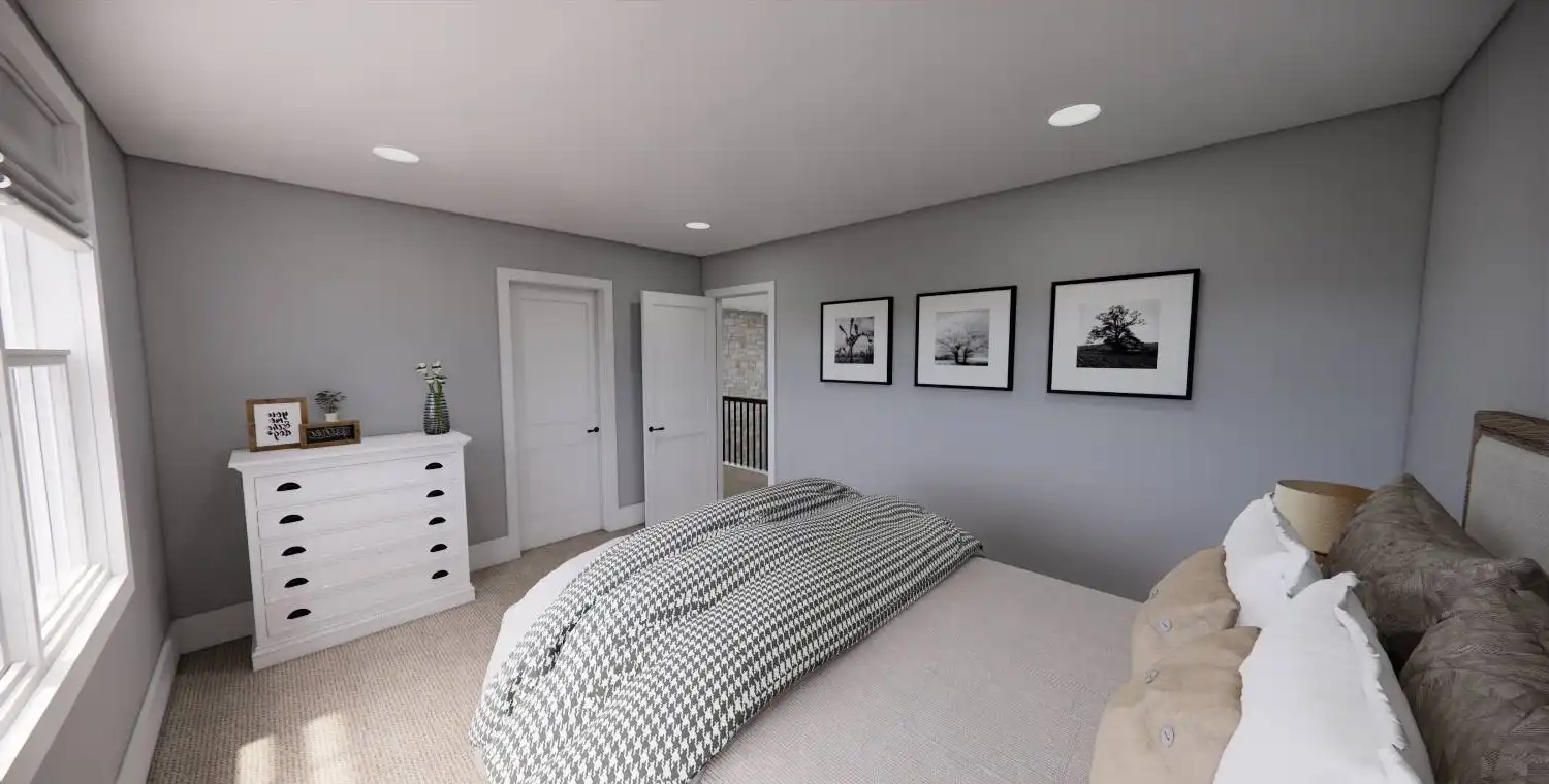 House Plan 10499 is a charming Country-style home offering 3,235 square feet of comfortable living space. With 5 bedrooms, 3 ½ bathrooms, and a 3-car garage, it’s perfect for a growing family. The inviting exterior features timber accents and a welcoming covered porch that leads into an airy foyer and open living area. The impressive two-story great room boasts an 18-foot ceiling, a beautiful fireplace, and sliding doors to a large covered rear porch. The chef’s kitchen includes a spacious island with seating for four, ample cabinetry, and a convenient prep pantry near the garage. The main level features a luxurious master suite and a private guest bedroom with its own bathroom. Upstairs, three more bedrooms with walk-in closets and a roomy loft provide plenty of space and flexibility. A front office with a wraparound desk and a dedicated laundry area add to the home's functionality.