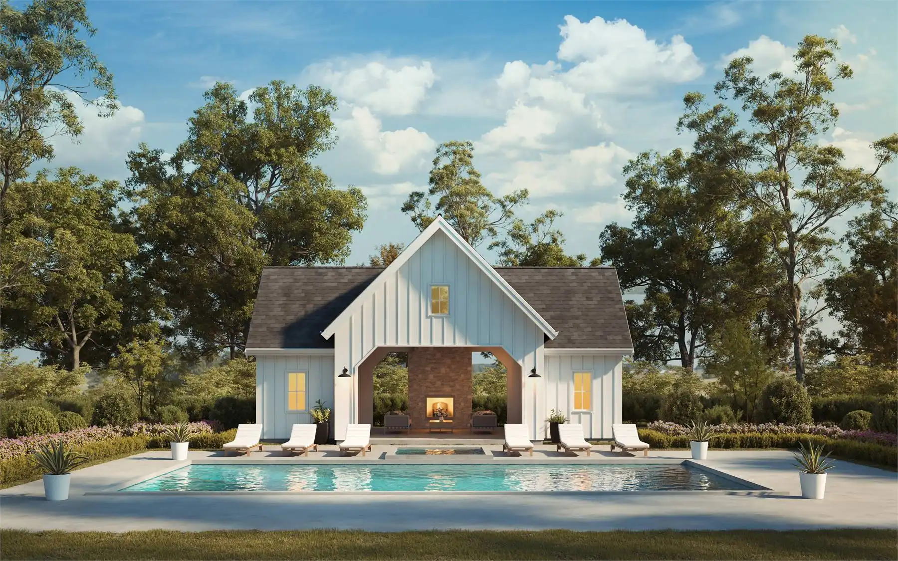 Got a pool? Or just want more outdoor living space? Plan 10508 is here for your consideration! It offers a lovely covered lounge area with a fireplace, a powder room, a changing room, and a mechanical room to serve your pool. It makes a great addition to an existing property where you'd like more comfortable outdoor potential!