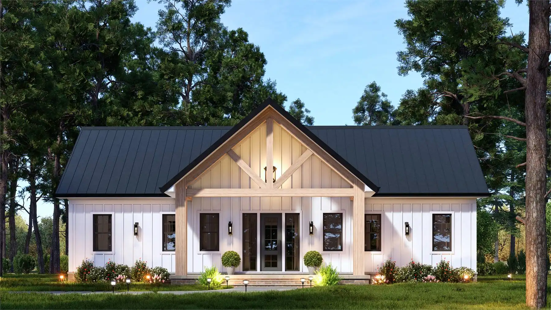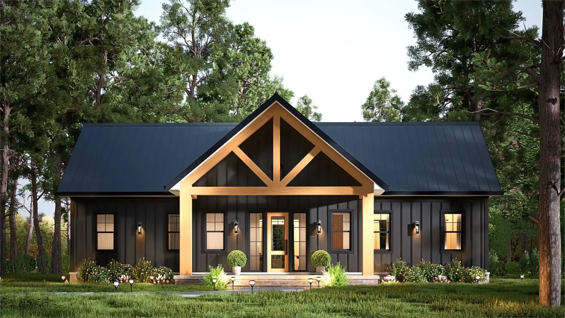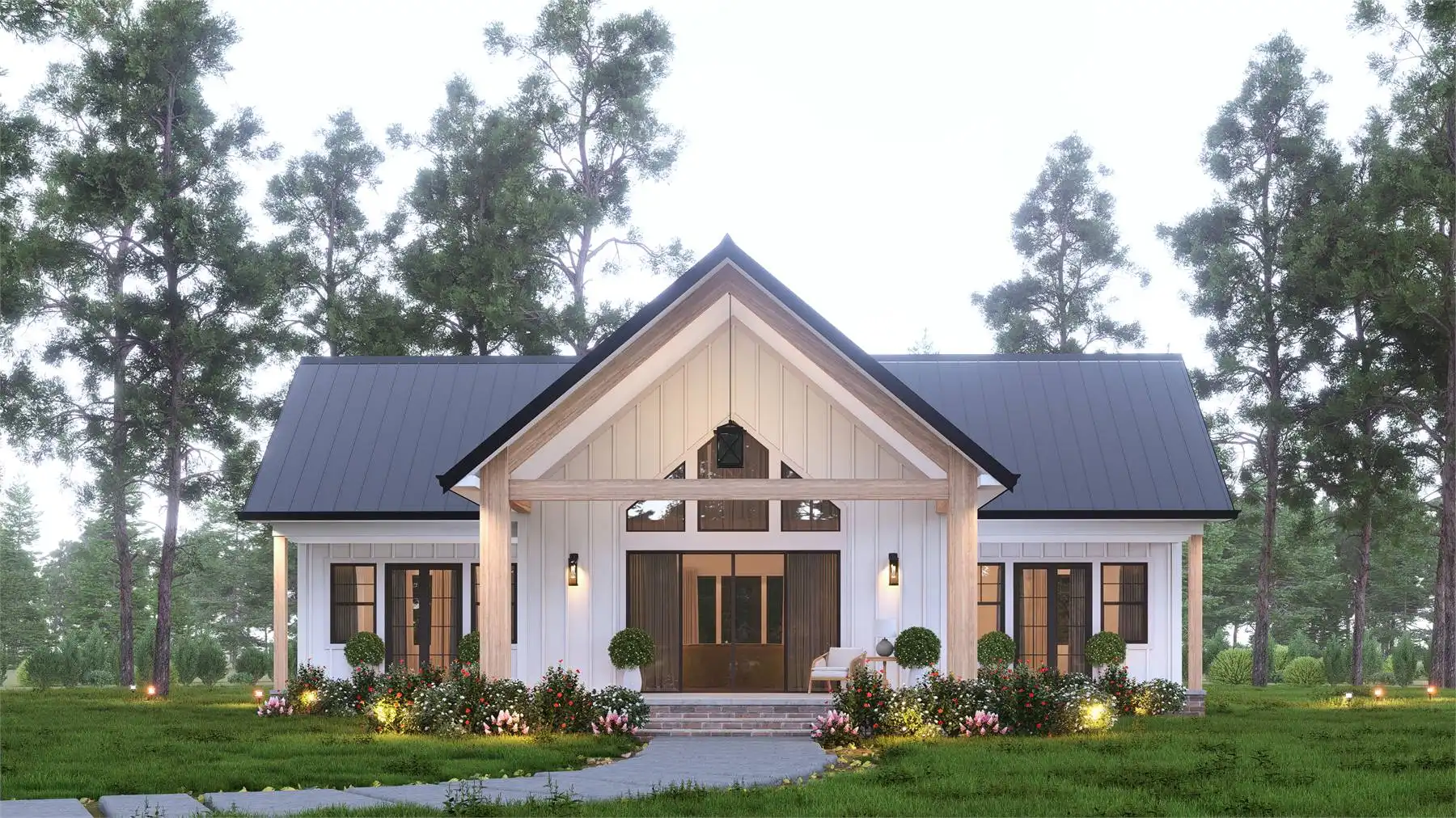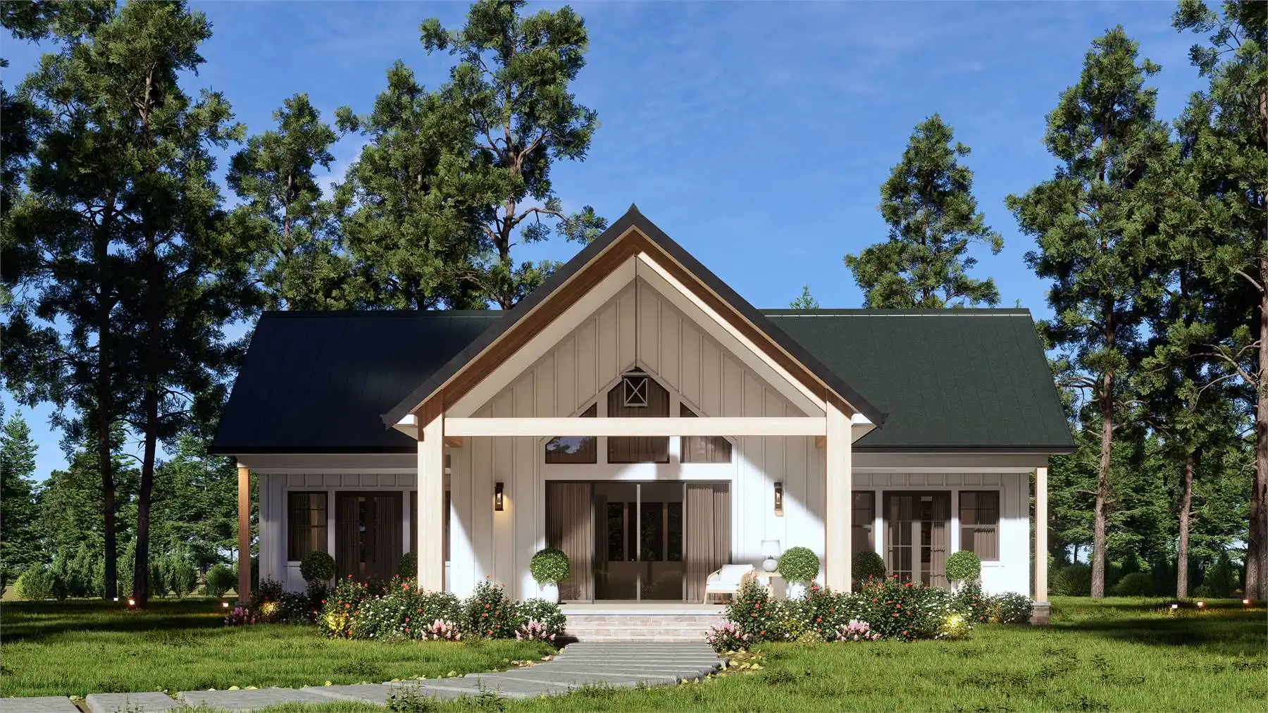 House Plan 10509 is a charming 1,392 square foot single-story ranch that blends cozy appeal with modern convenience. Featuring 2 bedrooms and 2 bathrooms, this inviting design offers an open and comfortable layout perfect for relaxed living. The keeping/family room showcases vaulted ceilings and a fireplace, creating a warm and airy atmosphere, while the kitchen impresses with a large island, walk-in pantry, and butler’s pantry for ample storage and prep space. Outdoor living shines with a covered front porch spanning 177 square feet and a spacious rear porch measuring 540 square feet, perfect for relaxing or entertaining. Built on a slab foundation with stick-framed roofing and a 10:12 roof pitch, this home measures 56 feet wide by 55 feet deep, with a building height of 21 feet 11 inches and a first-floor ceiling height of 10 feet 1 inch. House Plan 10509 offers modern living with timeless ranch-style appeal.