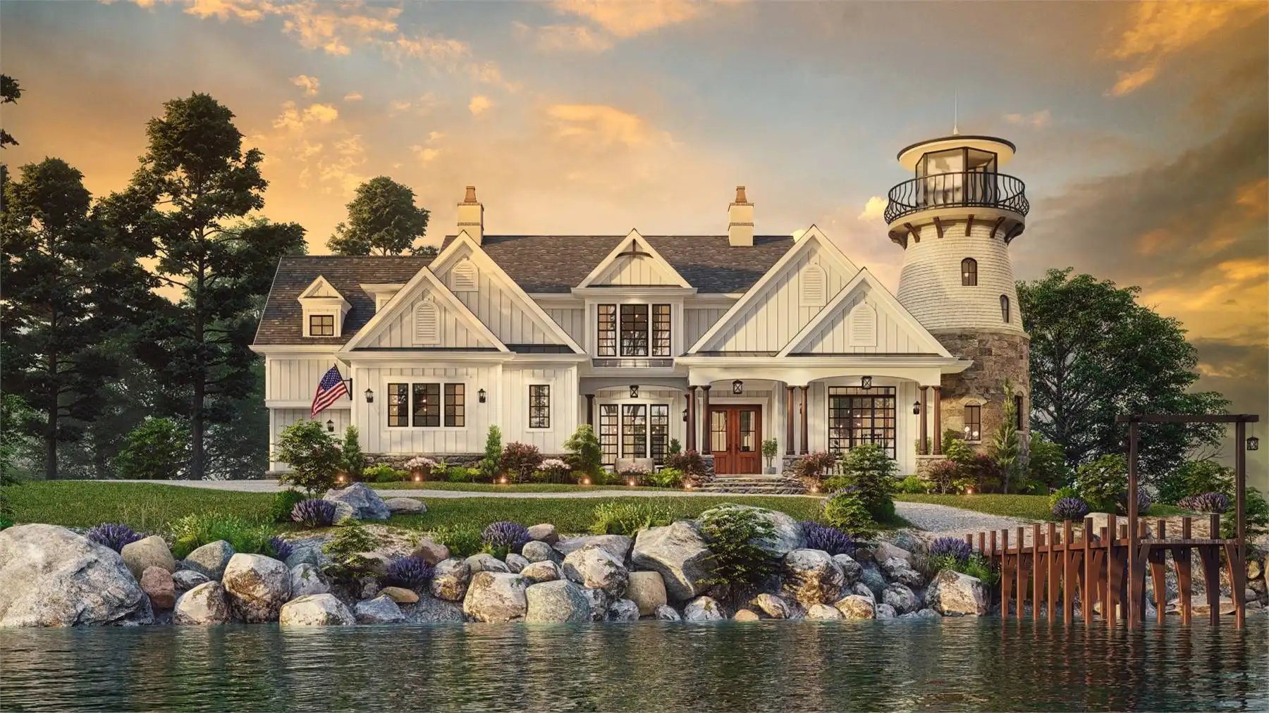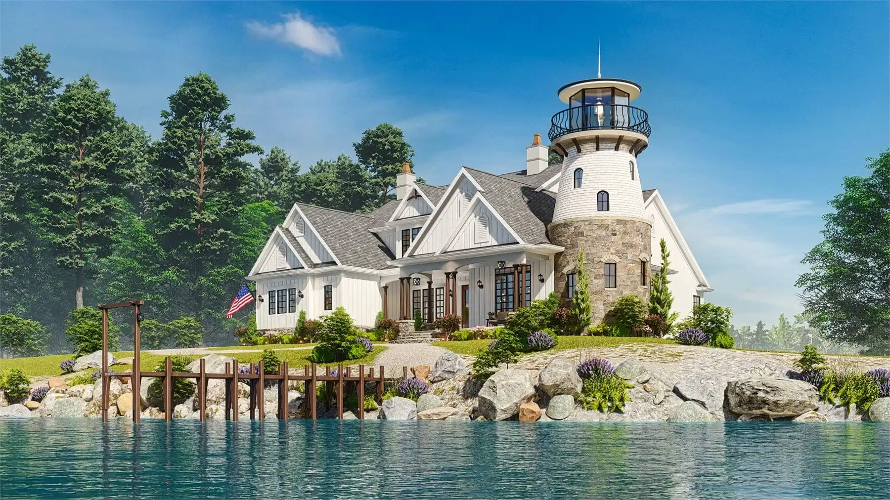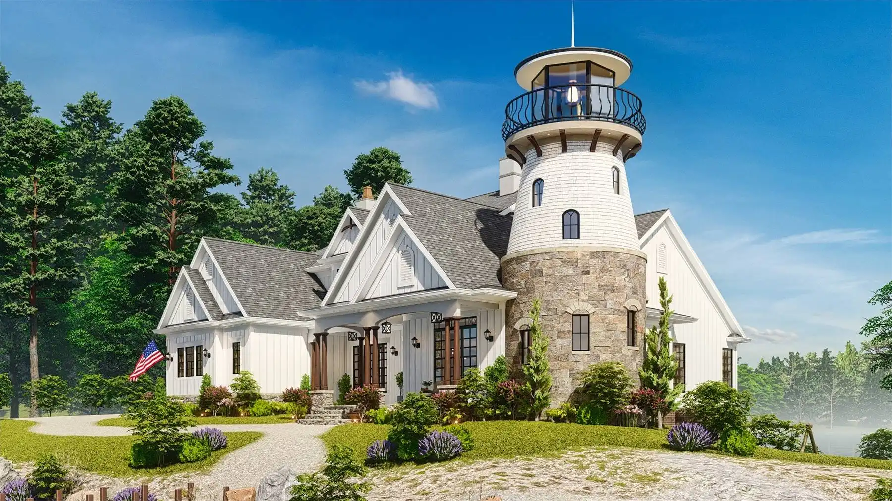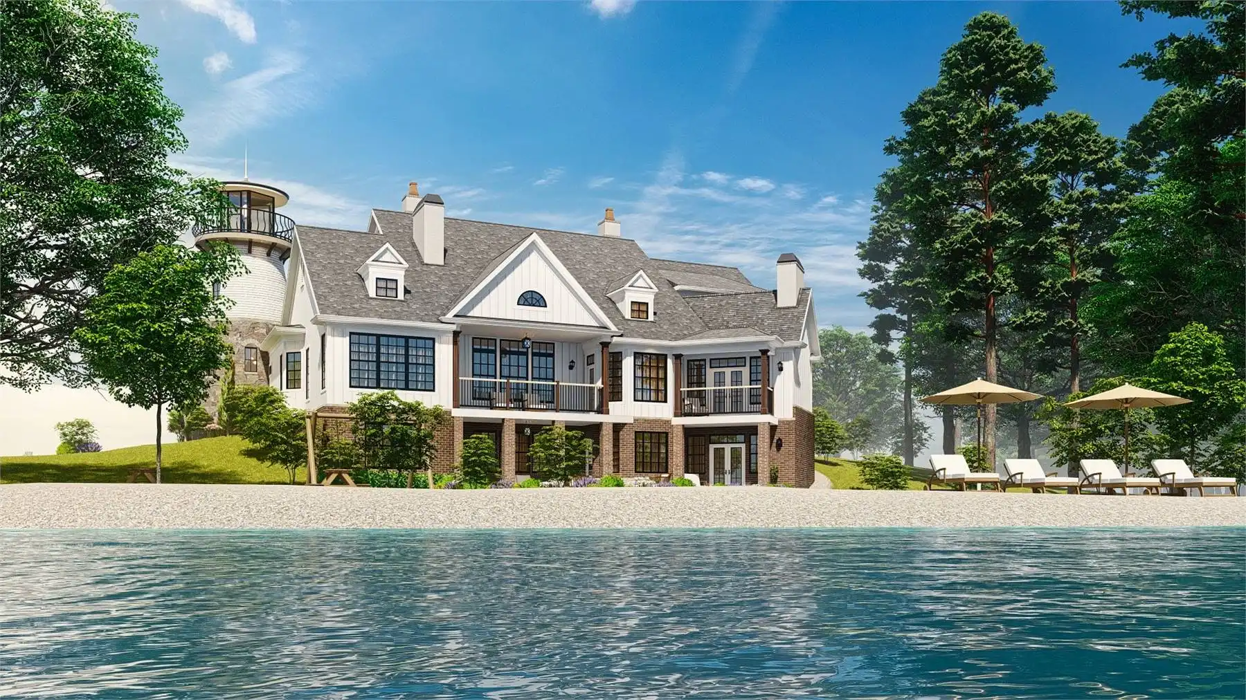 House Plan 10510 is an enchanting coastal-inspired home that combines timeless elegance with captivating architectural design. This two-story home draws inspiration from classic lighthouses, featuring a striking central tower as a dramatic focal point. The main level offers an open-concept layout with a spacious great room, dining area, and gourmet kitchen—perfect for hosting gatherings. The luxurious master suite includes a cozy sitting area and spa-like bathroom for ultimate relaxation. The upper levels provide additional bedrooms and bathrooms, ensuring privacy and comfort for all. Expansive windows throughout the home fill the interior with natural light while showcasing panoramic views of the surroundings. Multi-level decks and porches offer inviting outdoor spaces ideal for lounging and dining. With its unique lighthouse-inspired design and thoughtfully crafted layout, House Plan 10510 provides an exceptional living experience that embraces the beauty of coastal living.