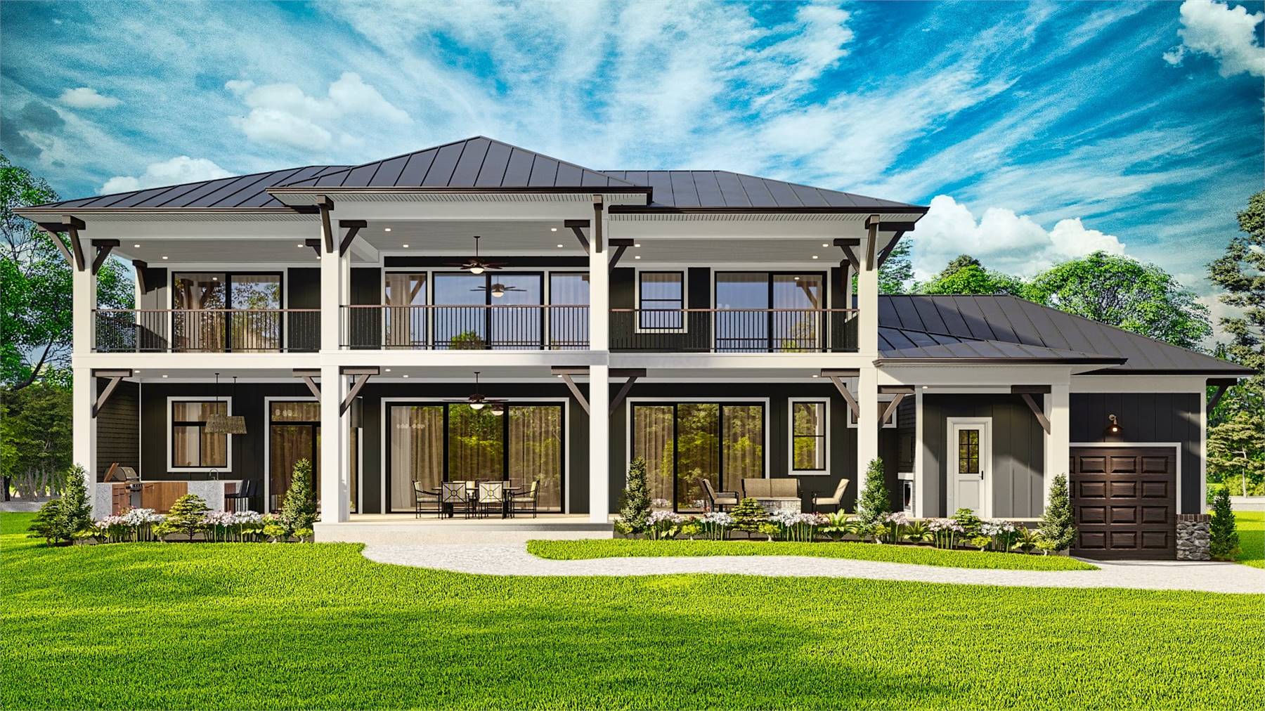 Designed for comfort and entertaining, House Plan 10546 is a grand two-story Traditional home with lakefront appeal and a 5-car garage. The main level welcomes you with a soaring two-story foyer and leads into a spacious family room with a fireplace and built-ins. A gourmet kitchen with bar seating, wine room, mud room, office, laundry, and covered rear porch create a functional and inviting flow. The main-floor master suite includes a private entry, his and her closets, and a luxurious bath. Upstairs features a game room, safe room, study, additional covered porch, and four private bedrooms, each with its own ensuite bath and walk-in closet—perfect for family and guests alike.