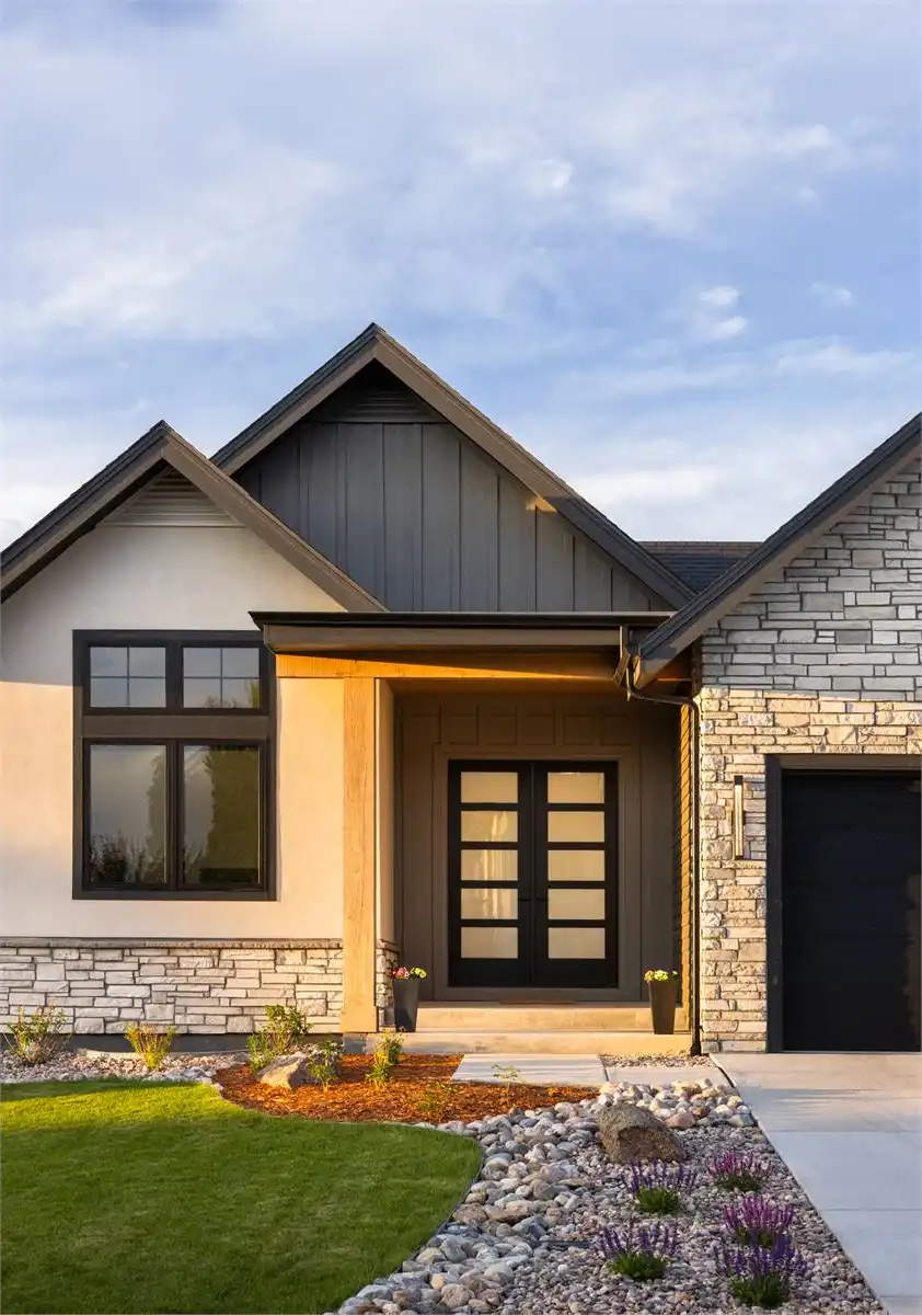 House Plan 10520 is a chic mountain-style ranch with a front-facing three-car garage and 2,163 square feet of main-level living space. This split-bedroom design includes 2 bedrooms and 2.5 bathrooms, offering plenty of privacy with the first bedroom at the front of the home and the luxurious primary suite tucked away on the left side. The primary suite features a spa-like bathroom with a soaker tub, walk-in shower, dual vanities, and a spacious walk-in closet. The open-concept layout includes a chef-inspired U-shaped kitchen with ample counter space and a large central island, all flowing into the great room and dining area with access to a generous rear outdoor living space. An optional lower level doubles the square footage and adds 2 more bedrooms, a full bath, and a spacious rec room.