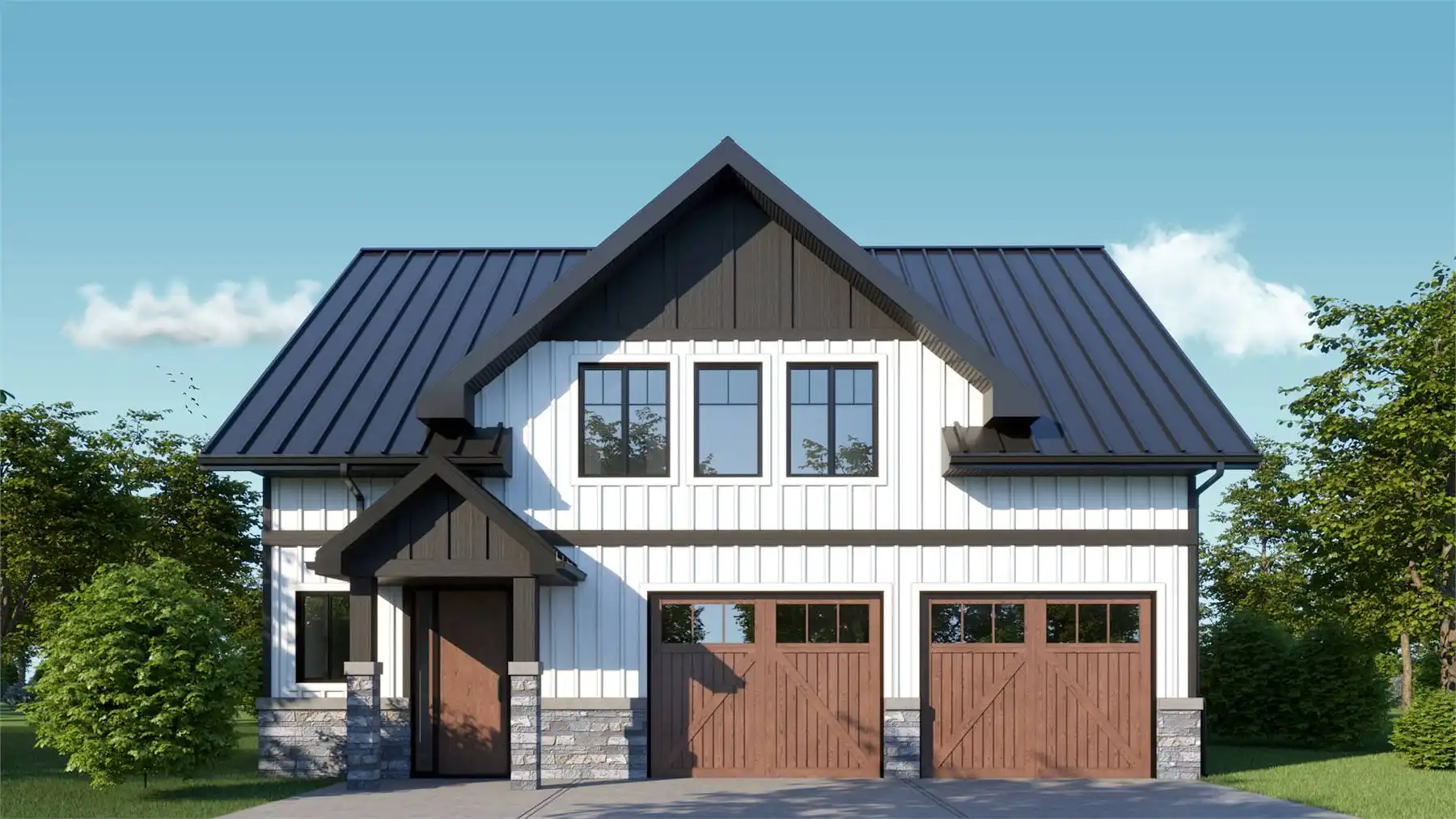 House Plan 10533 is a multi-purpose garage and ADU that promises to add so much functionality to your property! The main level includes a two-car garage, a full bath, a bar with lounge space, and access to the ADU apartment above with laundry by the entry. The 1,180-square-foot apartment offers one bedroom, one bathroom, an office, and open living with a G-shaped kitchen. There's even a deck off the living space! This kind of design is ideal for hosting parties and long-term guests!