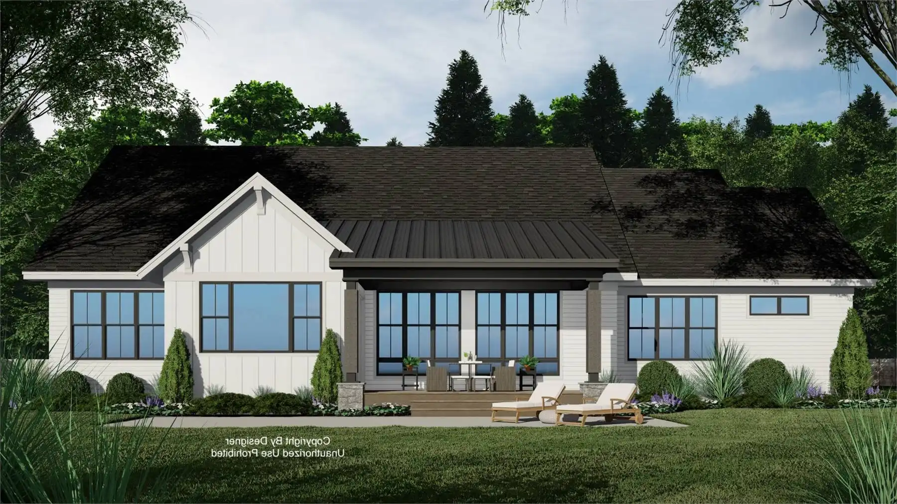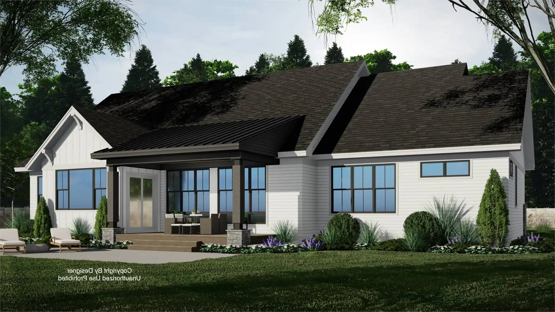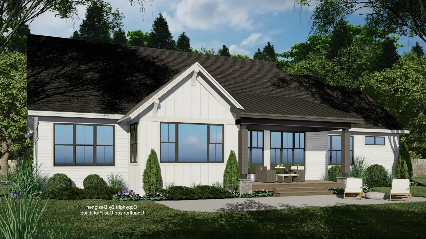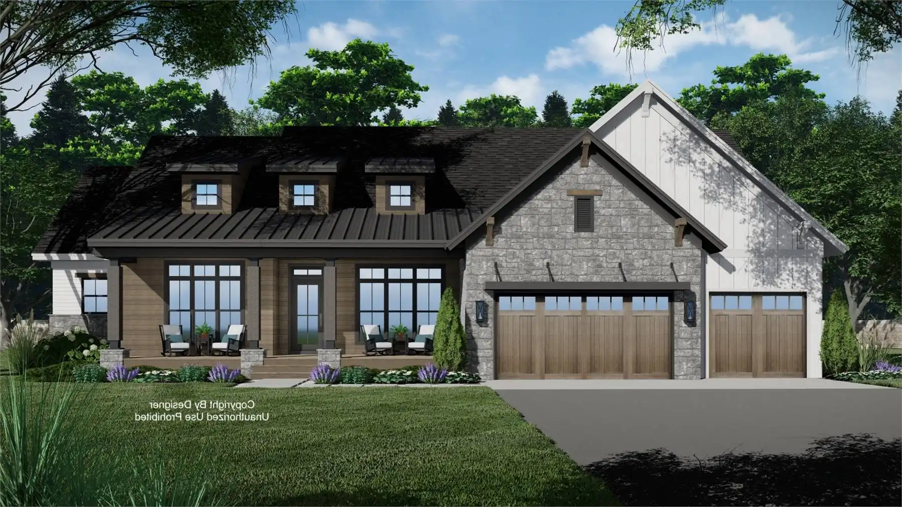 Welcome to House Plan 10544, a beautifully crafted Country-style home that combines rustic charm with modern functionality. Spanning 2,600 square feet, this design features 2 bedrooms, 2 bathrooms, and a 3-car garage. The open-concept layout is filled with natural light, showcasing an impressive kitchen with a massive island that seats seven and a walk-in pantry conveniently located near the garage entry. The great room centers around a cozy fireplace with built-ins and flows seamlessly into the dining area, which opens to a spacious rear porch—ideal for outdoor living. The main-floor master suite offers a serene retreat with a spa-like bath and generous walk-in closets. Additional highlights include a rear corner office, mudroom with storage, laundry area, and expansive covered front and rear porches perfect for enjoying scenic views.