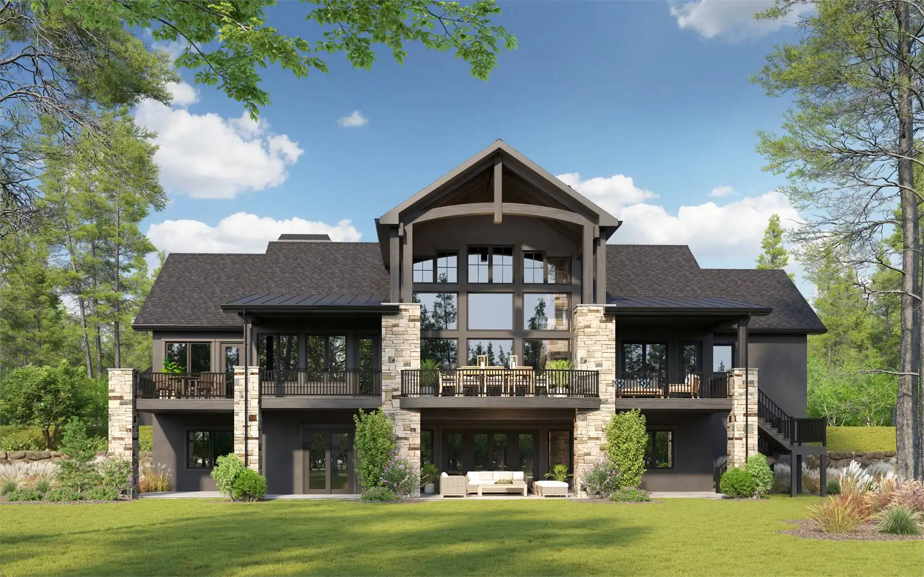 House Plan 10577 is a mountain-inspired Craftsman home offering 2,991 square feet of comfortable main-level living. Inside, you'll find 2 bedrooms and 2.5 bathrooms, including a private primary suite with a spa-like bath and a flexible guest room or office. The vaulted great room flows seamlessly into the kitchen and dining areas, creating an open and inviting environment. A 4-car angled garage provides both visual appeal and practical convenience. Expand your living space with the optional 2,304 sq. ft. finished lower level that includes 3 more bedrooms, a rec room with a wet bar, and generous storage. Ideal for families, multigenerational living, or vacation getaways, this plan balances rugged beauty with smart design.