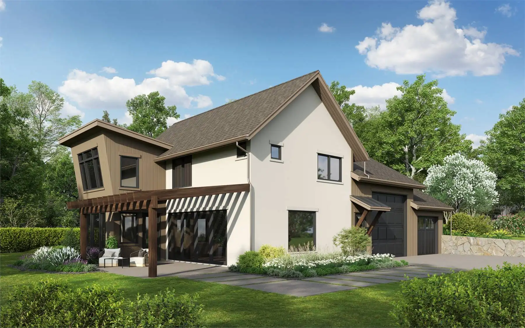 House Plan 10601 is a unique design with a large garage on one side and a two-story home on the other. The interior offers 1,803 square feet with three bedrooms and three bathrooms. The main level is comprised of the open living great room with an island kitchen, a huge walk-in pantry, and a full bath by the entry from the garage. Upstairs, there's a primary suite, a pair of Jack-and-Jill bedrooms, and the laundry. The garage as two bays--one regular, one oversized--as well as a shop sink and a storage room. This is a flexible design that makes a great home or ADU!