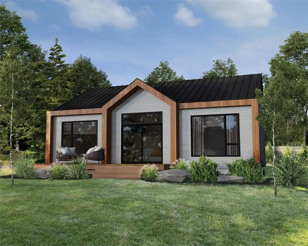 This quaint take on a modern cottage would be perfect for a vacation home, or even just as a home to downsize to and lower your upkeep. The 1 story 2 bedroom, 1 bath home has an open concept design. Entering from the sliding doors off the 10’ deep front deck, you’ll immediately be in the open concept spaces of the living area, kitchen and casual dining. There’s a centrally located fireplace anchoring the spaces.Both bedrooms claim the left side of the home and have access to the large full bathroom that also has a space for a W/D.