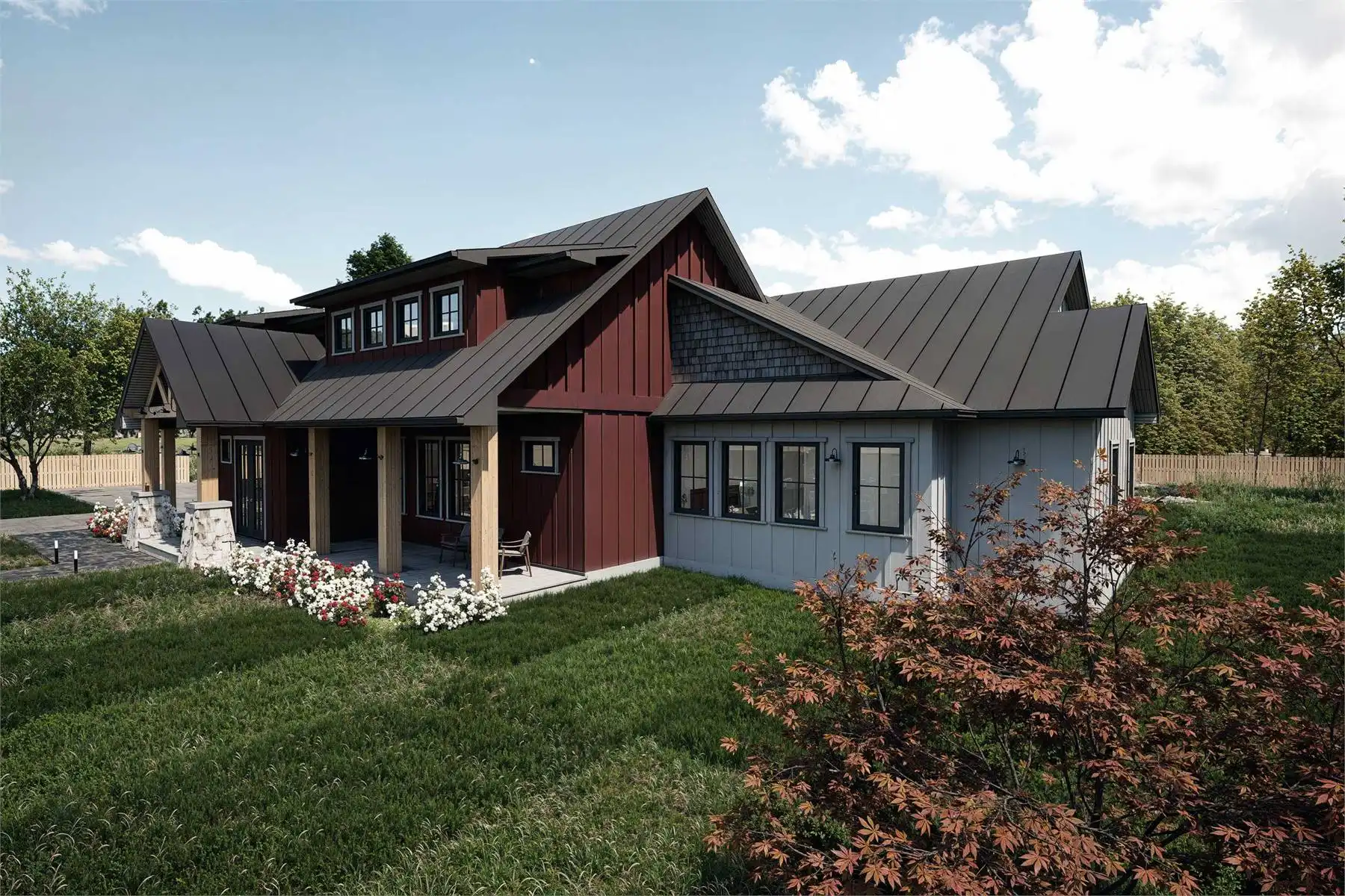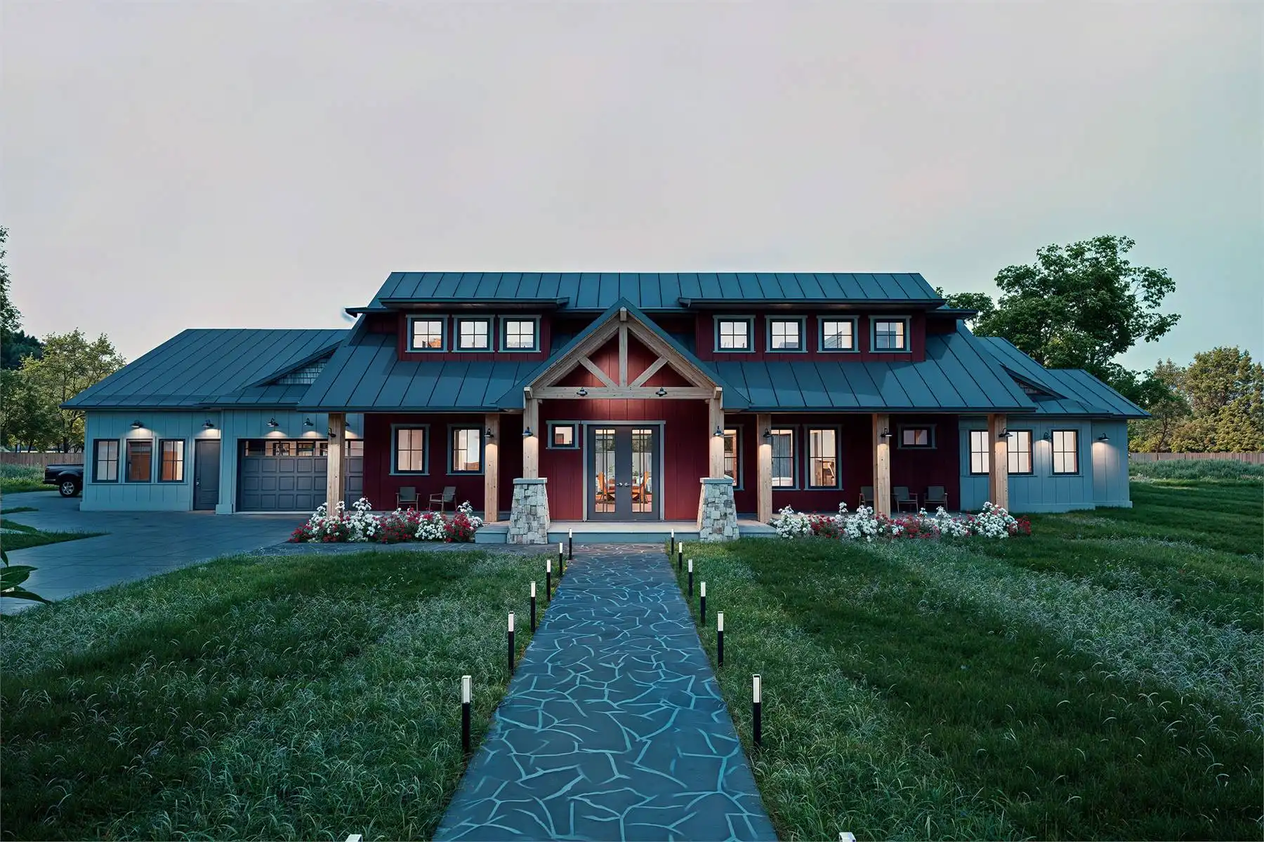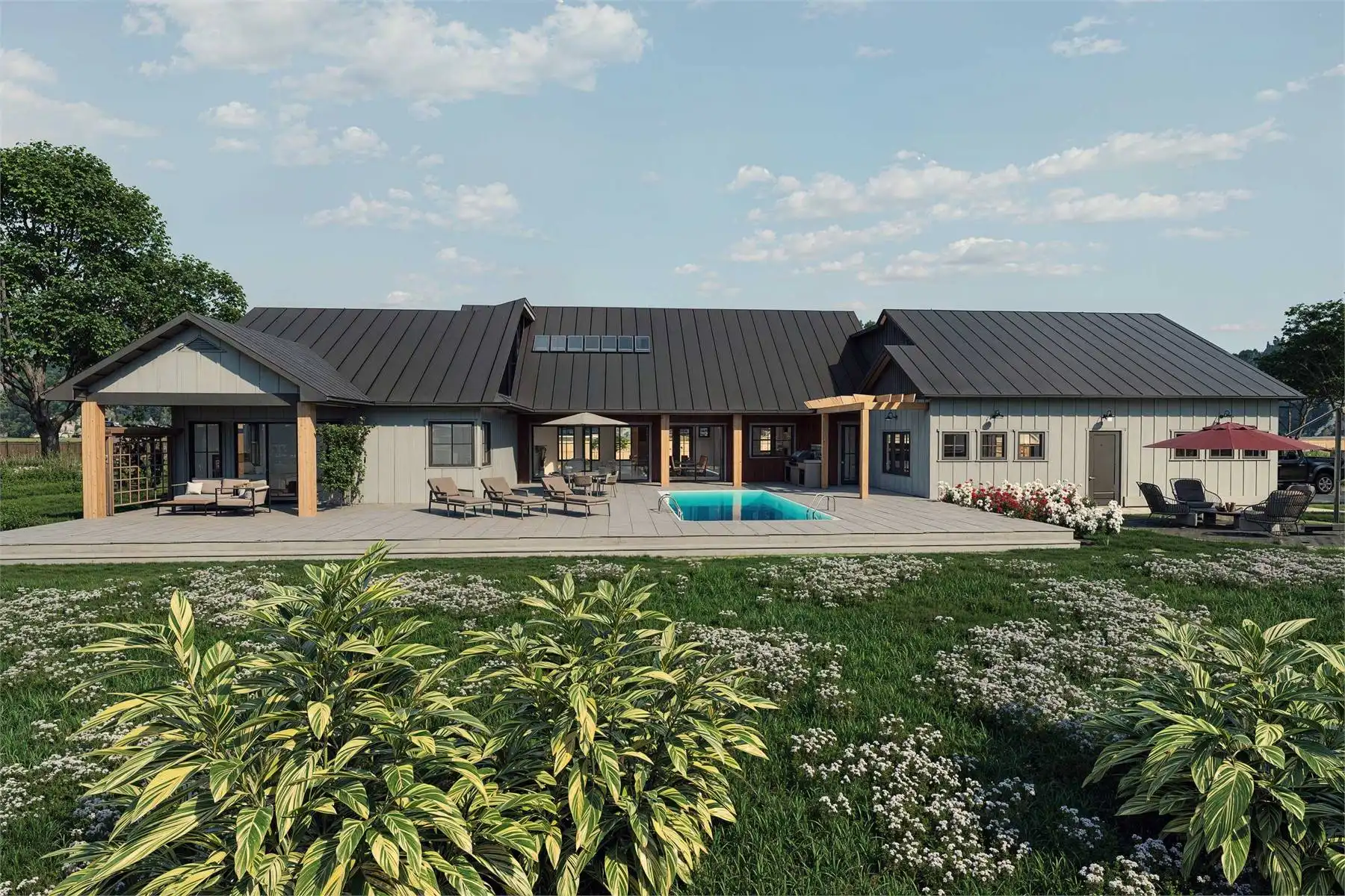 Looking for a sprawling country home to make your own? See if House Plan 10611 is the perfect fit! With 3,111 square feet, three bedrooms, and four-and-a-half bathrooms in addition to a huge five-car garage and extensive outdoor living, this design is sure to check a growing family's boxes. The layout places the two-story great room in the center of the floor plan, with a U-shaped island kitchen looking clear across to the fireplace in the living area. Off the living space, there's a hallway that groups the bedrooms and the powder room. All the bedrooms are suites! The primary suite has a five-piece bath while the other two have three-piece baths. The staircase in this hallway leads up to the loft overlooking the great room. It's imagined as office space, but you can make it whatever you need. Behind the kitchen, you'll find the garage through the mudroom. It has two front bays, three side bays, extra space for a workshop, and a full bath that also has exterior access to serve the outdoor living area with an outdoor kitchen in back. Talk about a plan that covers the bases!
