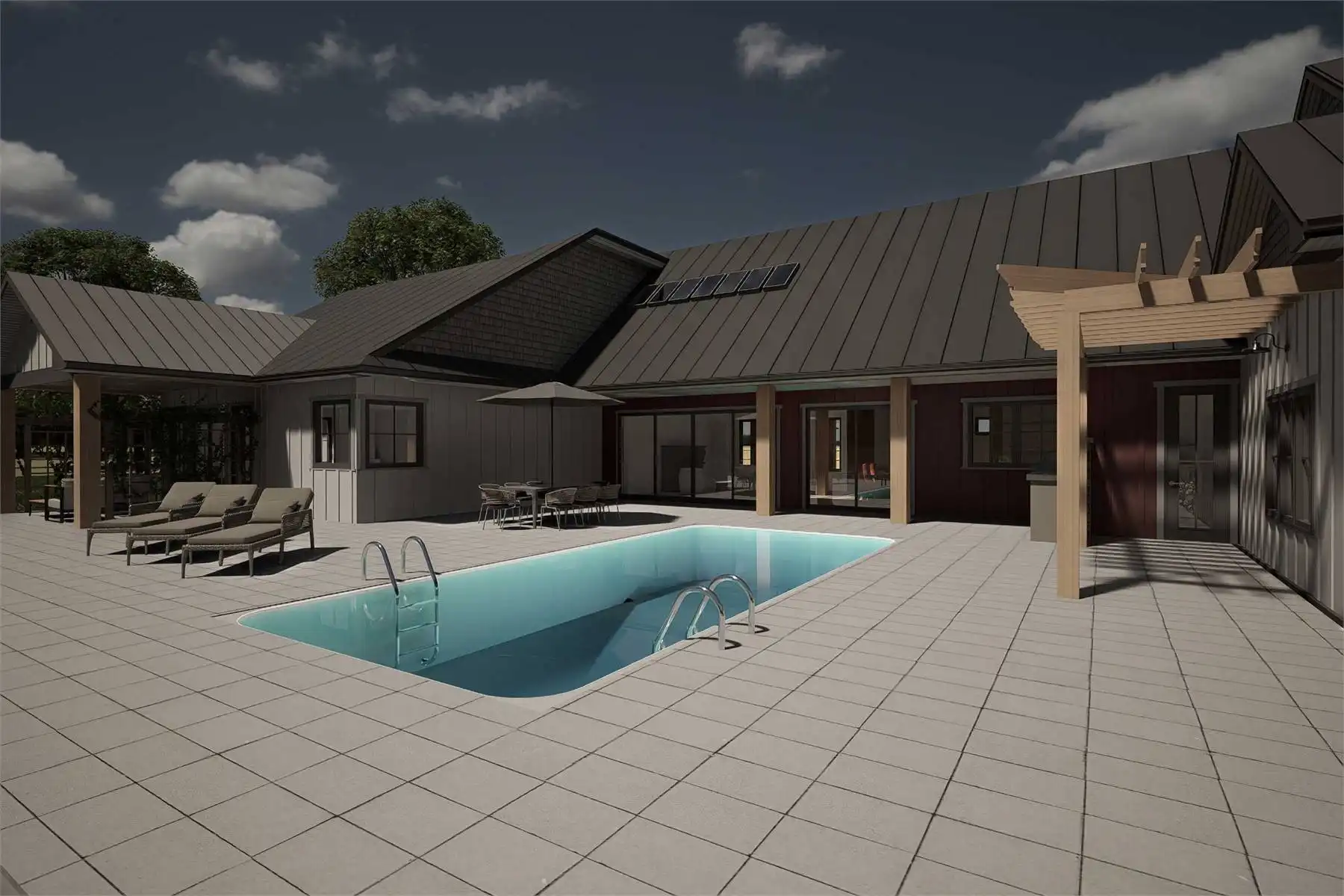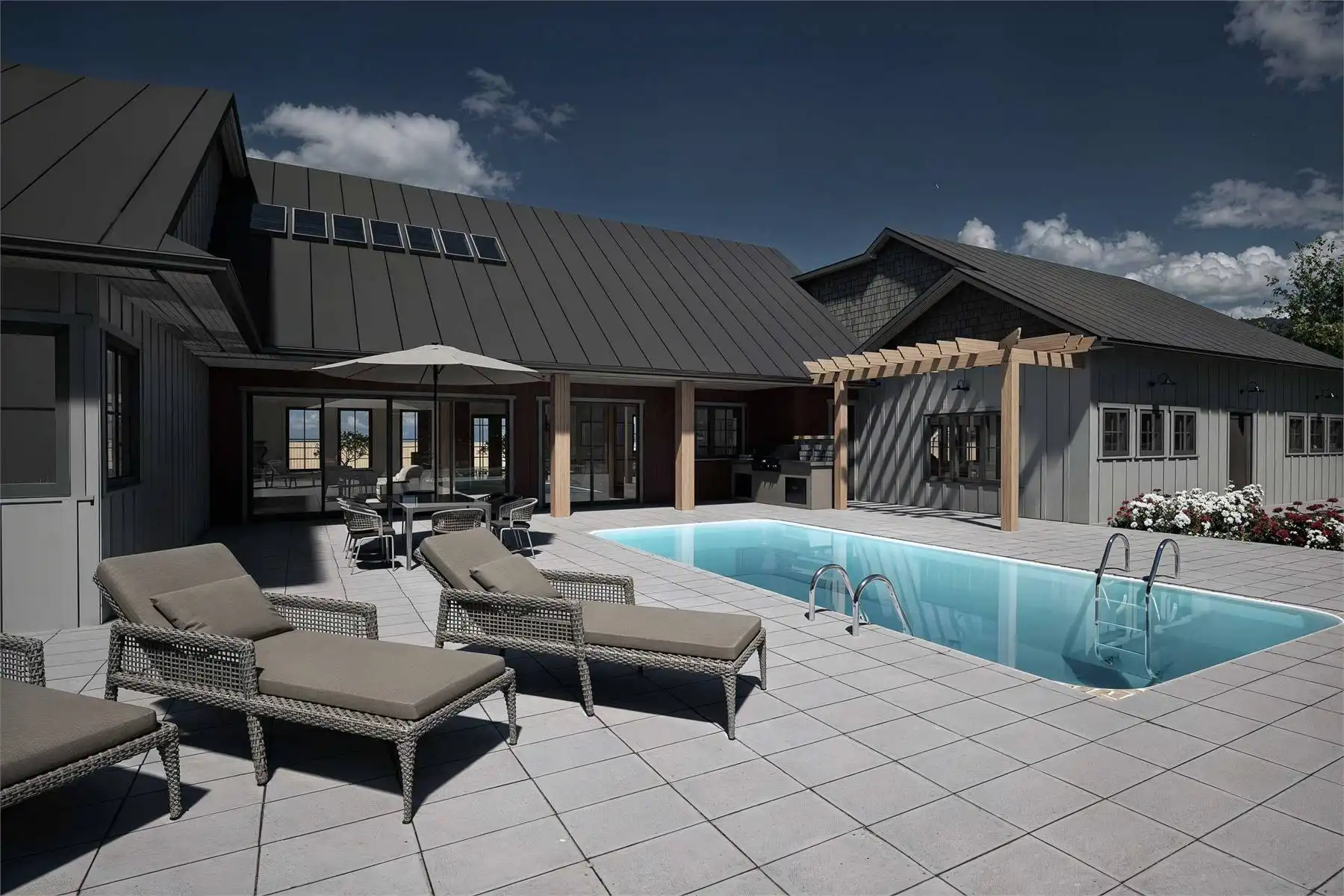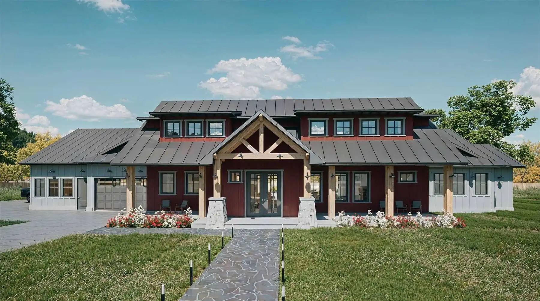 Looking for a sprawling country home to make your own? See if House Plan 10611 is the perfect fit! With 3,111 square feet, three bedrooms, and four-and-a-half bathrooms in addition to a huge five-car garage and extensive outdoor living, this design is sure to check a growing family's boxes. The layout places the two-story great room in the center of the floor plan, with a U-shaped island kitchen looking clear across to the fireplace in the living area. Off the living space, there's a hallway that groups the bedrooms and the powder room. All the bedrooms are suites! The primary suite has a five-piece bath while the other two have three-piece baths. The staircase in this hallway leads up to the loft overlooking the great room. It's imagined as office space, but you can make it whatever you need. Behind the kitchen, you'll find the garage through the mudroom. It has two front bays, three side bays, extra space for a workshop, and a full bath that also has exterior access to serve the outdoor living area with an outdoor kitchen in back. Talk about a plan that covers the bases!