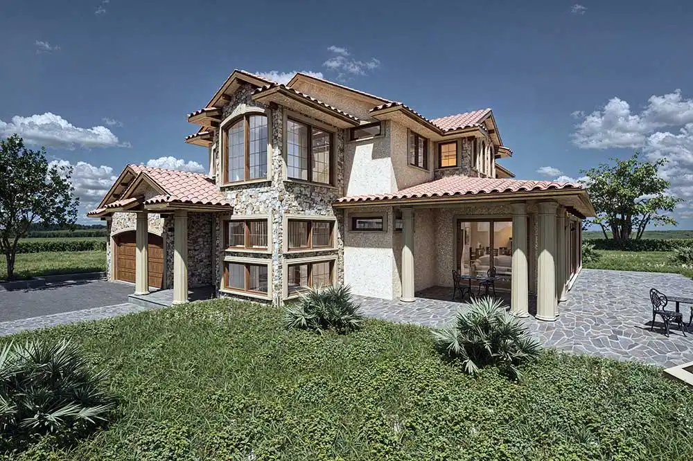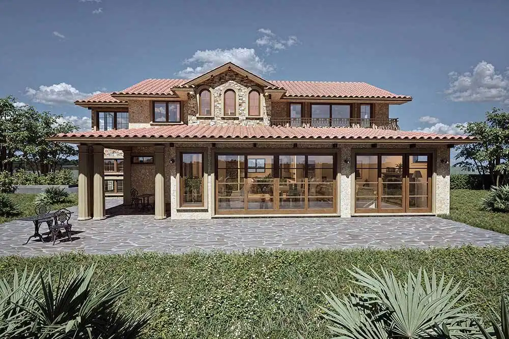 House Plan 10615 is a stunning Tuscan home design that's sure to impress anybody looking for a Mediterranean-style house! It offers 2,994 square feet with four bedrooms, three-and-a-half bathrooms, and a two-car garage. The main level includes the open-concept living with a U-shaped island kitchen beside the living and dining areas, which have a wall of patio doors that open up to the wraparound porch. There's also a den, a prep kitchen, the powder room, and the laundry/mudroom. Upstairs, the bedrooms include a luxurious five-piece primary suite with dual closets and a private deck, a guest suite with a three-piece bath, and a pair of Jack-and-Jill bedrooms. Make sure to explore the floor plans, because this design has so much to offer wrapped up in outstanding Tuscan style!