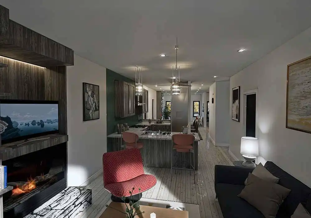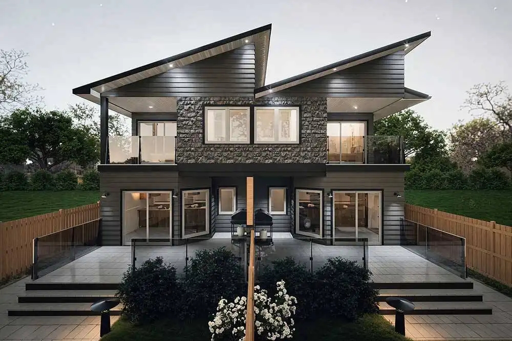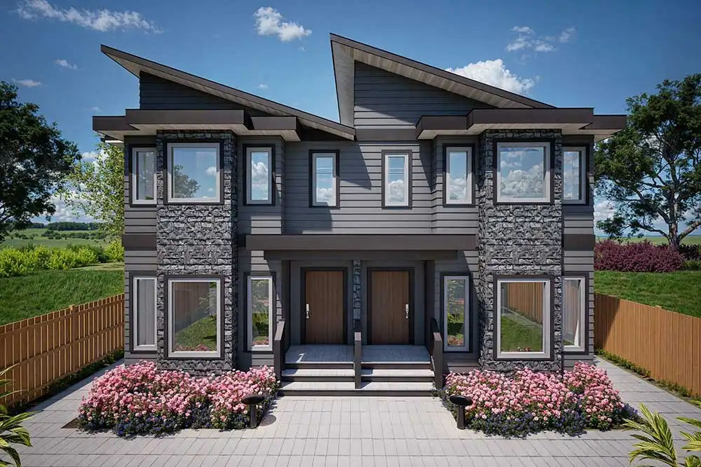 House Plan 10623 offers a balanced and practical duplex layout totaling 4,031 sq. ft., perfect for rental opportunities or shared living. Each side of the home features open-concept living on the main floor with a lounge, kitchen, dining area, family room, and private laundry space. Upstairs, one unit includes 3 bedrooms, including a vaulted primary suite with an en-suite bathroom and access to a private covered deck. The other unit features 2 bedrooms and a vaulted den. A shared gallery hall provides natural flow between rooms and easy access to additional bathrooms. Designed without garages, this plan prioritizes indoor comfort and maximized living areas. The rear porch on each side extends the entertaining space outdoors. Whether you're investing or living with extended family, House Plan 10623 offers versatility and charm.