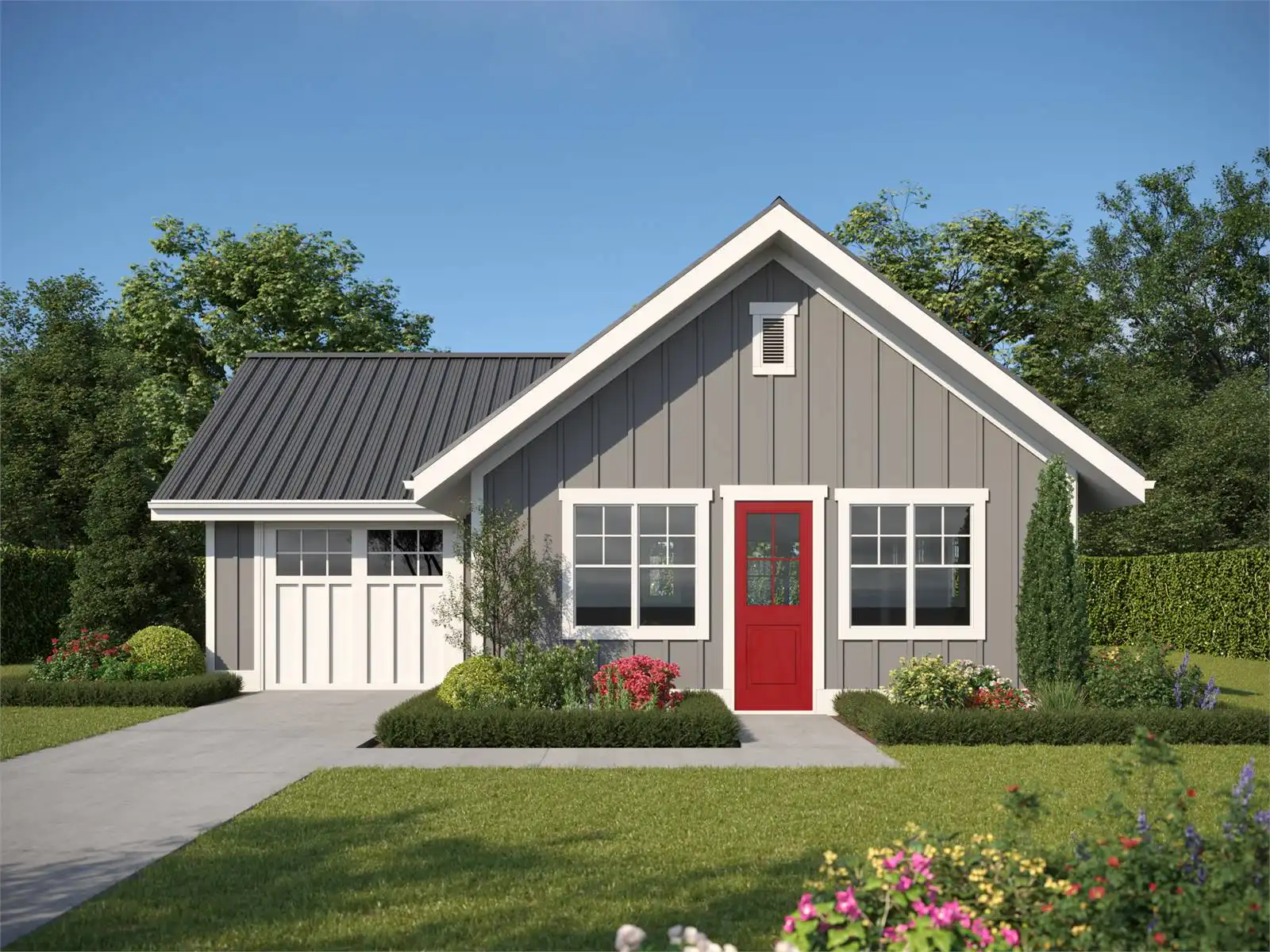 House Plan 10636 is a well-designed 745 sq. ft. modern cottage that delivers comfort and function in a small footprint. The open living area includes a cozy living room and a spacious eat-in kitchen ideal for casual meals and entertaining. The single bedroom offers privacy and convenience, with easy access to a full bath. Thoughtful details like a laundry area and direct access to the 1-car garage add efficiency to everyday life. The home's inviting façade features board and batten siding and a charming red front door, giving it undeniable curb appeal. Whether used as a full-time residence or a guest cottage, House Plan 10636 offers everything you need in a tidy and stylish package.