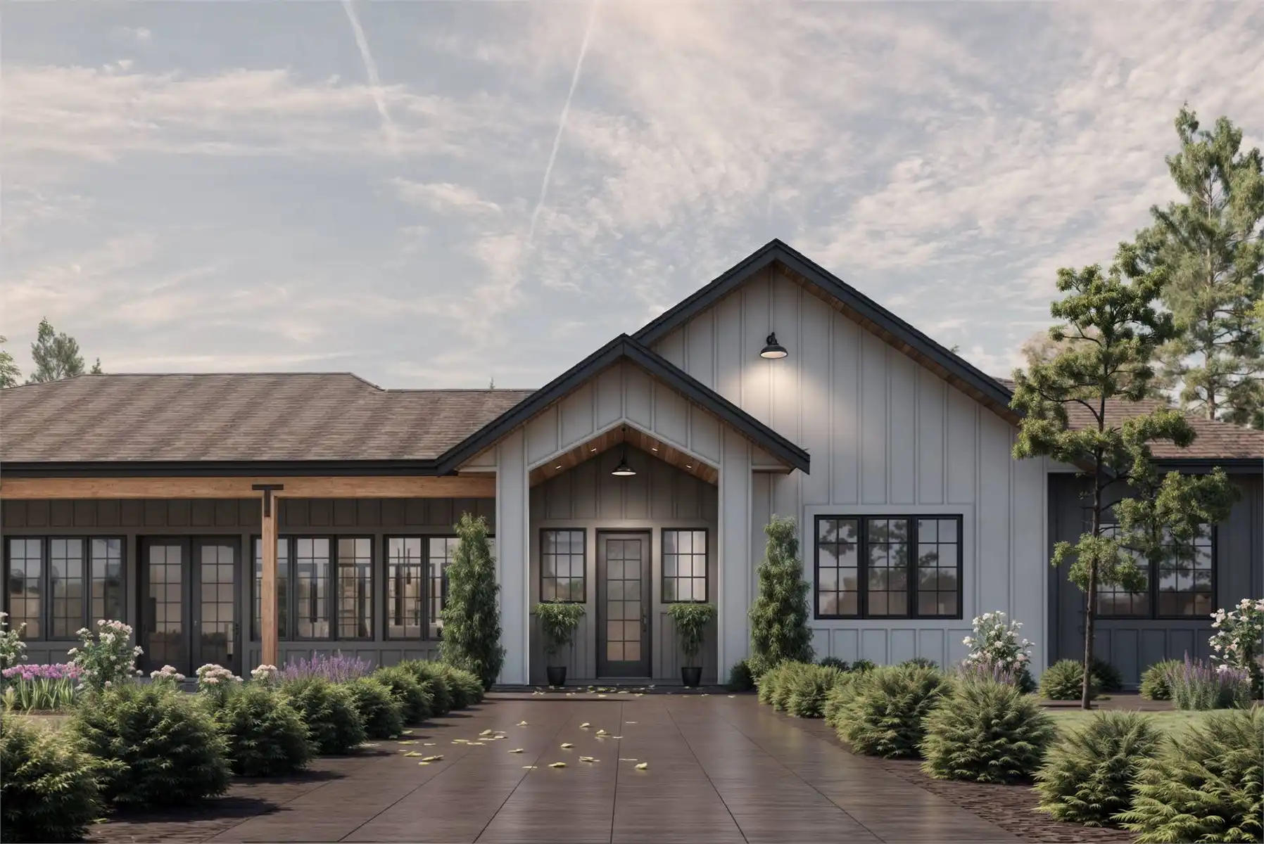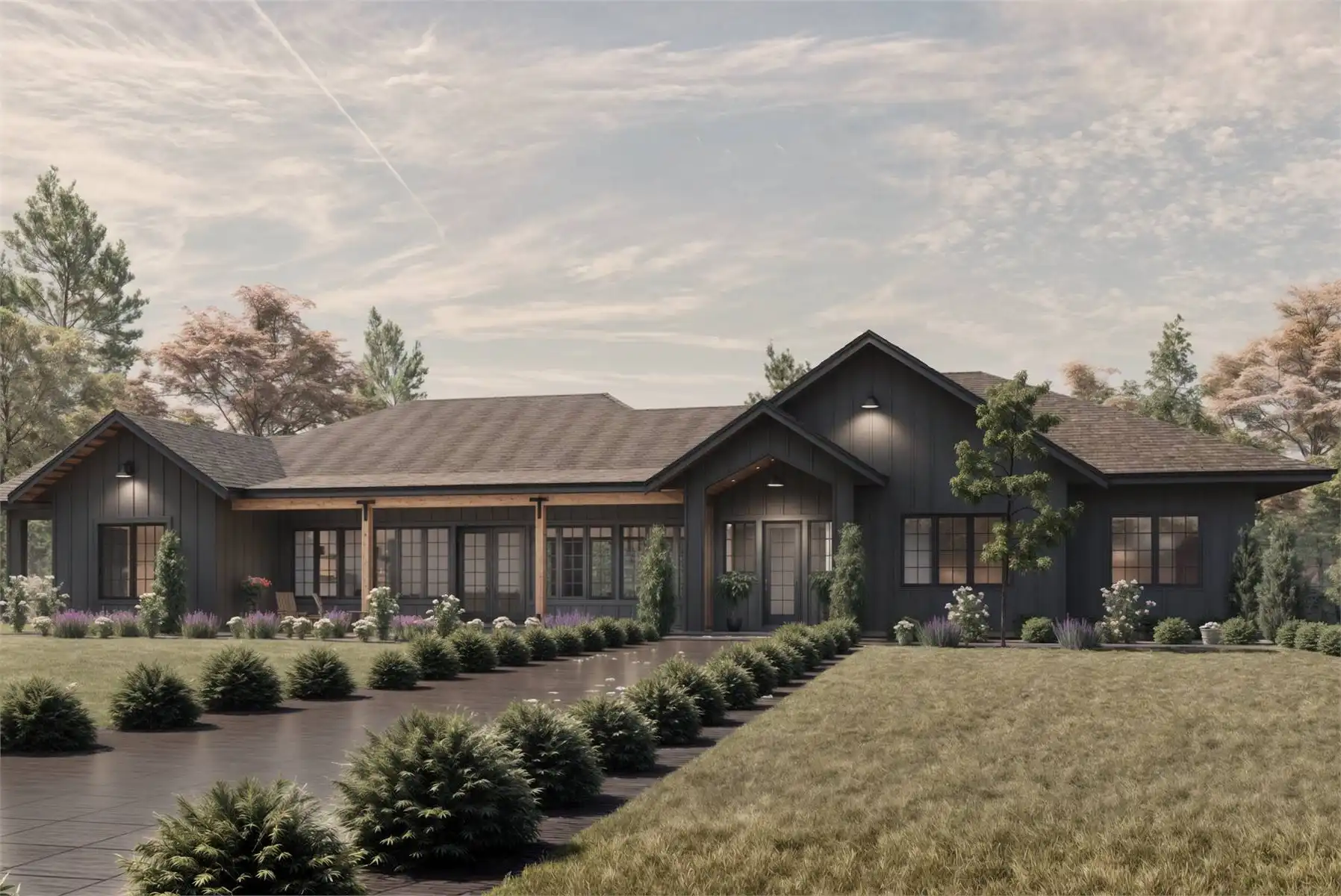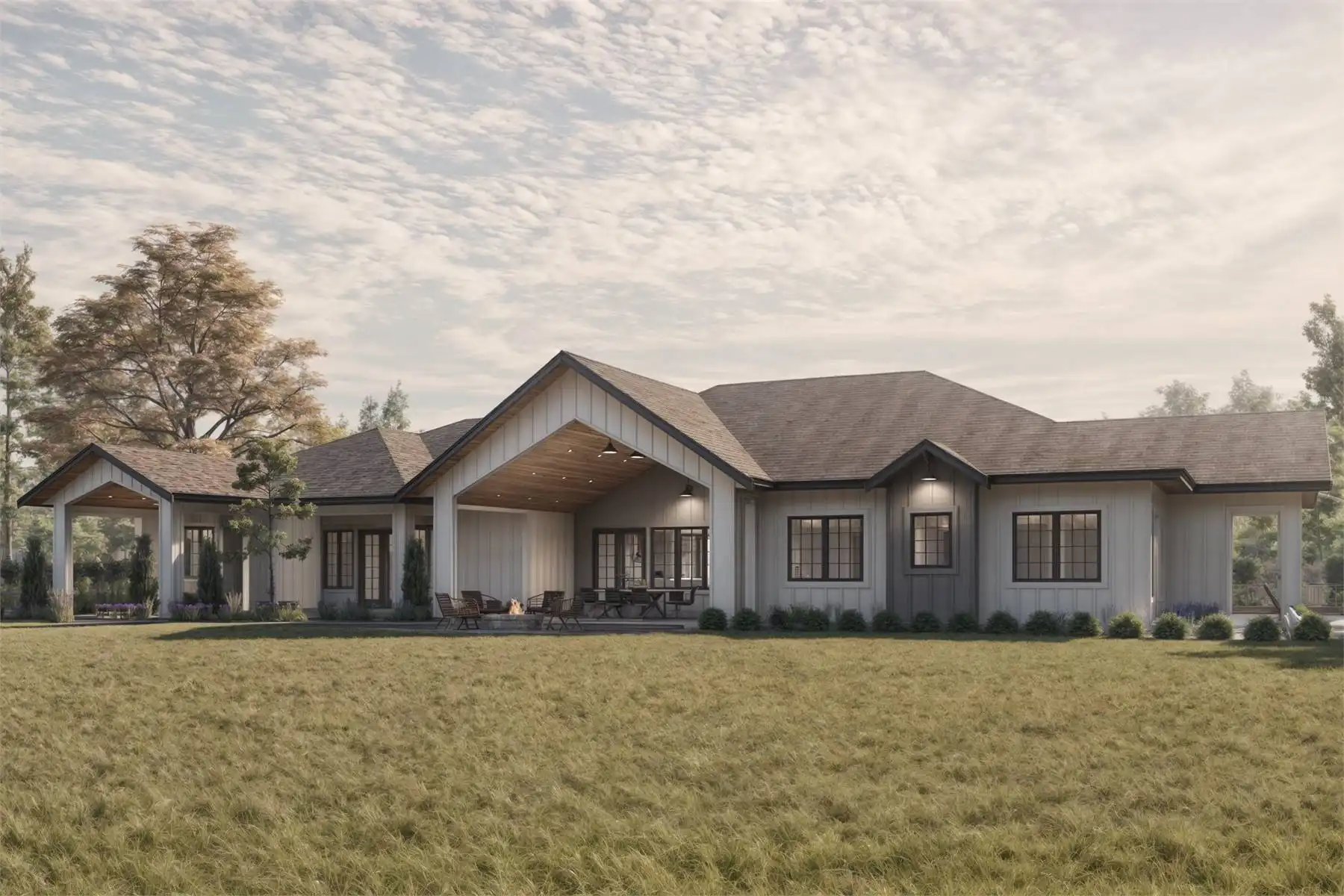House Plan 10645 is a gorgeous transitional ranch perfect for the whole family! The design includes 2,933 square feet with three or four bedrooms and three-and-a-half baths split around the totally open-concept great room with a cathedral ceiling and tons of windows. The gathering space in the middle is sure to appeal with its island kitchen, cozy fireplace, and access to extensive outdoor living areas. The primary suite offers luxury and privacy behind the two-car garage. Just look at the layout of that five-piece bath! Two other bedrooms share a hall bath on the opposite side of the house, while the final potential bedroom would make a wonderful in-law studio with comfortable living/sleeping space, a full bath, and a kitchenette. Make sure to look at the floor plans to appreciate what else this home provides, from the office, to the foyer, to the mudroom!