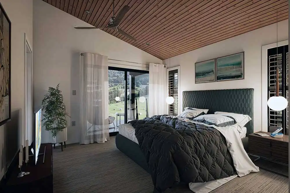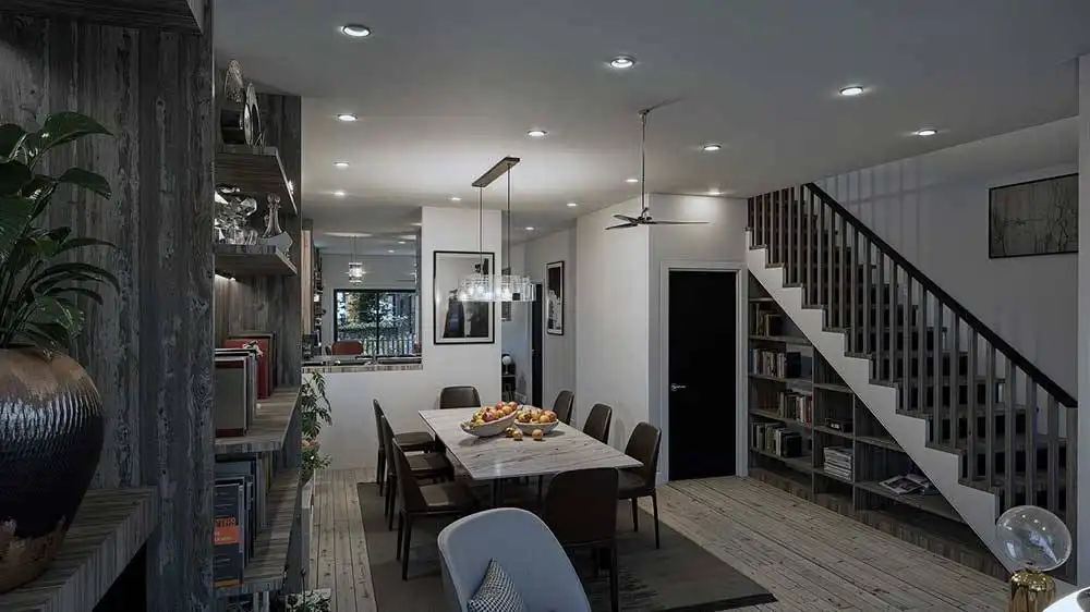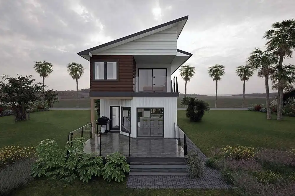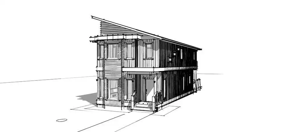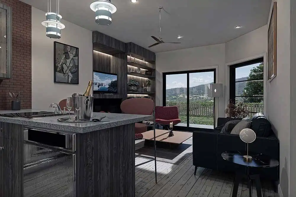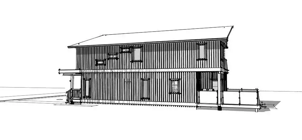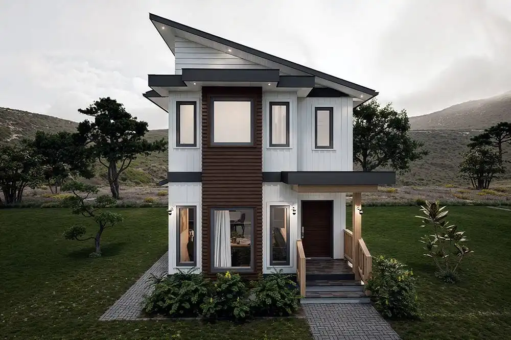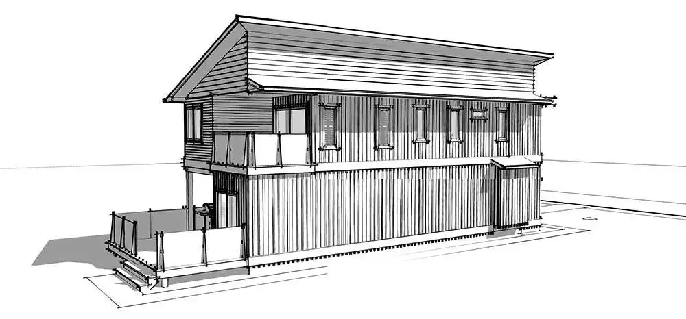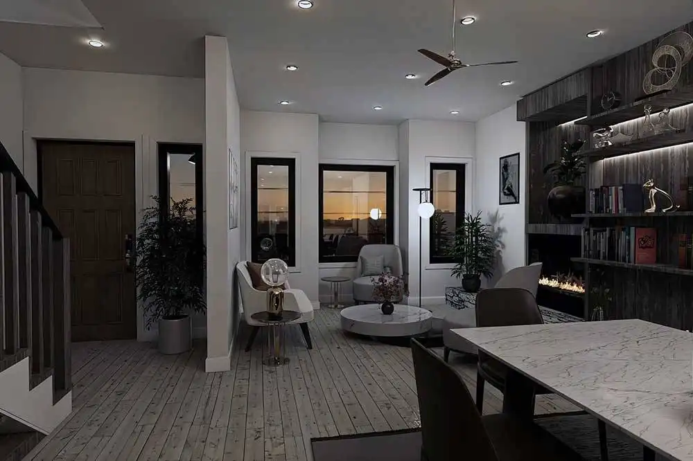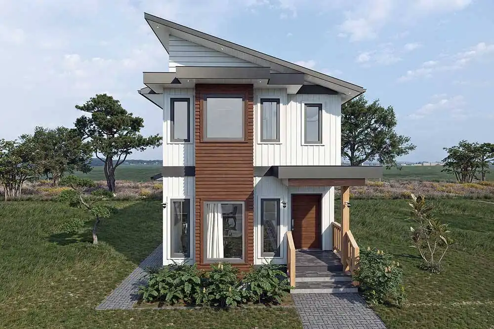 House Plan 10647 is a narrow two-story modern home that can help you make the most of a tight lot! It offers 1,790 square feet, three bedrooms, and two-and-a-half bathrooms, so it's up to the task of family living despite its limited width. Step inside and the lounge with a fireplace invites you to relax first, then the dining area, peninsula kitchen, and family room line up farther inside. The powder room and laundry are also located on the main level. All the bedrooms are upstairs and include two that share a hall bath and a primary suite with a five-piece bath and its own deck.