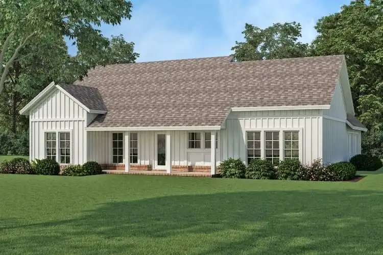House Plan 10653 is a lovely little cottage with 1,512 square feet, three bedrooms, and two bathrooms on one level. The layout places the common spaces in the middle while the bedrooms are split around them. The island kitchen is open to the living area as well as the dining room, which has a vaulted ceiling above for definition, to maximize the feel of the space. The primary suite on one side has a five-piece bath while the other bedrooms across the house share a three-piece bath. A two-car garage in front with side entry rounds out this design.