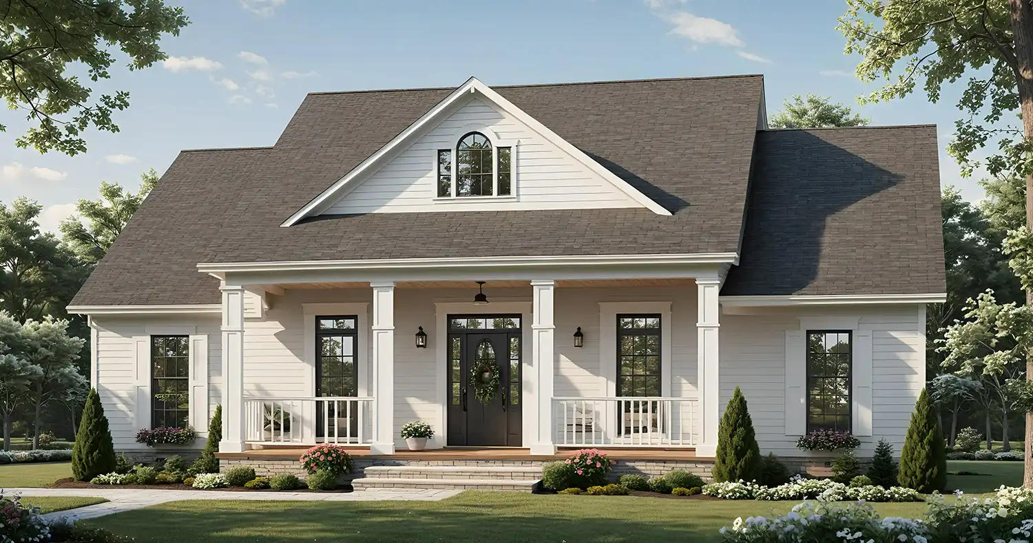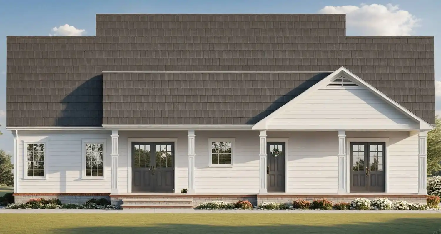 House Plan 10660 offers 1,640 square feet of well-planned one-story living with 3 bedrooms, 2 bathrooms, and a split-bedroom layout for added privacy. The home opens with a covered front porch and a vaulted great room complete with a fireplace, flowing into an L-shaped kitchen with an island and adjacent dining space. Glass doors extend the living area to a covered rear porch, creating ideal indoor-outdoor flow. The primary suite is privately located on the right and features a roomy ensuite and generous walk-in closet. Two secondary bedrooms and a full bath are situated on the opposite side of the home. A central laundry room and easy access to the two-car carport complete this inviting and functional floor plan.