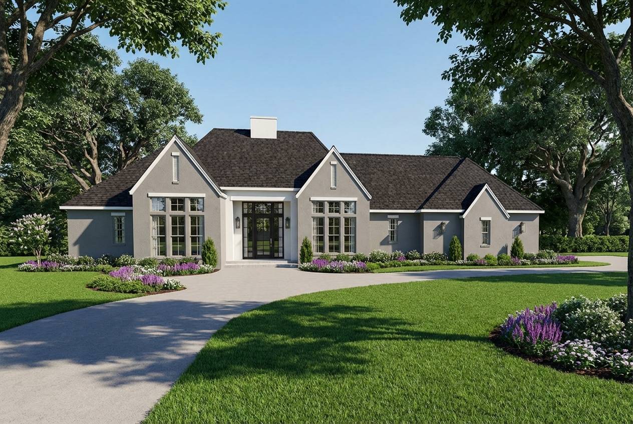 House Plan 10667 is a stunning midsize transitional ranch! It offers 2,477 square feet with three split bedrooms and two-and-a-half bathrooms. The floor plan features a great room in the middle, with a dining area off the foyer, a U-shaped kitchen, and a vaulted ceiling over the living area with a fireplace. Off one side of the foyer, there's a hallway with two bedrooms, a hall bath, and a study. In the hallway off the kitchen, you'll find the luxurious five-piece primary suite, the laundry, and the door from the side-entry two-car garage. But that's not all! This home is made for outdoor living with a BBQ kitchen and an outdoor fireplace on the back porch!
