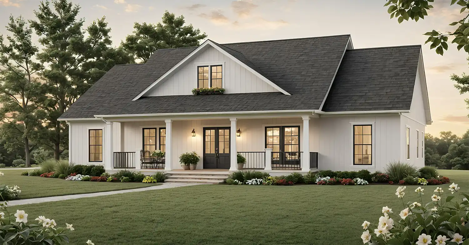 This thoughtfully designed 1,800 square foot home blends comfort and style across a single-level layout. Step onto the large front covered porch and into a vaulted great room that anchors the open living space. The L-shaped kitchen includes a central island and a dining nook with direct access to a generous rear covered porch, ideal for casual gatherings and outdoor meals. On one side, two secondary bedrooms share a full bath, while the opposite wing is dedicated to the private owner's suite. Enjoy a spacious walk-in closet, luxurious ensuite with soaker tub, dual vanities, and a quiet retreat feel. A rear-loading 2-car garage connects to the utility room and a handy half bath for everyday convenience.