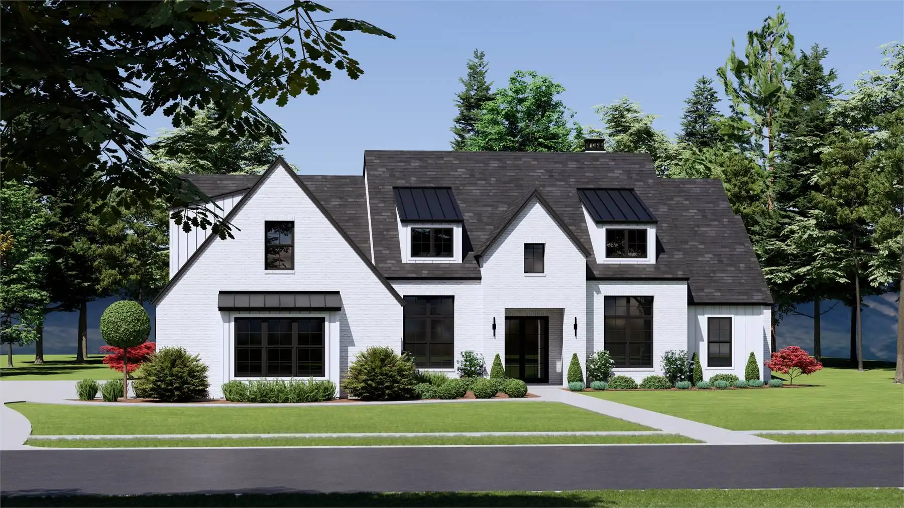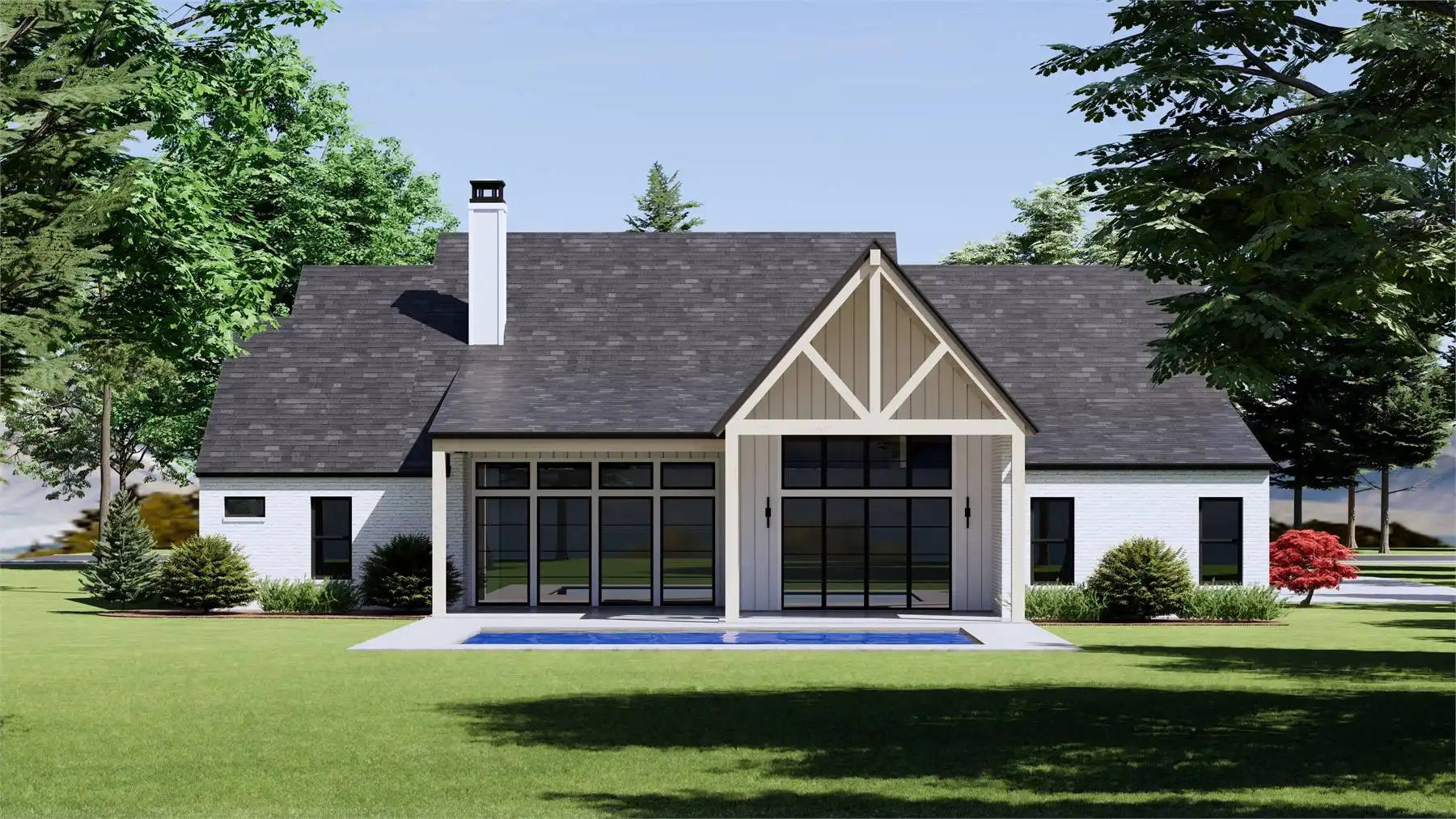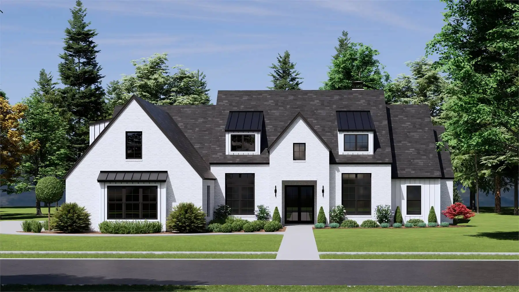House Plan 10678 is a beautifully designed 3,245 square foot home that blends modern comfort with everyday practicality. This one-story layout includes 4 bedrooms, 4.5 bathrooms, and a 3-car garage, all wrapped in a welcoming design that begins with a large covered front porch and a grand 12-foot foyer. Just off the entry, a dedicated home office offers a quiet workspace. The left wing houses three bedrooms, two full bathrooms—including a Jack and Jill—and a convenient half bath for guests. At the heart of the home, a vaulted great room with a stunning fireplace opens to a covered outdoor living space. The L-shaped kitchen features a generous island, an expansive walk-in pantry, and a dining area with views of the backyard. On the right wing, the private primary suite includes a spa-inspired ensuite with dual sinks, separate tub and shower, a huge walk-in closet, and direct access to the utility room and mudroom for smart, everyday ease.