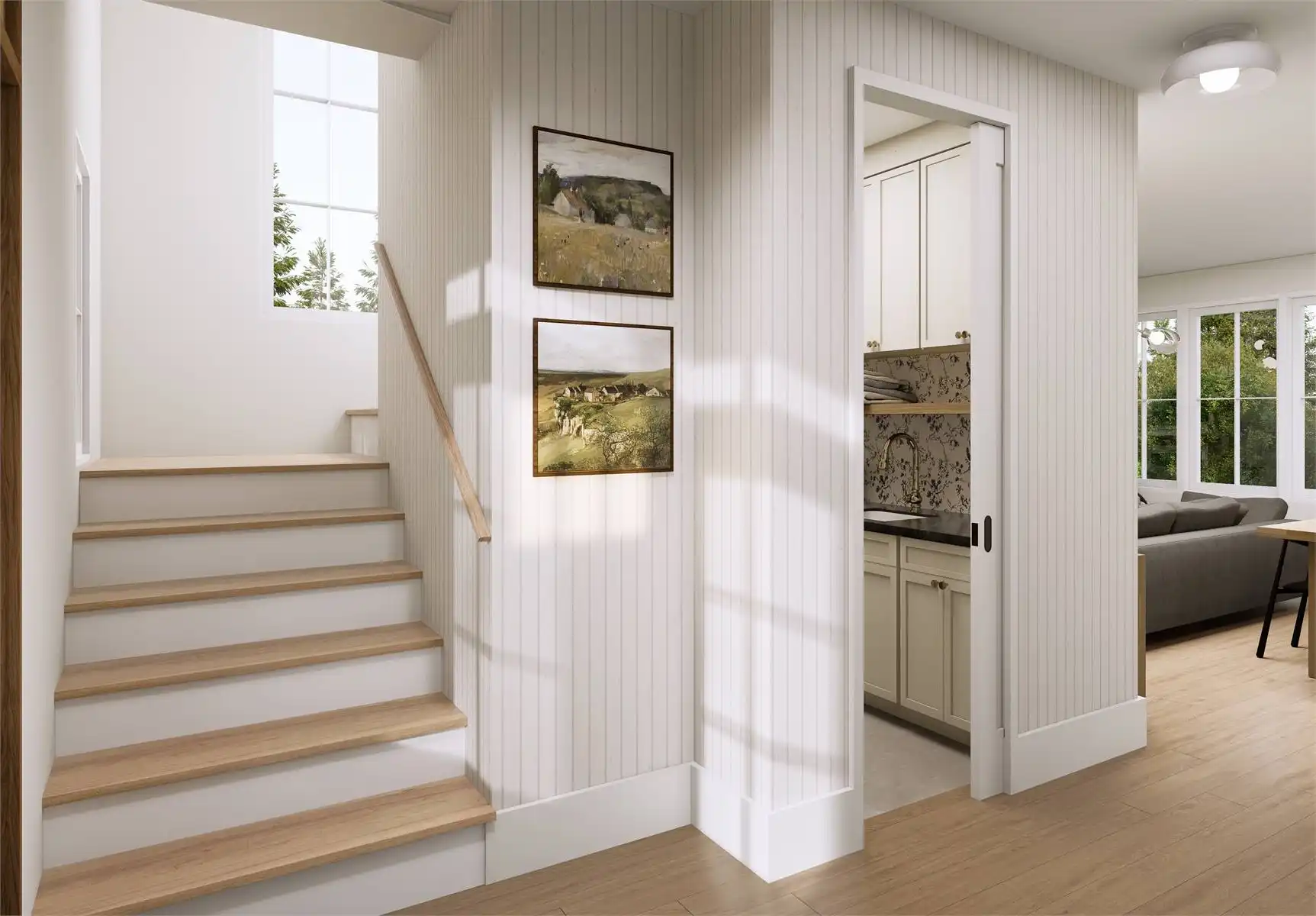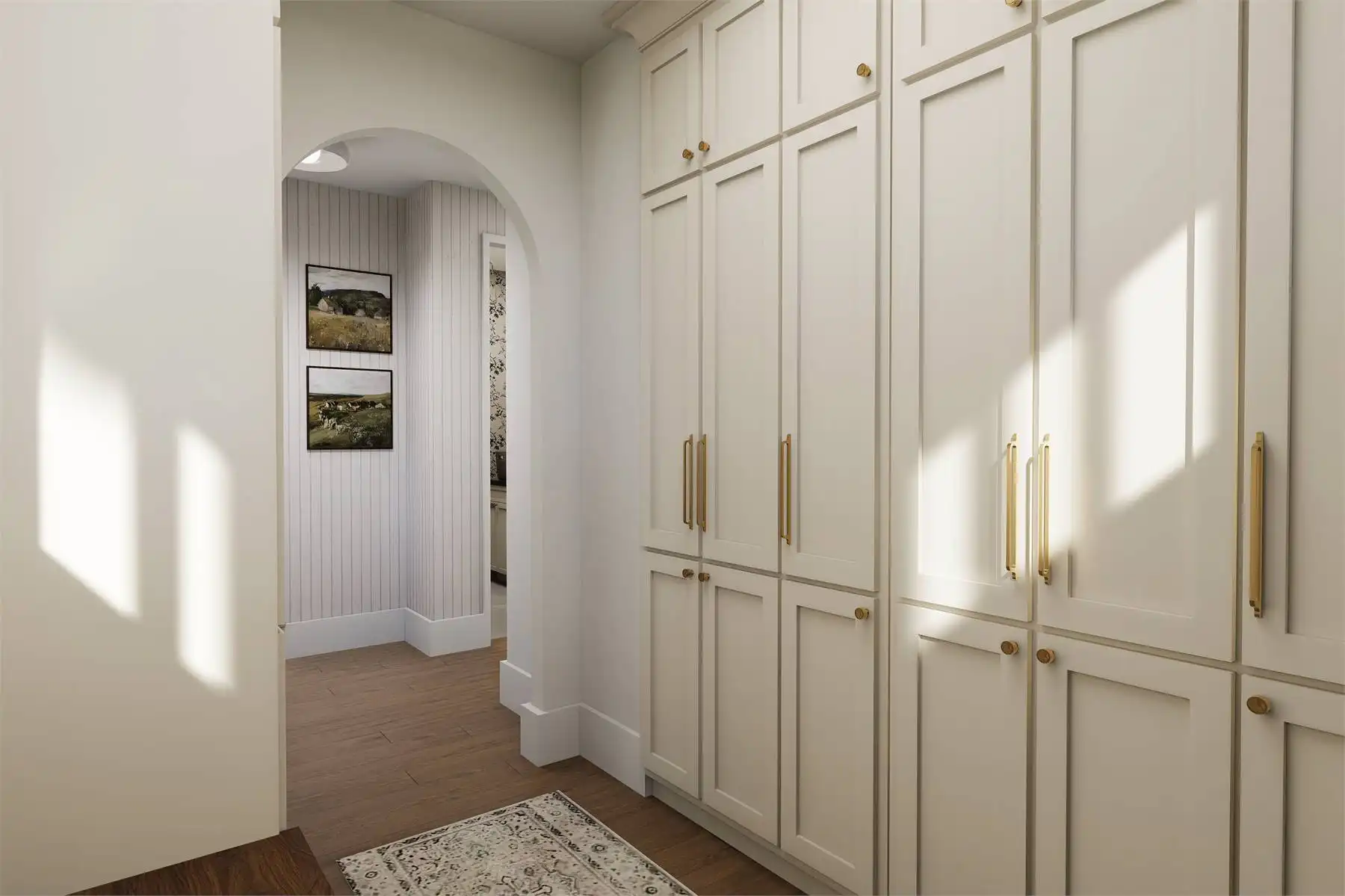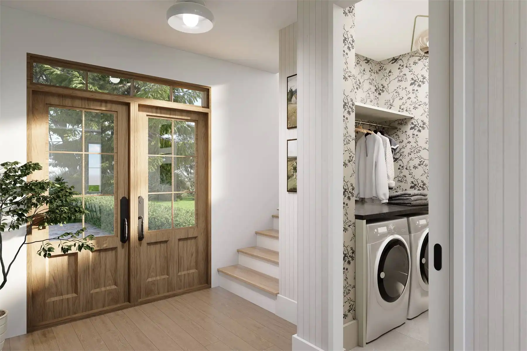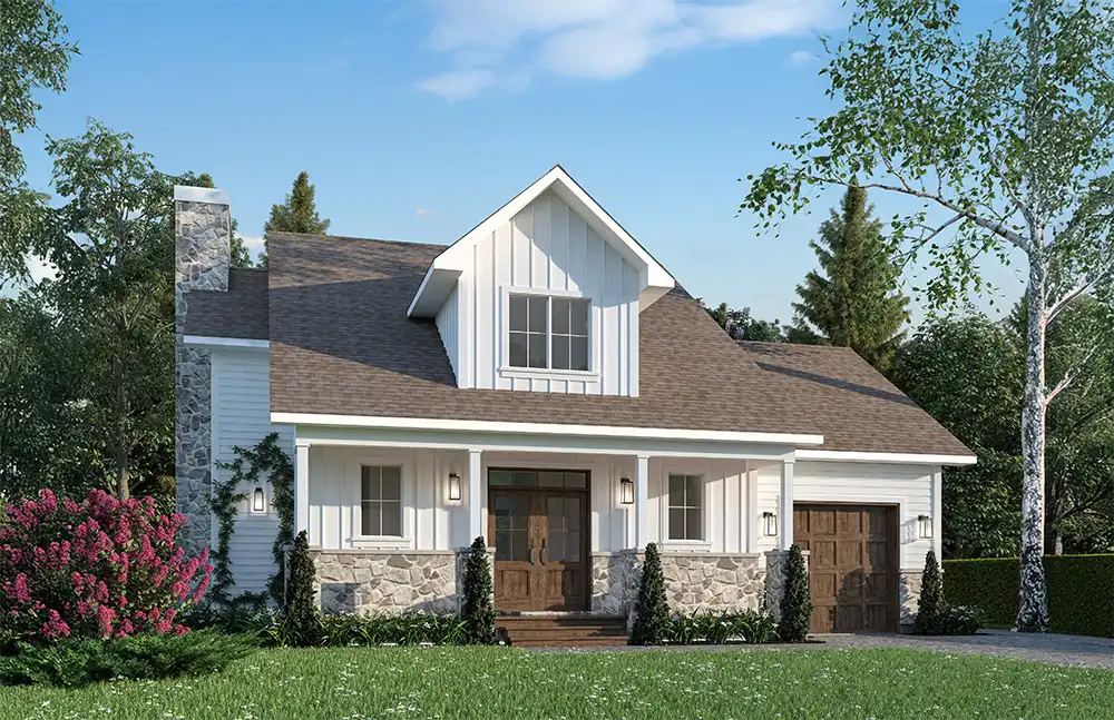 House Plan 10689 is a thoughtful two-story cottage with an amazing layout for a growing family. It offers 1,622 square feet with three bedrooms and two-and-a-half baths as well as a one-car garage on the side. The main floor places the foyer and mudroom in front, the powder room and laundry room in the middle, and the great room in back. Check out that open-concept floor plan from the island kitchen through the dining and living areas! All the bedrooms are grouped upstairs, with the primary suite boasting a private four-piece bath and the other two bedrooms sharing a divided four-piece hall bath. This home is compact and checks all the boxes!
